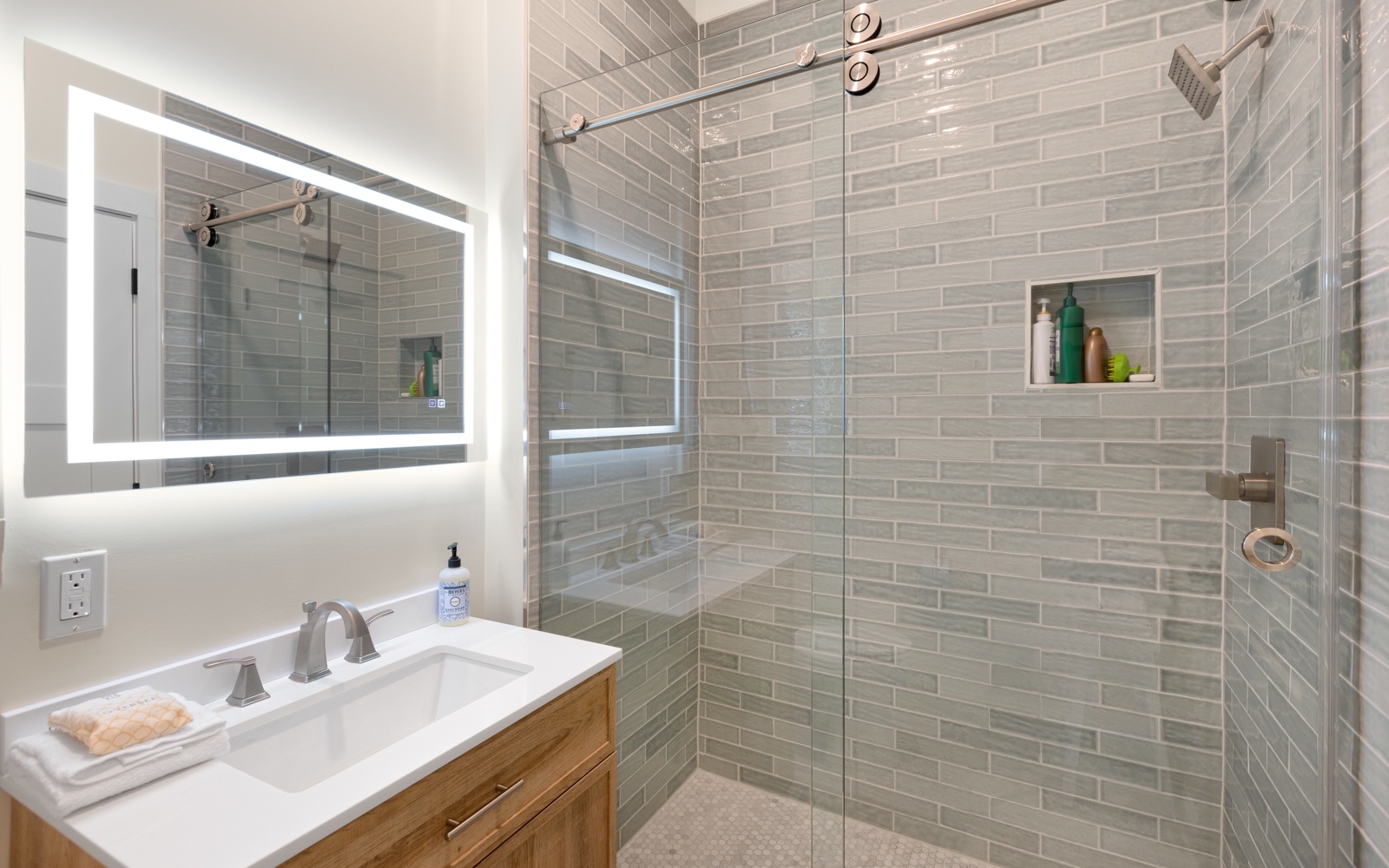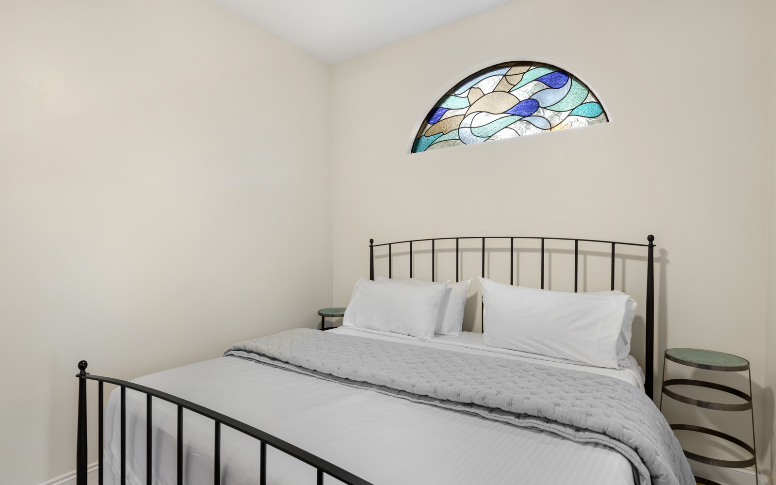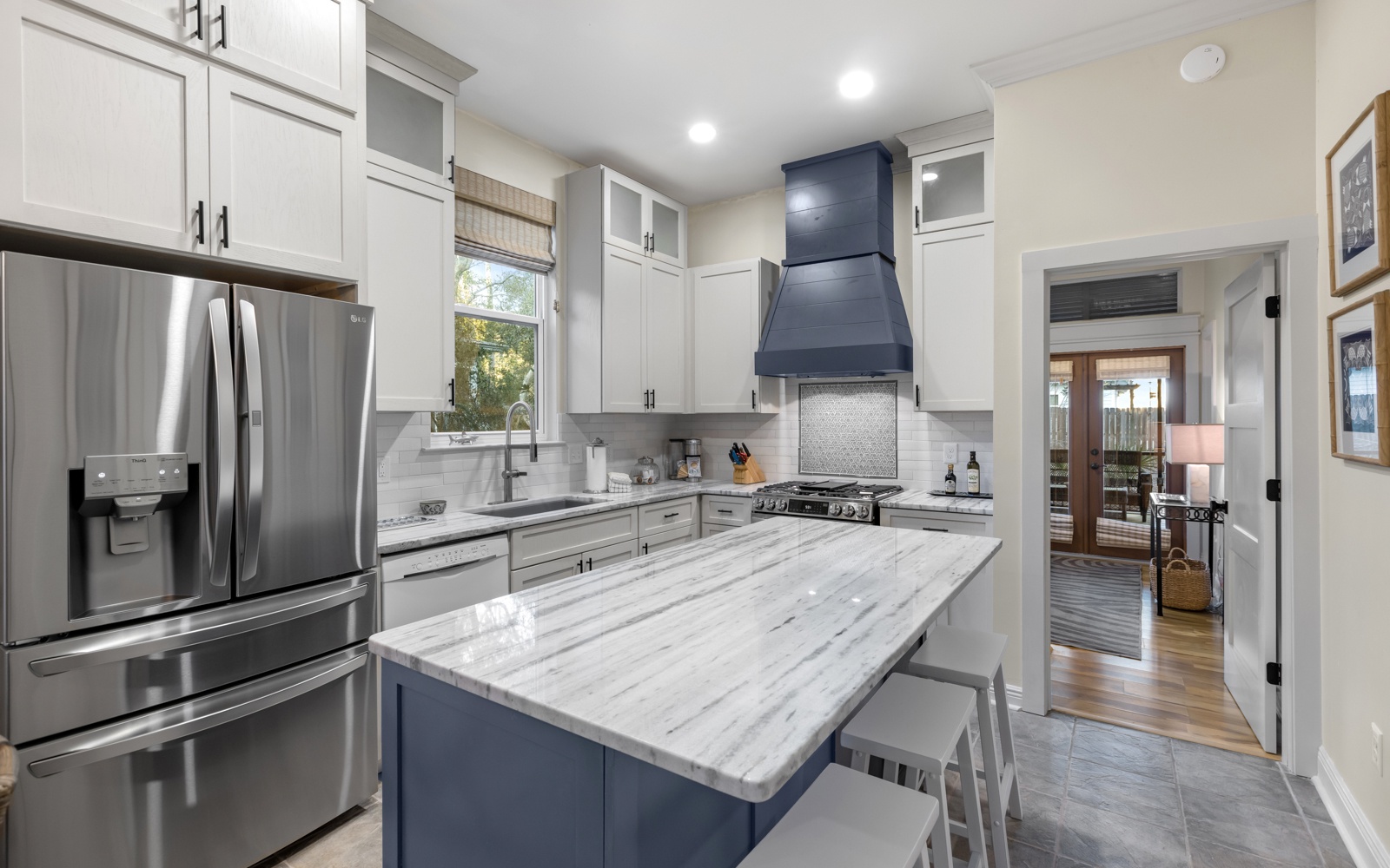 The first-floor guest room, with king bed, private bath, and custom-tiled walk-in shower, opens onto a unique and cozy screened-in porch.