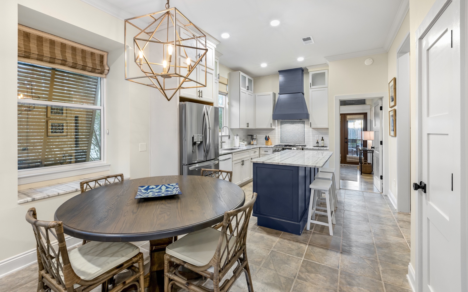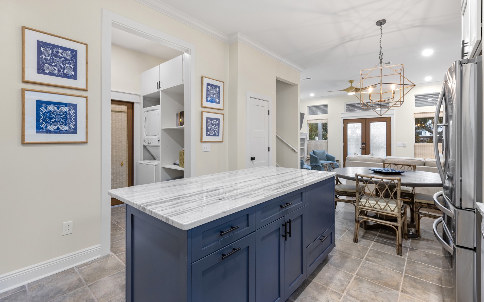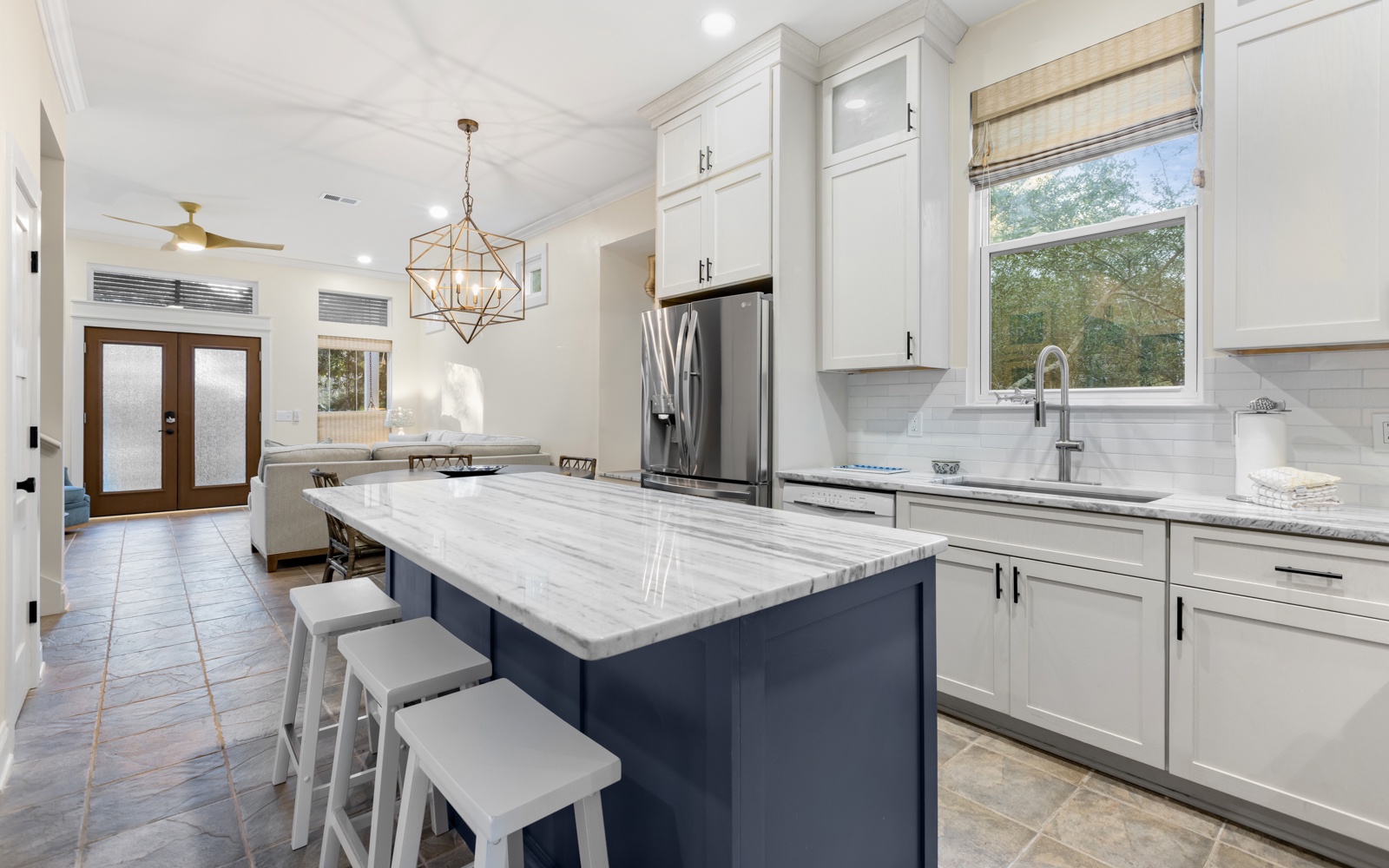 The living and kitchen area is bright, inviting, and ideal for unwinding after a day in the sun. With seating for seven at the breakfast bar and dining table, it’s great for morning coffee, post-beach snacks, and everything in between.