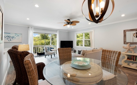 The first floor is open and bright. A living space that’s made for lounging, a dining table that’s great for card games or takeout nights, and a fully stocked kitchen when you feel like cooking. The space flows out to a private balcony, a sweet spot for morning coffee or winding down with a glass of wine.