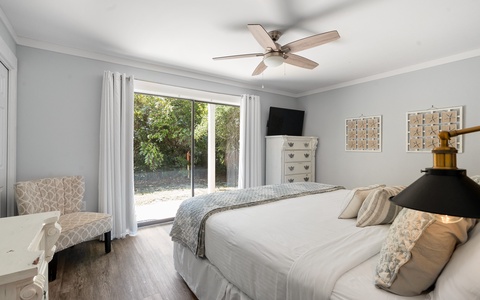 - Primary Bedroom: King bed, private en suite bath, walk-in closet, balcony, TV