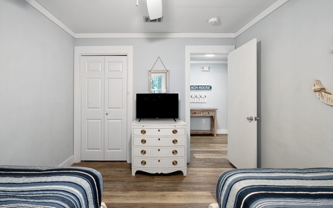 - Guest Bedroom: 2 full beds, hallway access to shared bath, TV