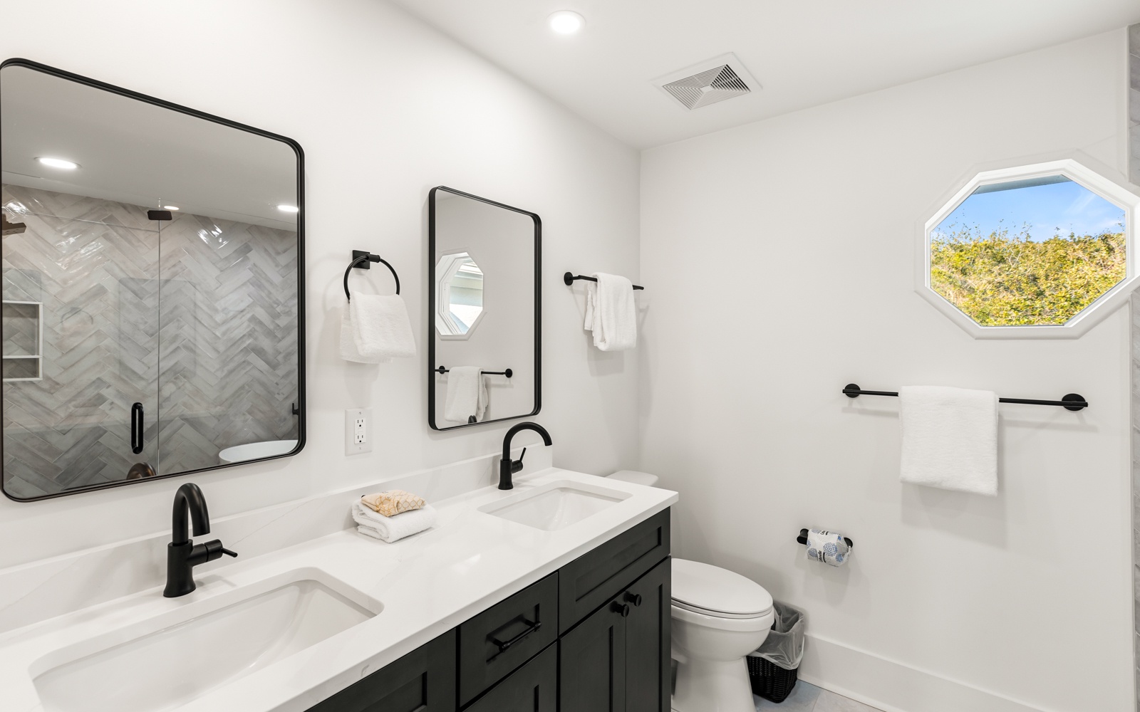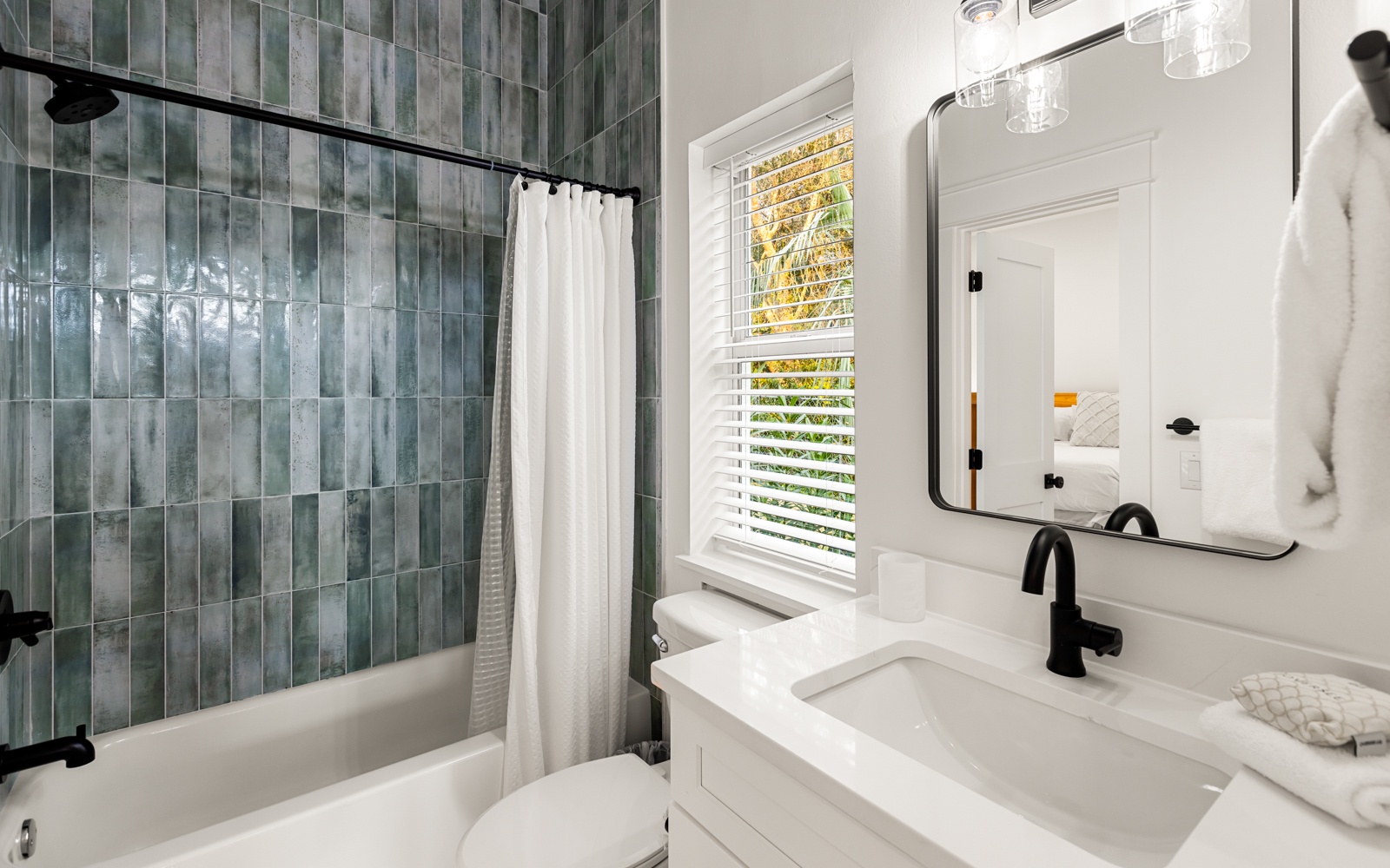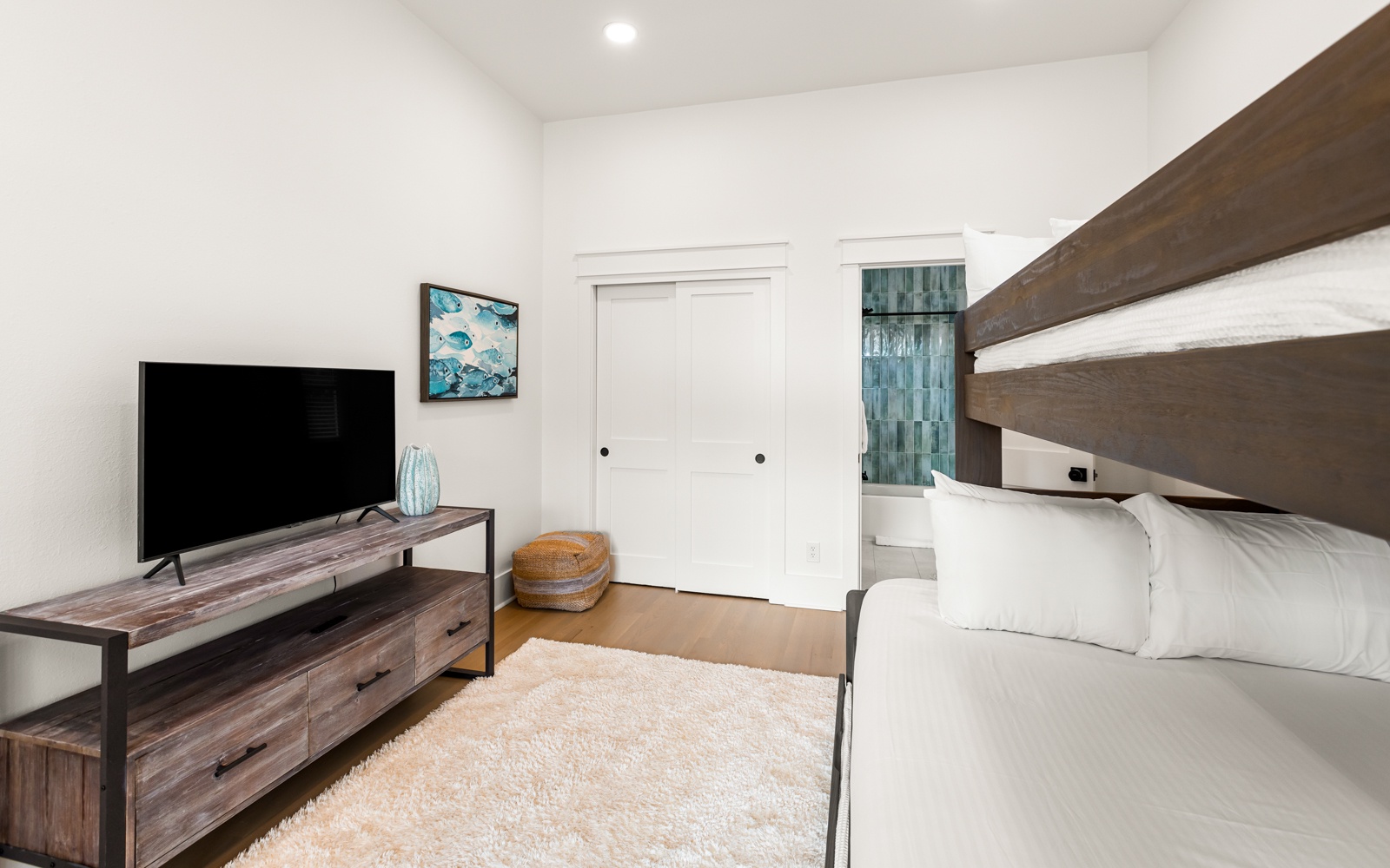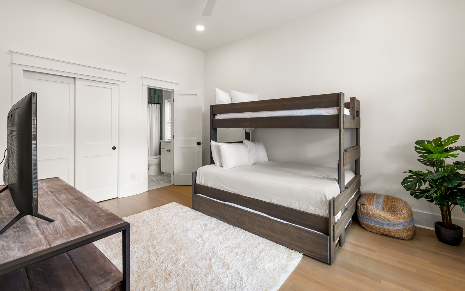 Guest Room: Twin-over-full bunk with twin trundle, shared bath with shower/tub combo