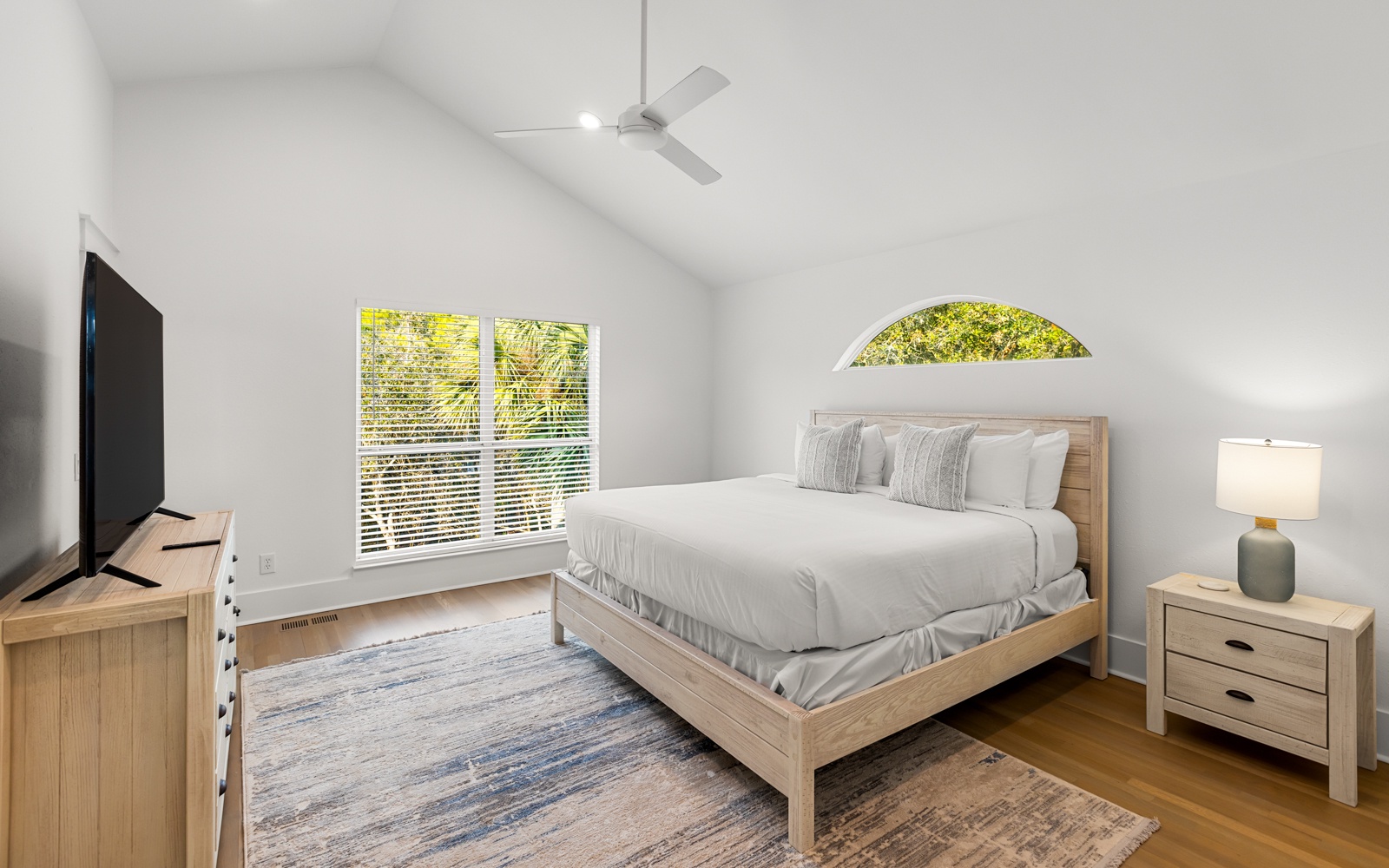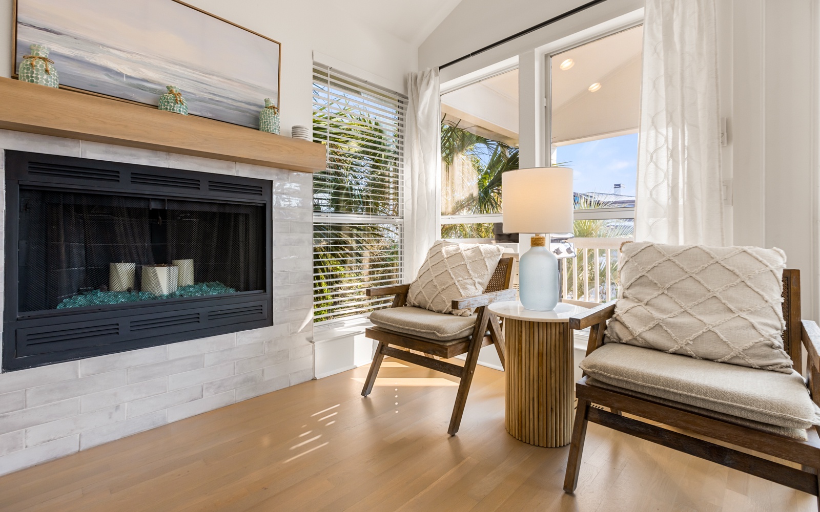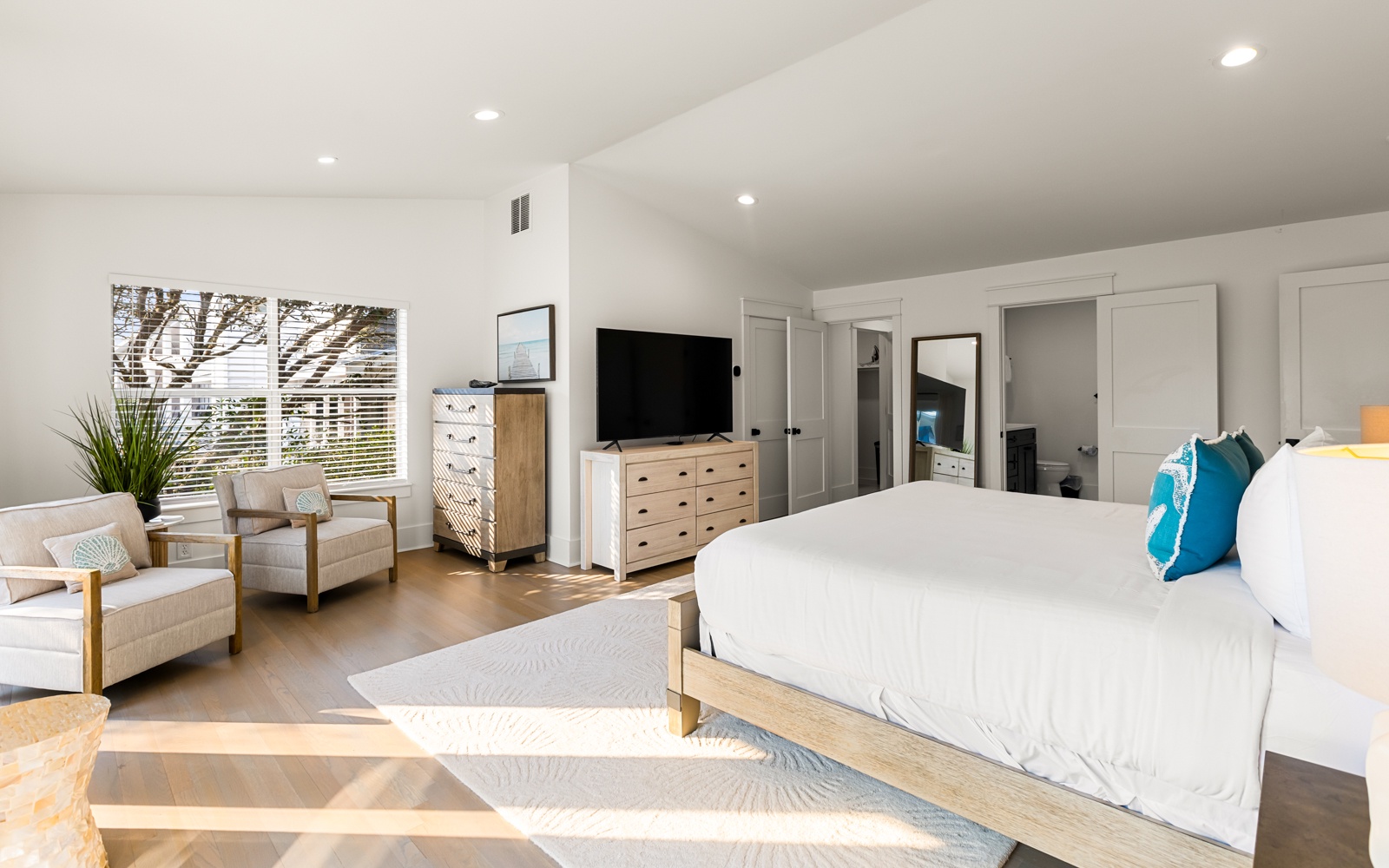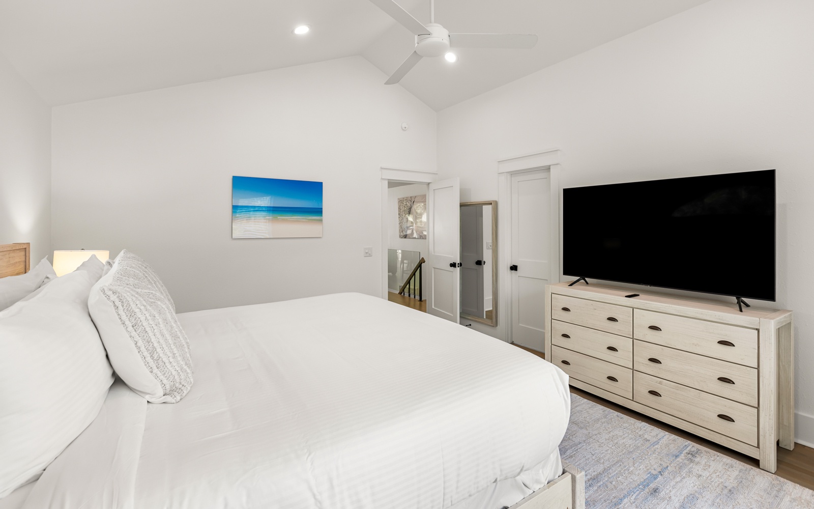 Upstairs, the primary suite includes a king bed, private balcony, and en-suite bath with a soaking tub. Here’s your invitation to relax! Another guest room has a king bed and a shared bath with a walk-in shower.