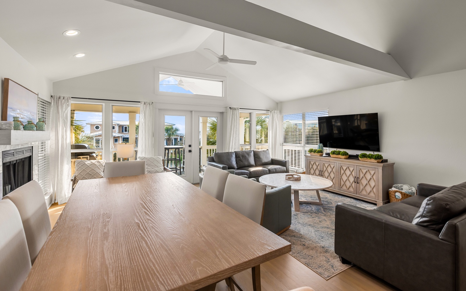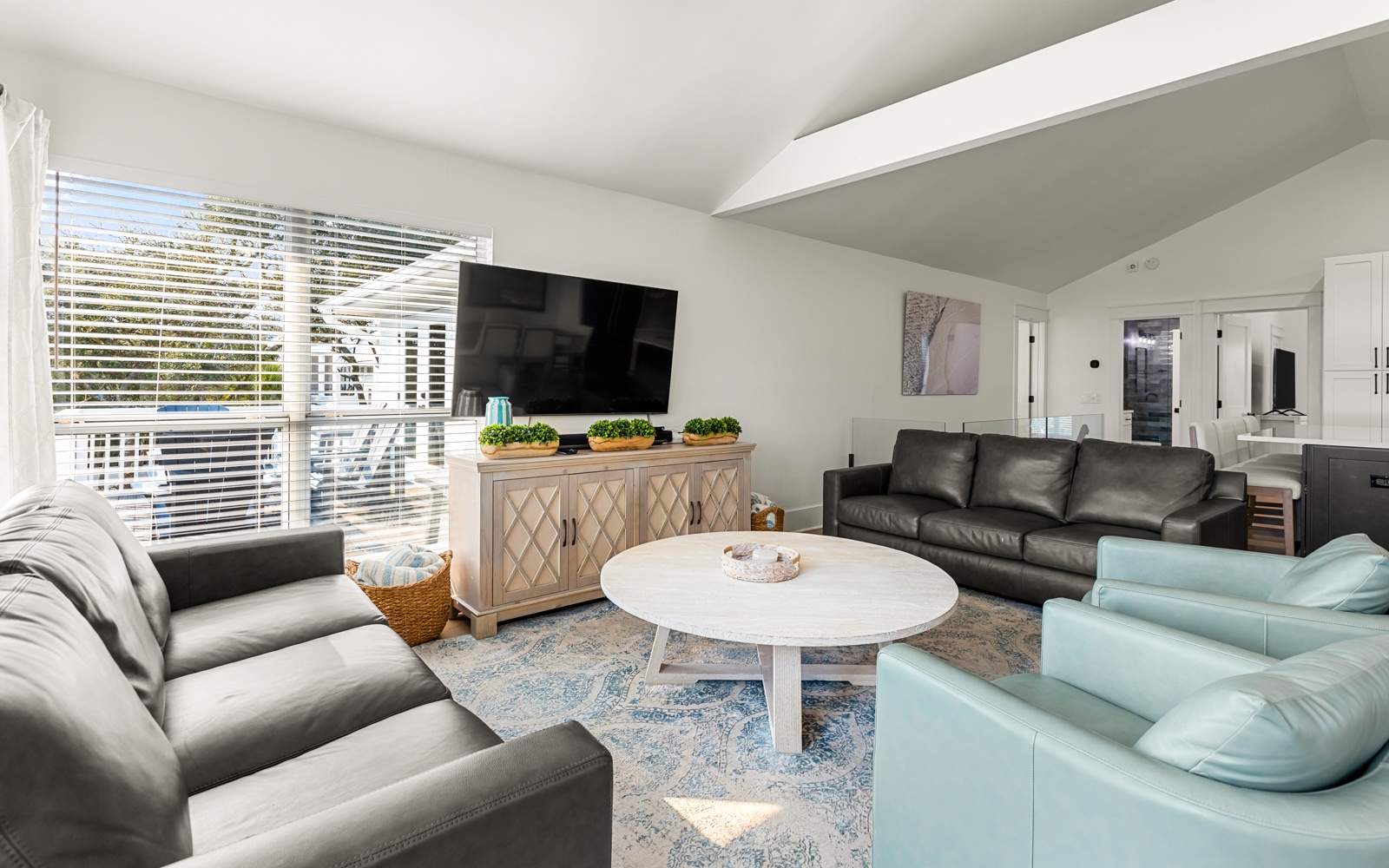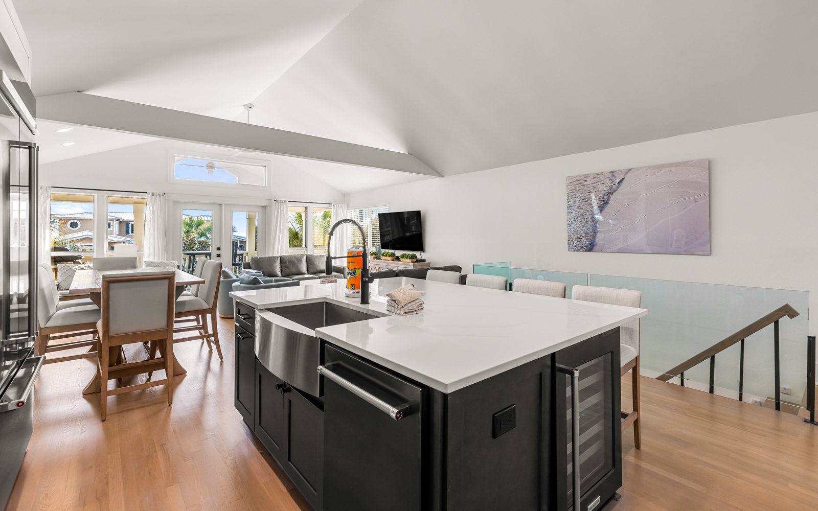 The living and kitchen area is bright, inviting, and ideal for unwinding after a day in the sun. With seating for ten at the breakfast bar and dining table, it’s great for morning coffee, post-beach snacks, and everything in between.