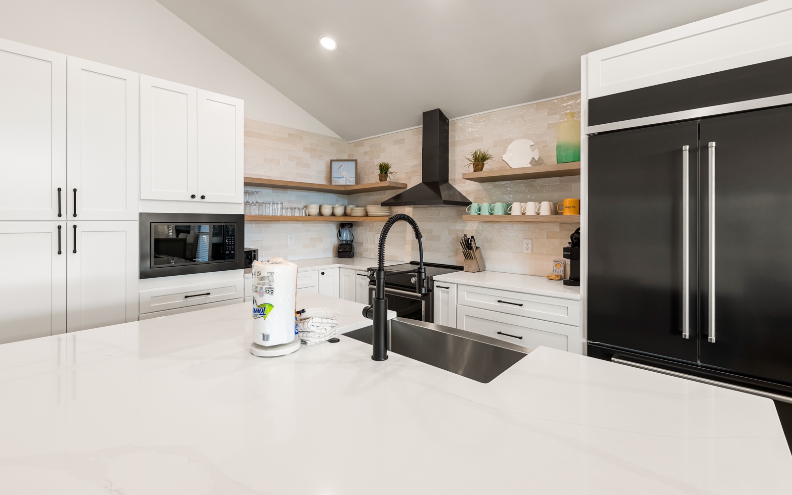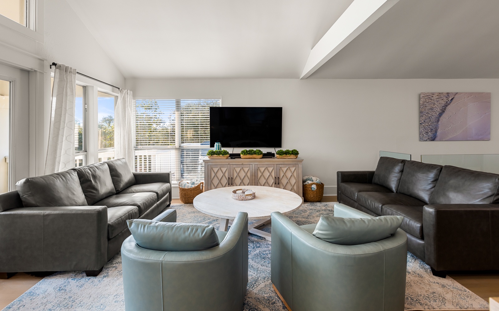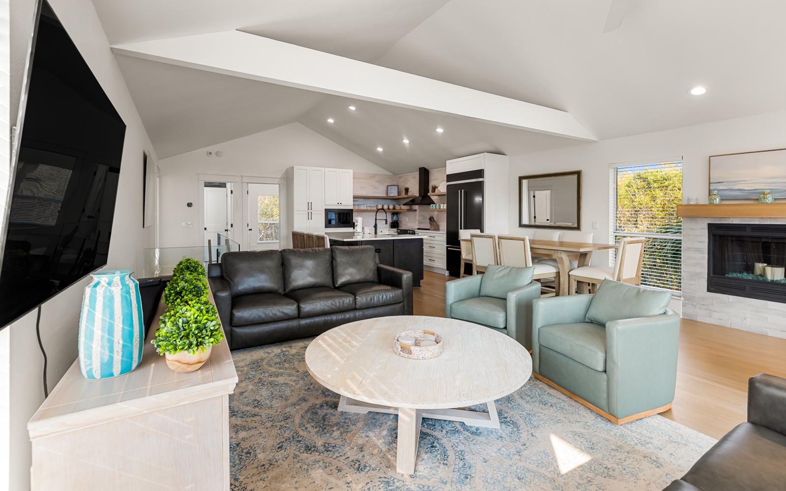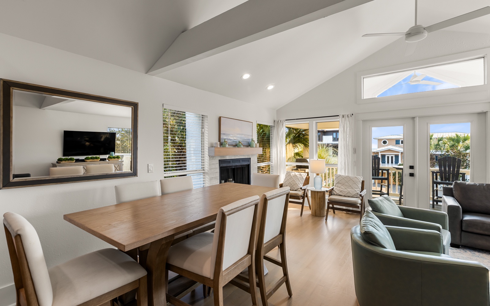 The living and kitchen area is bright, inviting, and ideal for unwinding after a day in the sun. With seating for ten at the breakfast bar and dining table, it’s great for morning coffee, post-beach snacks, and everything in between.