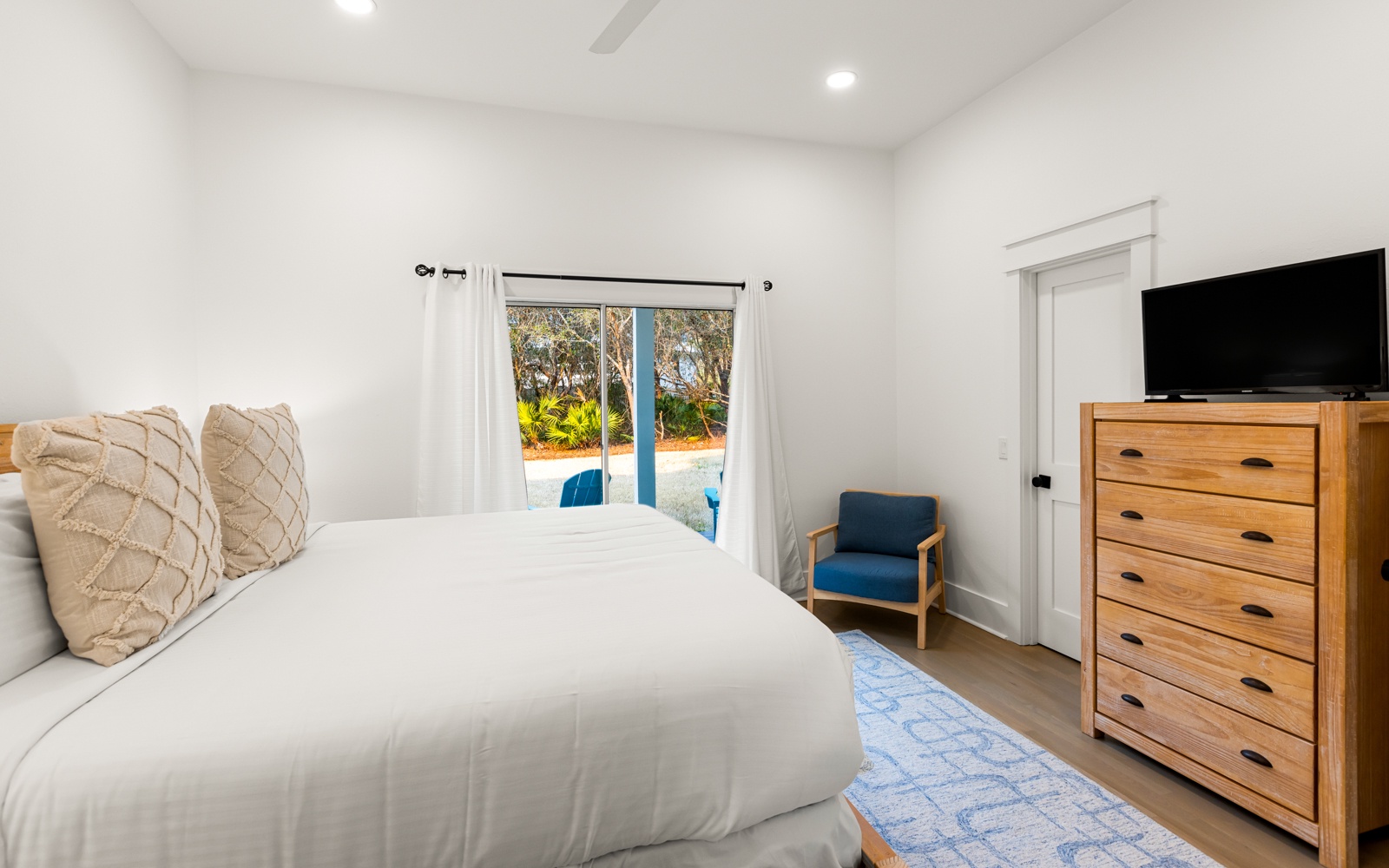 Guest Room: King bed, shared bath with shower/tub combo, private patio