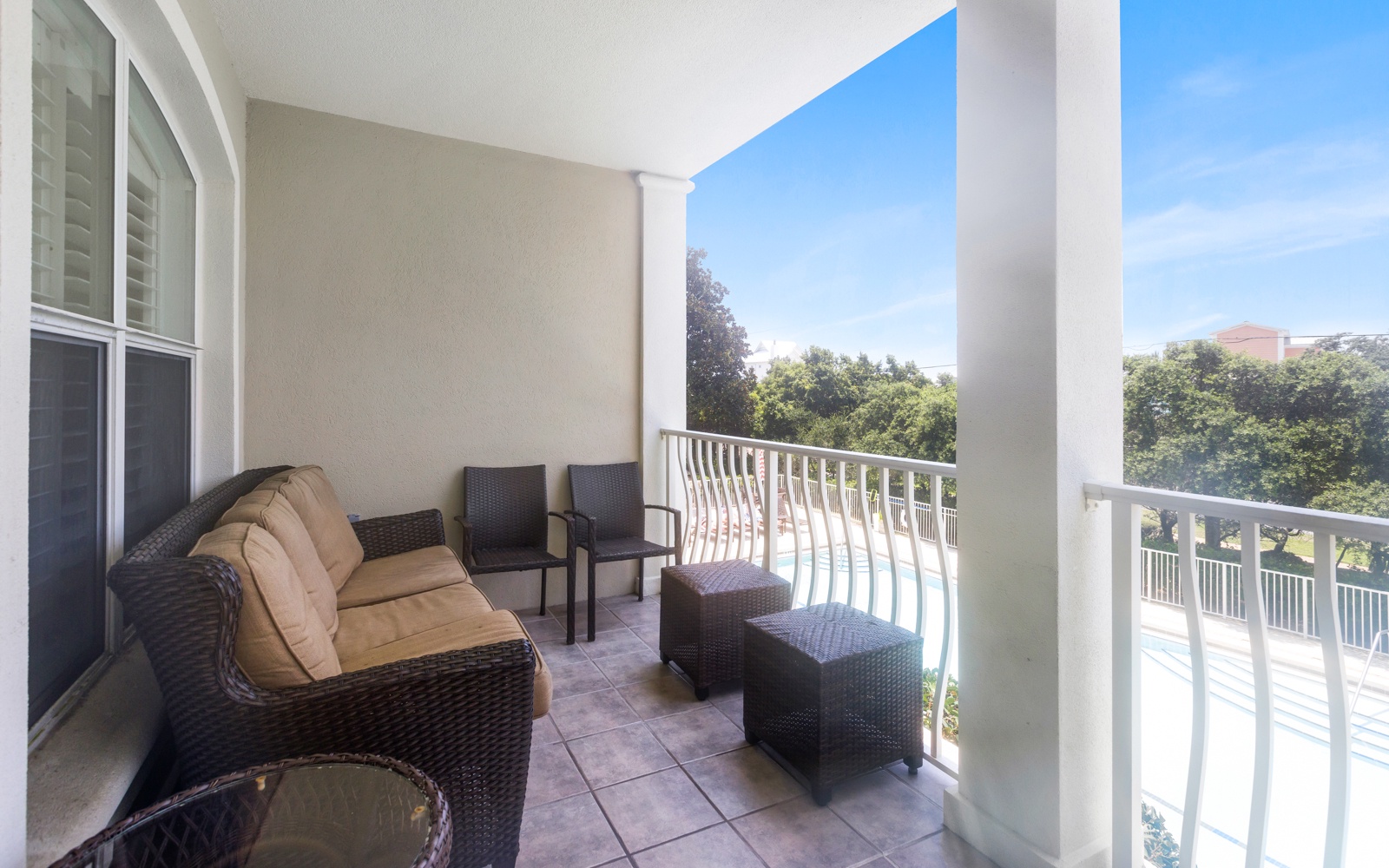 Inside, the spacious, 4BR/3BA vacation haven has ample room for all. The living area is a wonderful space, you’ve got to see this couch. Or is it a sofa? The delightful dining area and full kitchen are no less enchanting, and the comfy balcony overlooks the pool.