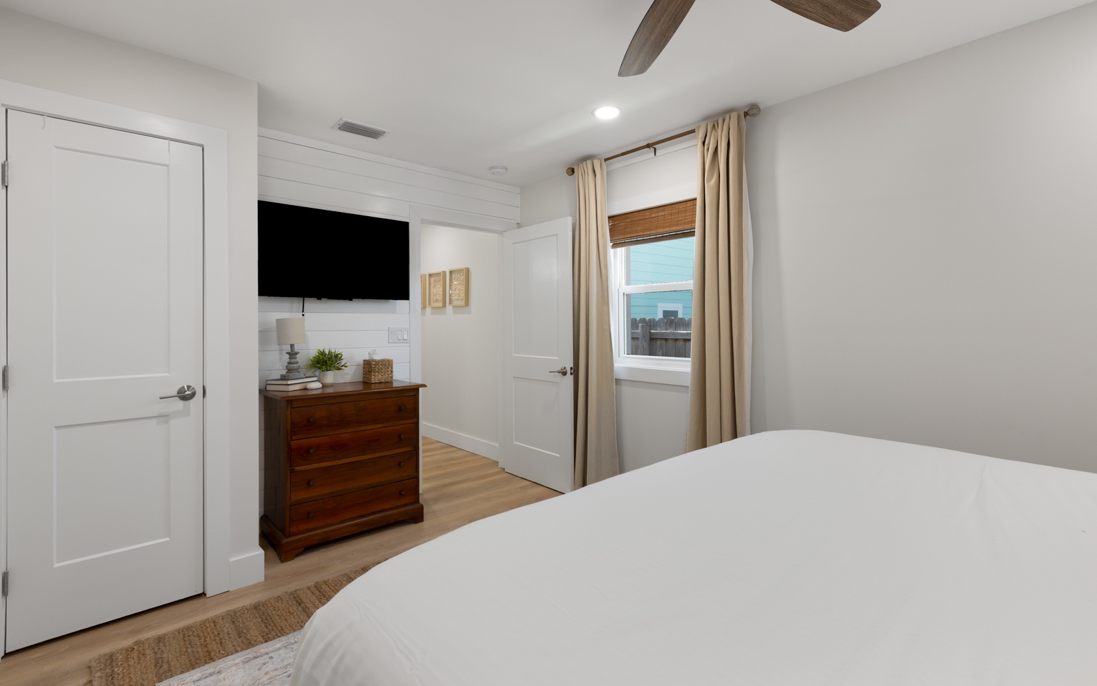 Seashellin’ makes slowing down feel natural. With cheerful blue shutters, a welcoming porch, and a quiet neighborhood vibe, this coastal cottage sets the tone for easy days from the start, even for dogs. Pet-friendly, the fenced backyard adds room for games, lounging, relaxed dinners, and lots of pooch-pampering. The outdoor shower feels oh-so-perfect after a long day at the beach.