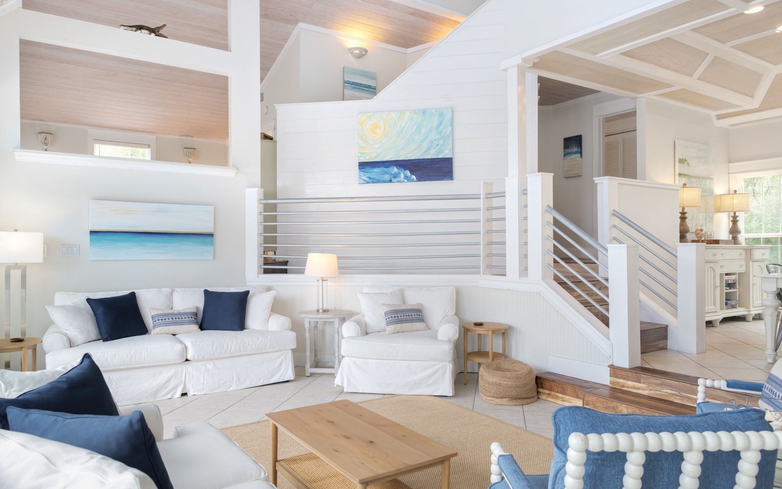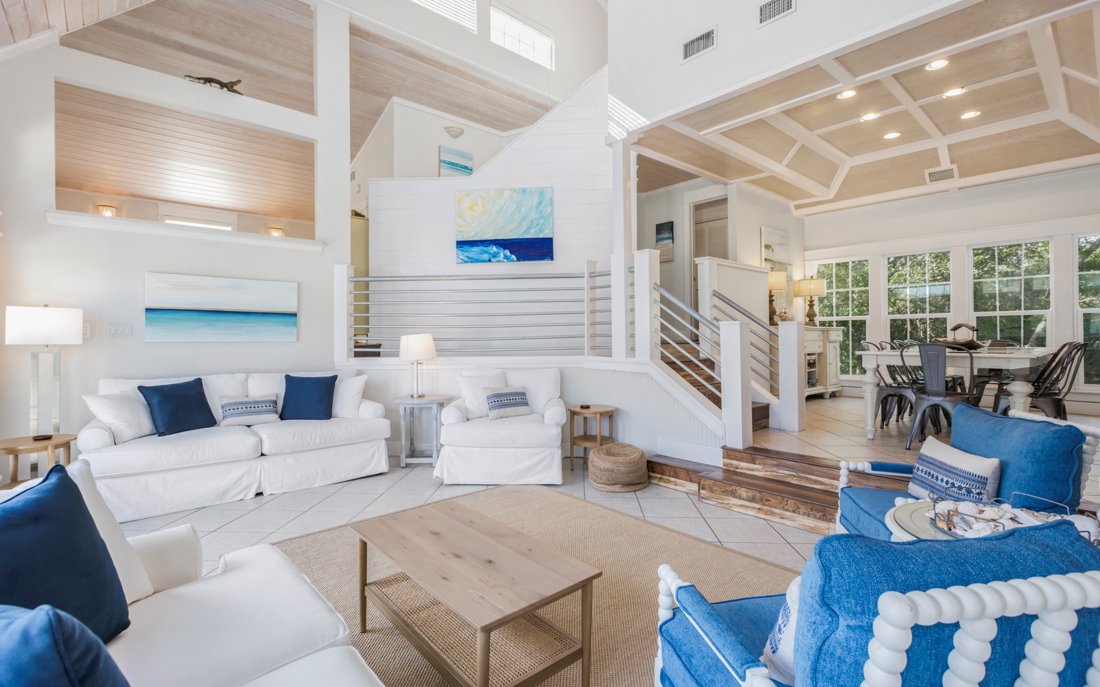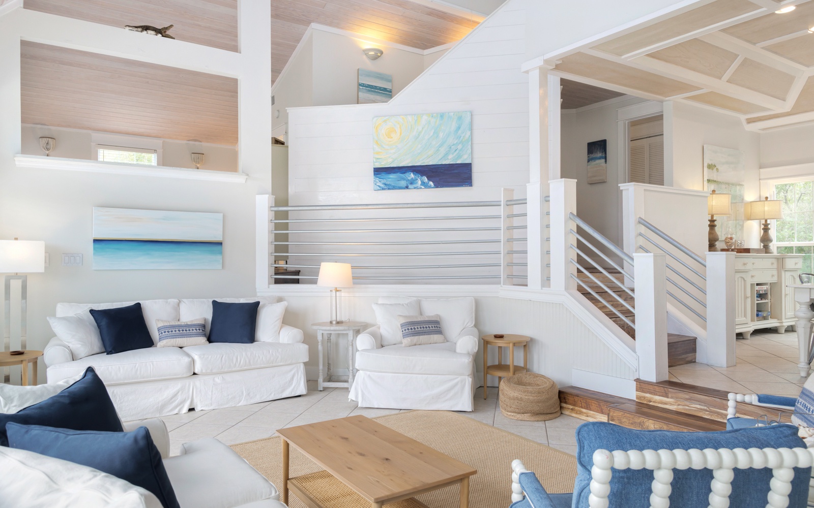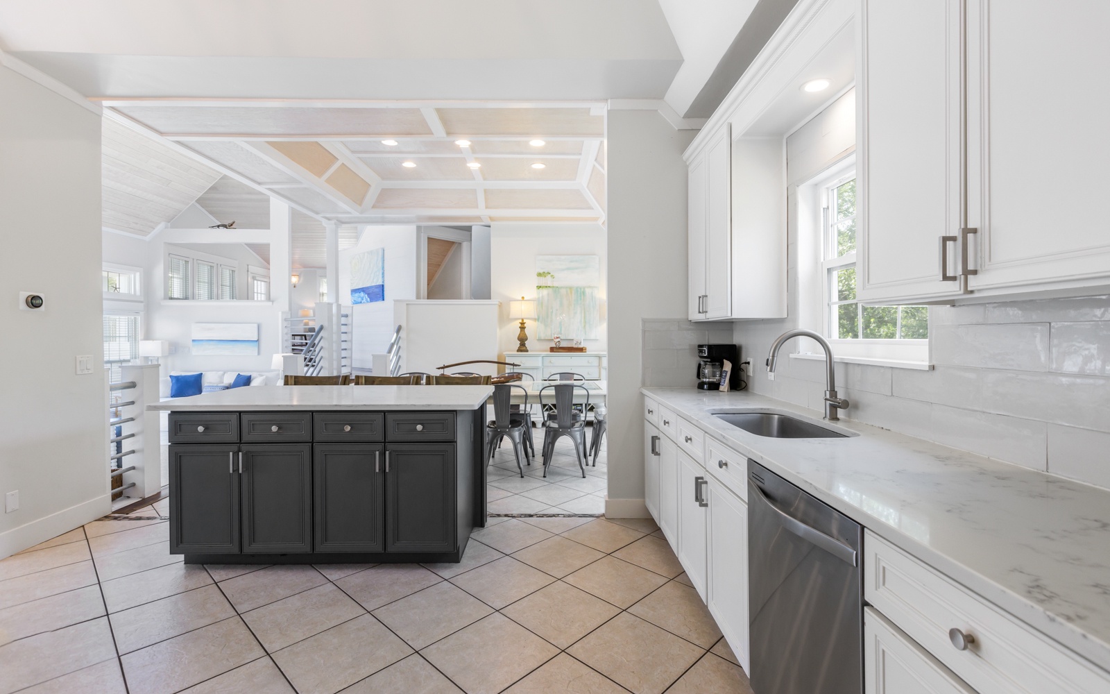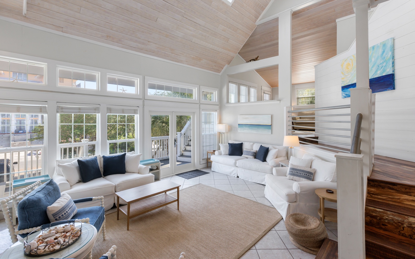 The first-floor living area is great for kids and teens, with a primary suite, king, two guest rooms, both king, and a bunk room. The second floor is where everyone comes together, featuring a spacious, newly decorated living-dining area, an updated kitchen, and a deck with a grill just steps from the kitchen. A primary suite, king, with a sitting area and deck access and another guest room, queen, round out this level.