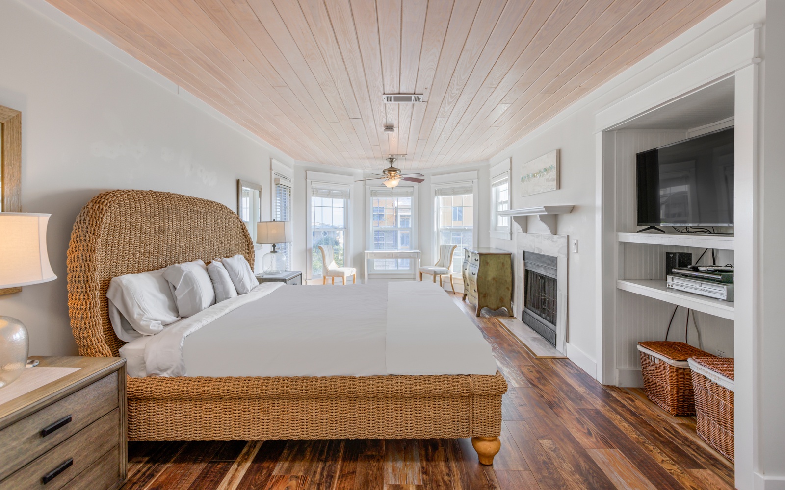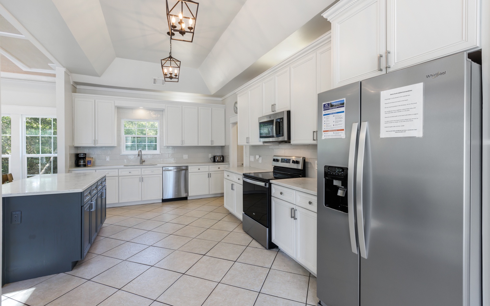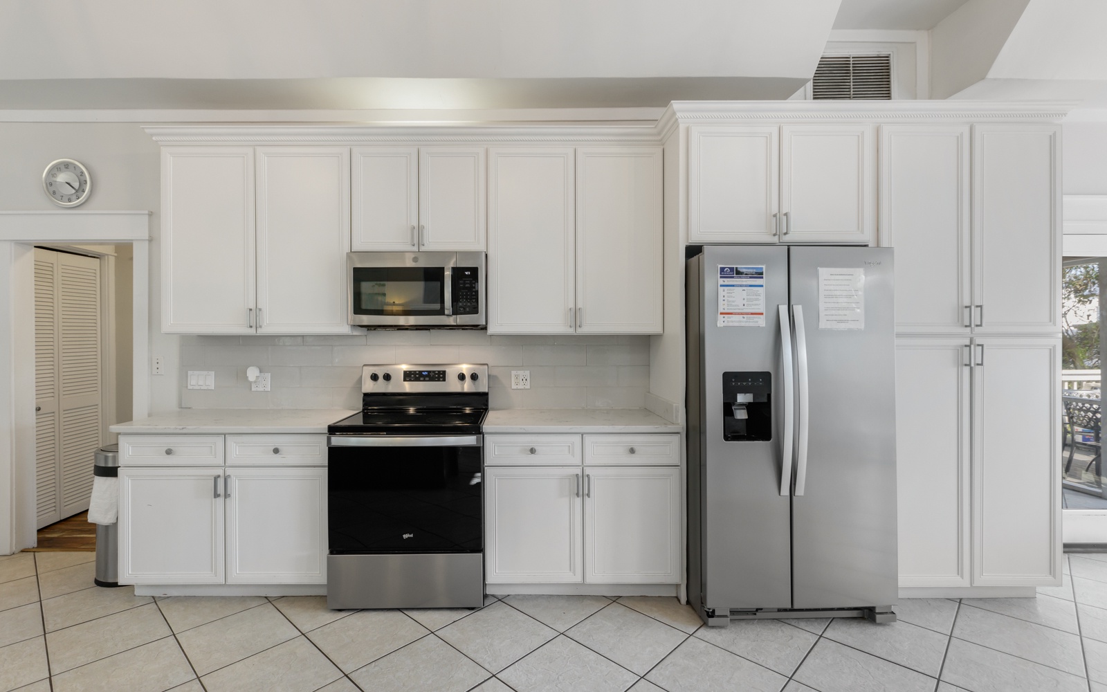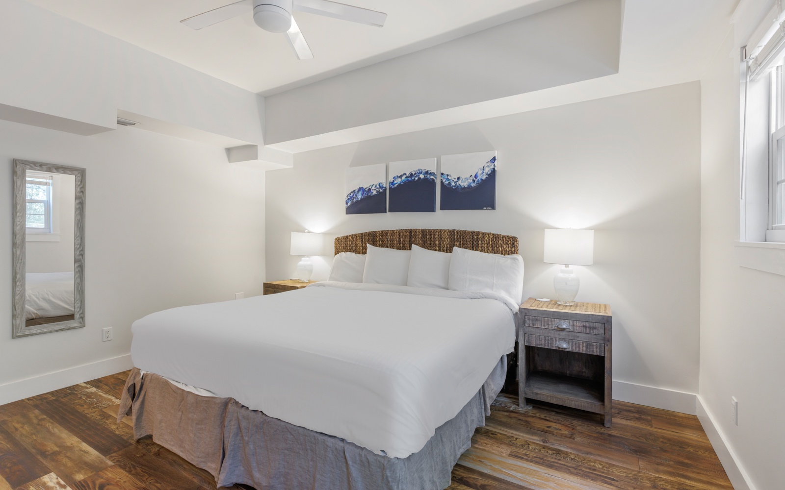 The first-floor living area is great for kids and teens, with a primary suite, king, two guest rooms, both king, and a bunk room. The second floor is where everyone comes together, featuring a spacious, newly decorated living-dining area, an updated kitchen, and a deck with a grill just steps from the kitchen. A primary suite, king, with a sitting area and deck access and another guest room, queen, round out this level.