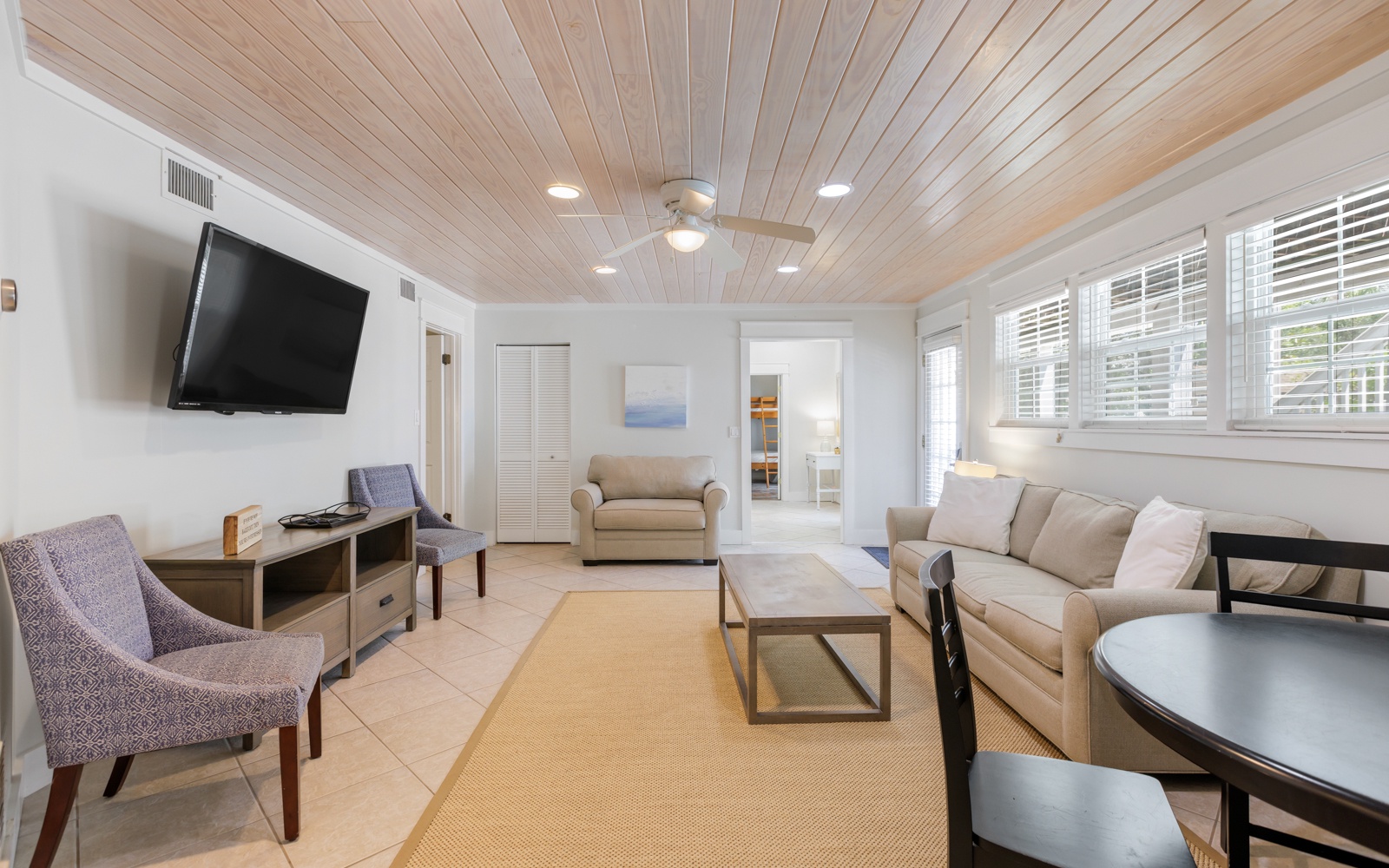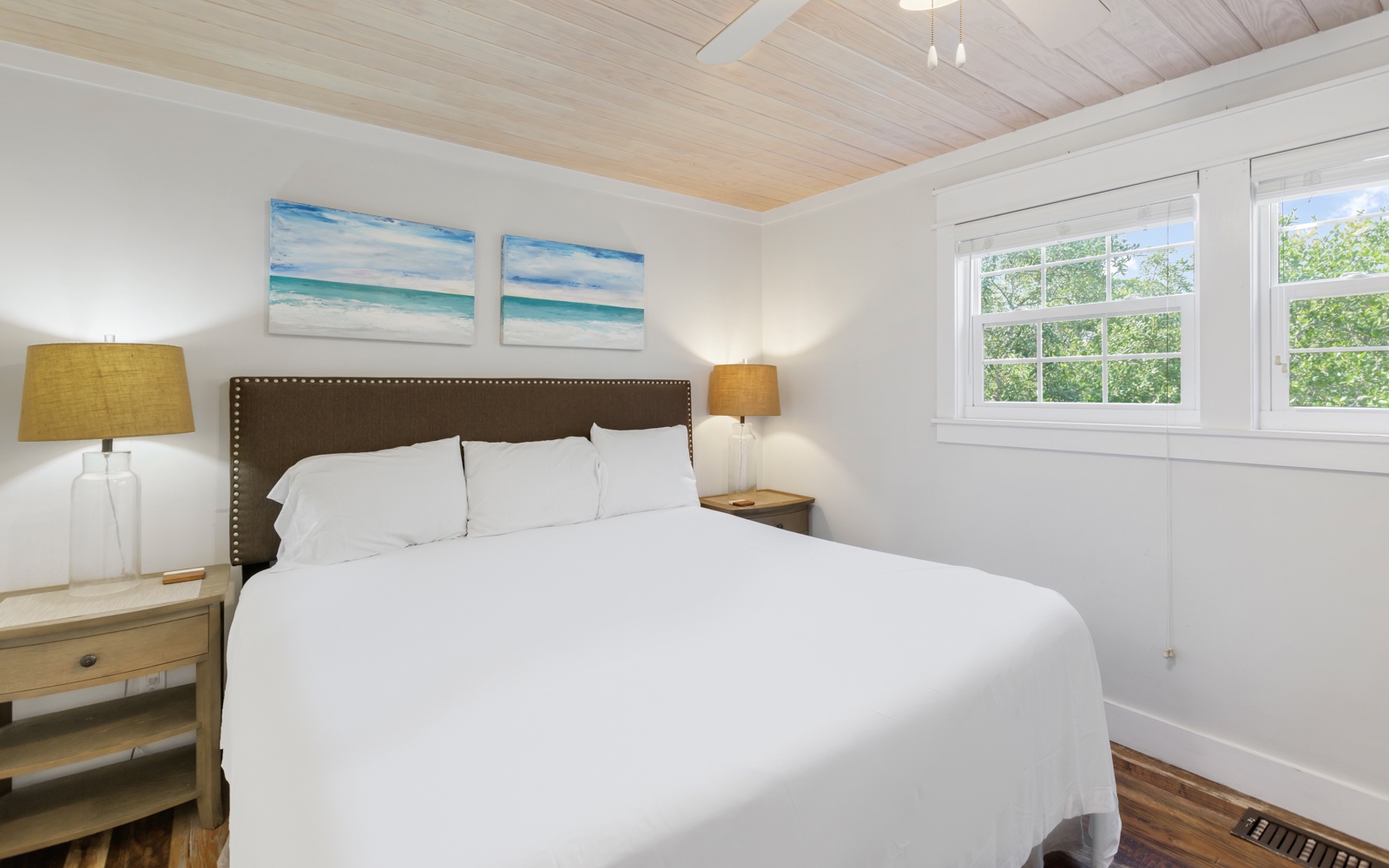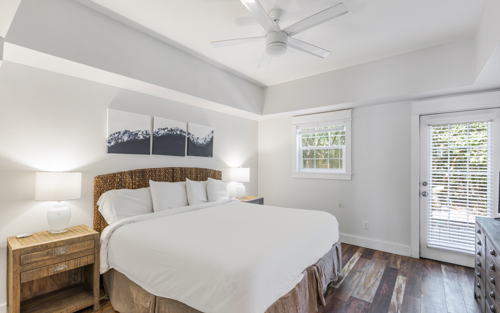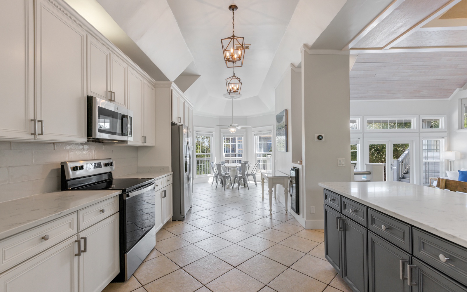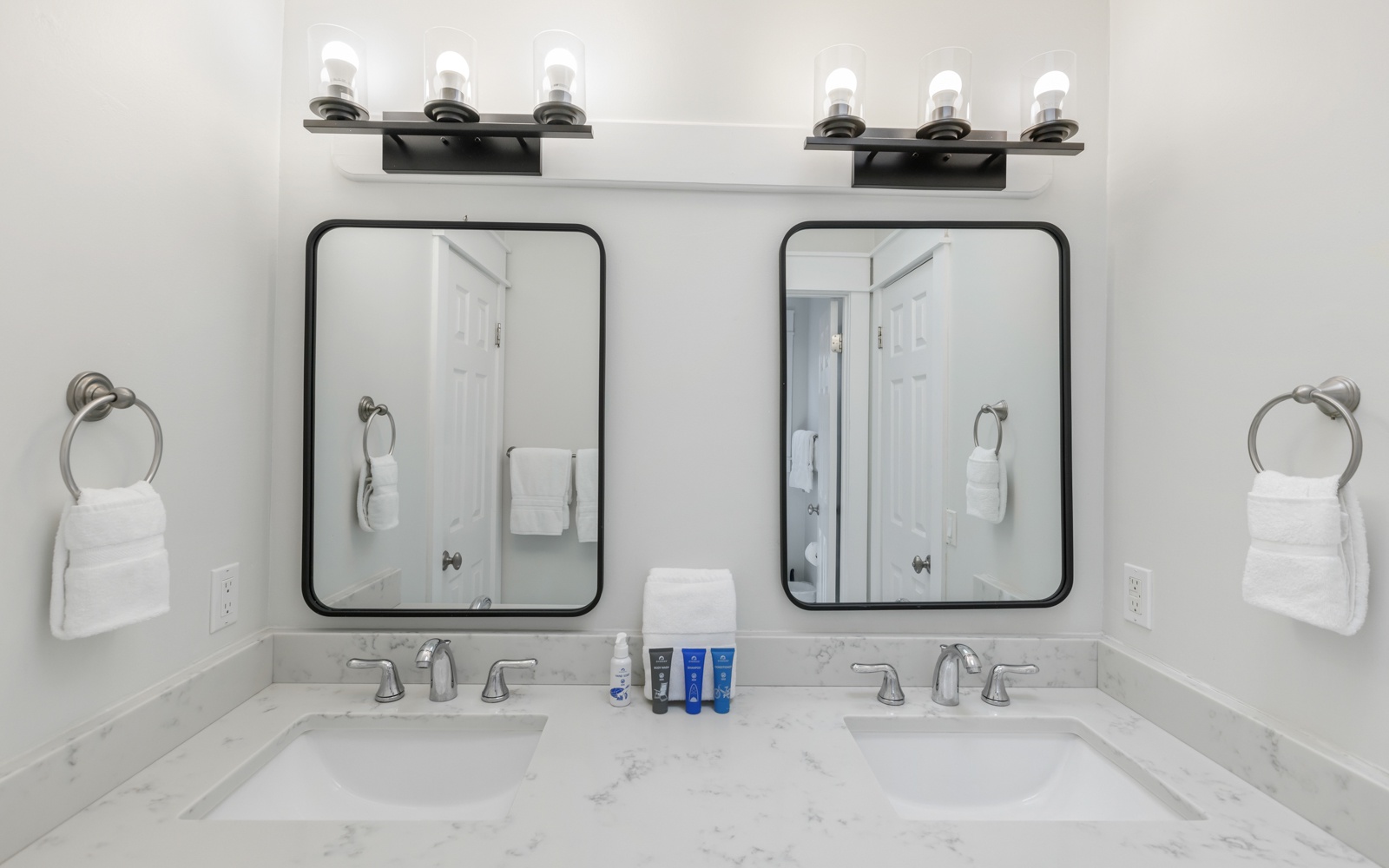 The first-floor living area is great for kids and teens, with a primary suite, king, two guest rooms, both king, and a bunk room. The second floor is where everyone comes together, featuring a spacious, newly decorated living-dining area, an updated kitchen, and a deck with a grill just steps from the kitchen. A primary suite, king, with a sitting area and deck access and another guest room, queen, round out this level.