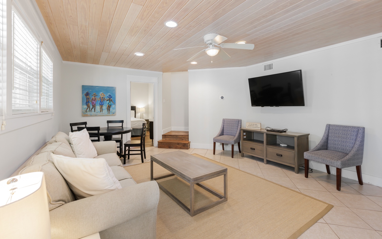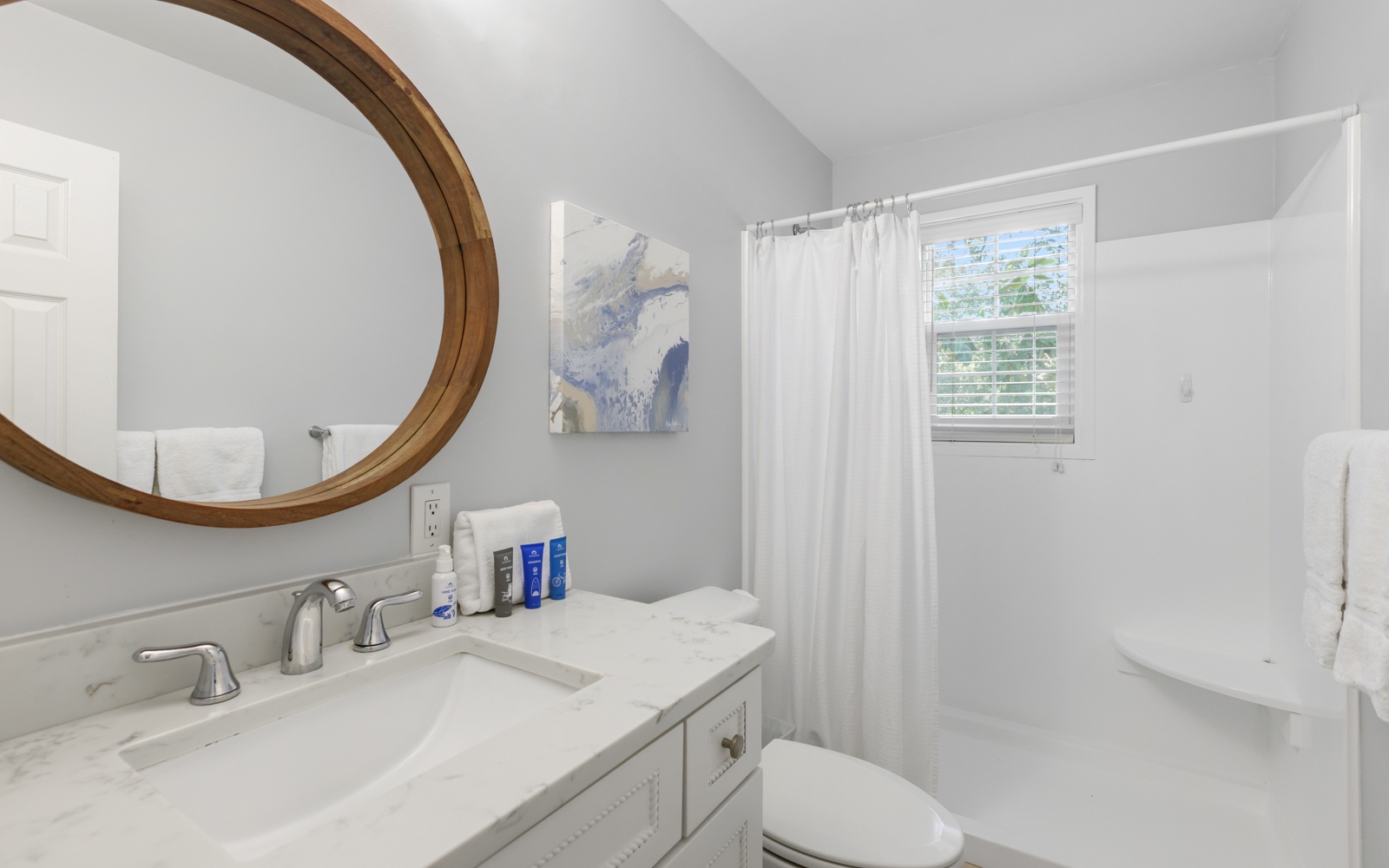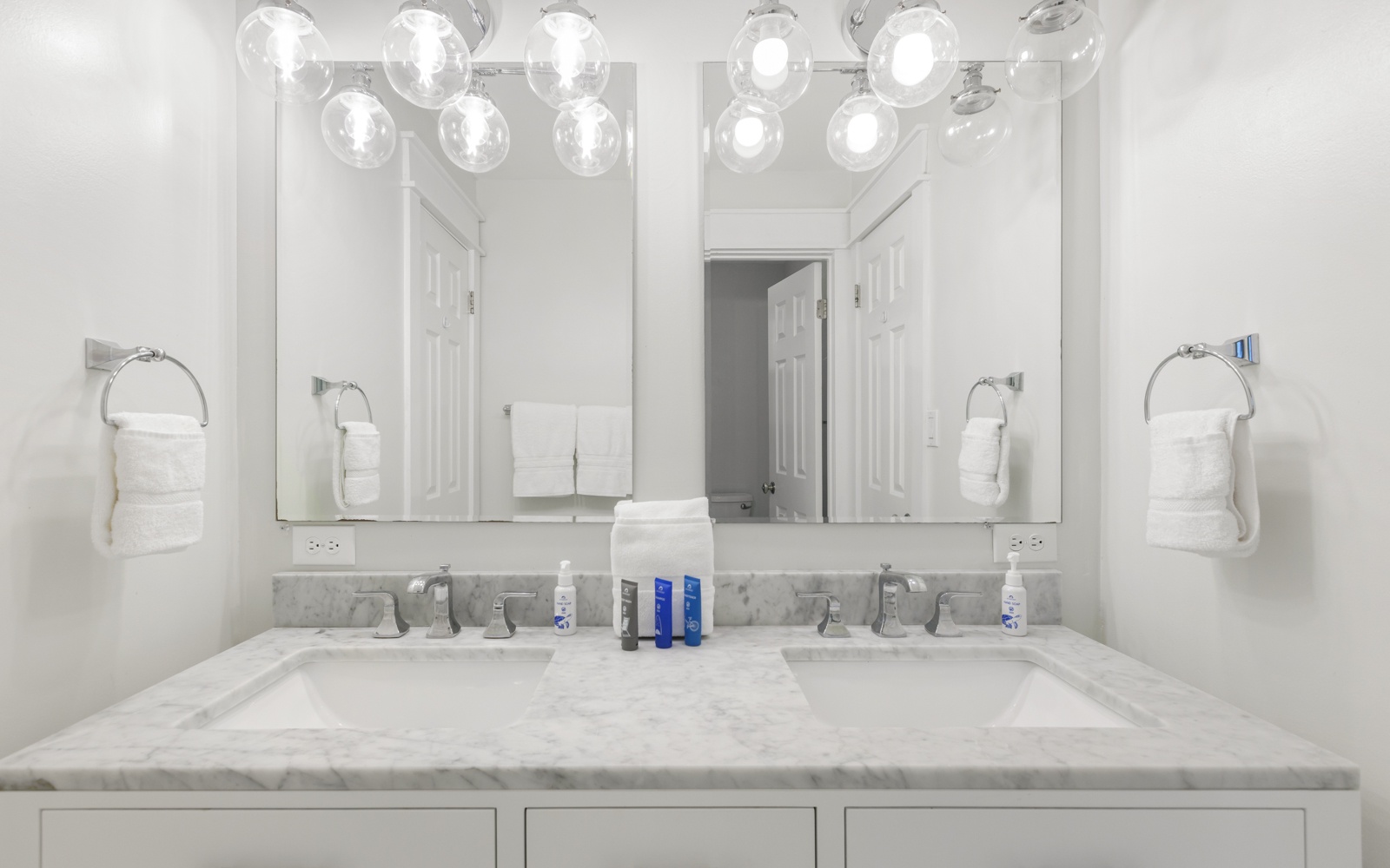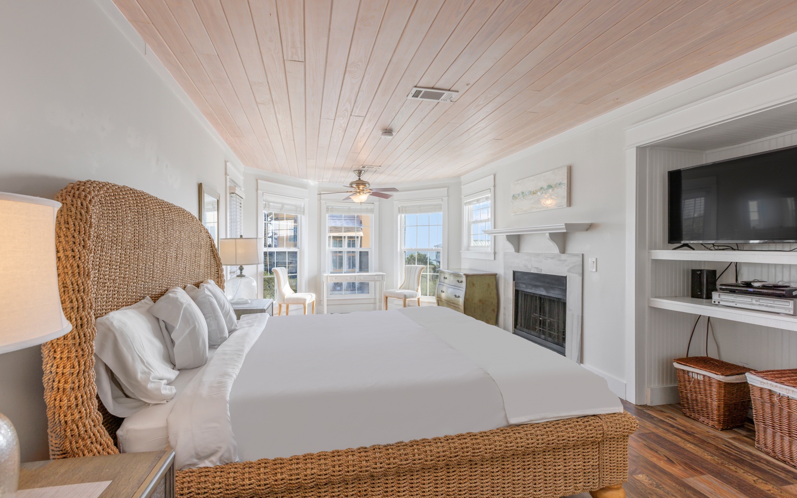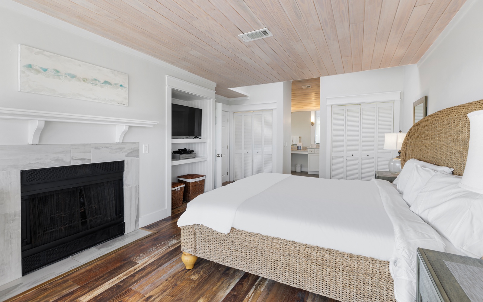 The first-floor living area is great for kids and teens, with a primary suite, king, two guest rooms, both king, and a bunk room. The second floor is where everyone comes together, featuring a spacious, newly decorated living-dining area, an updated kitchen, and a deck with a grill just steps from the kitchen. A primary suite, king, with a sitting area and deck access and another guest room, queen, round out this level.