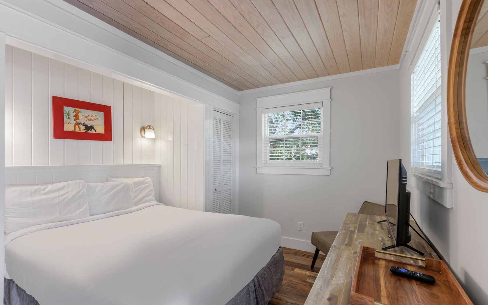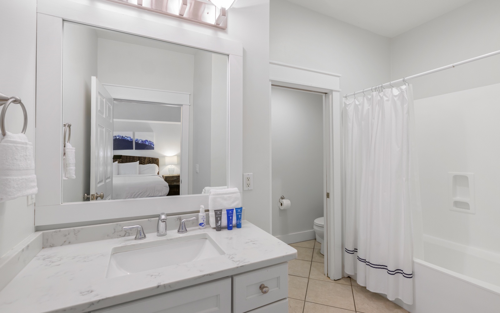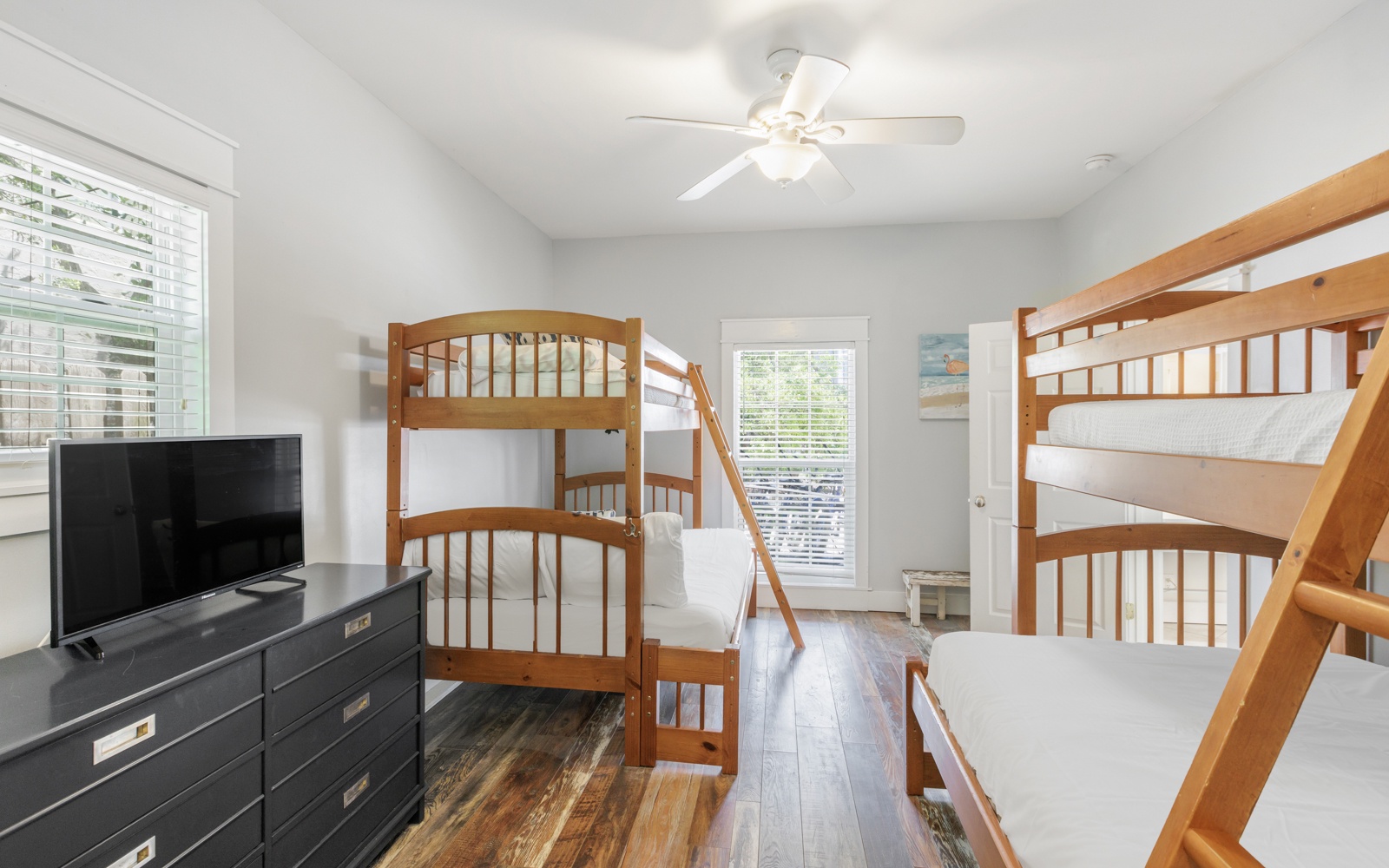 - Bunkroom: 2 twin over queen bunks, shared full hall bath, TV