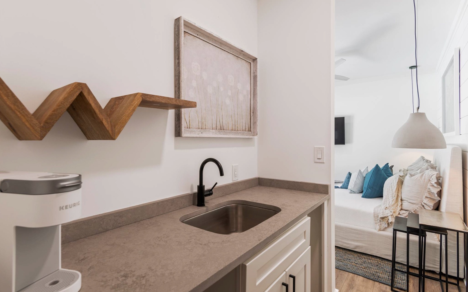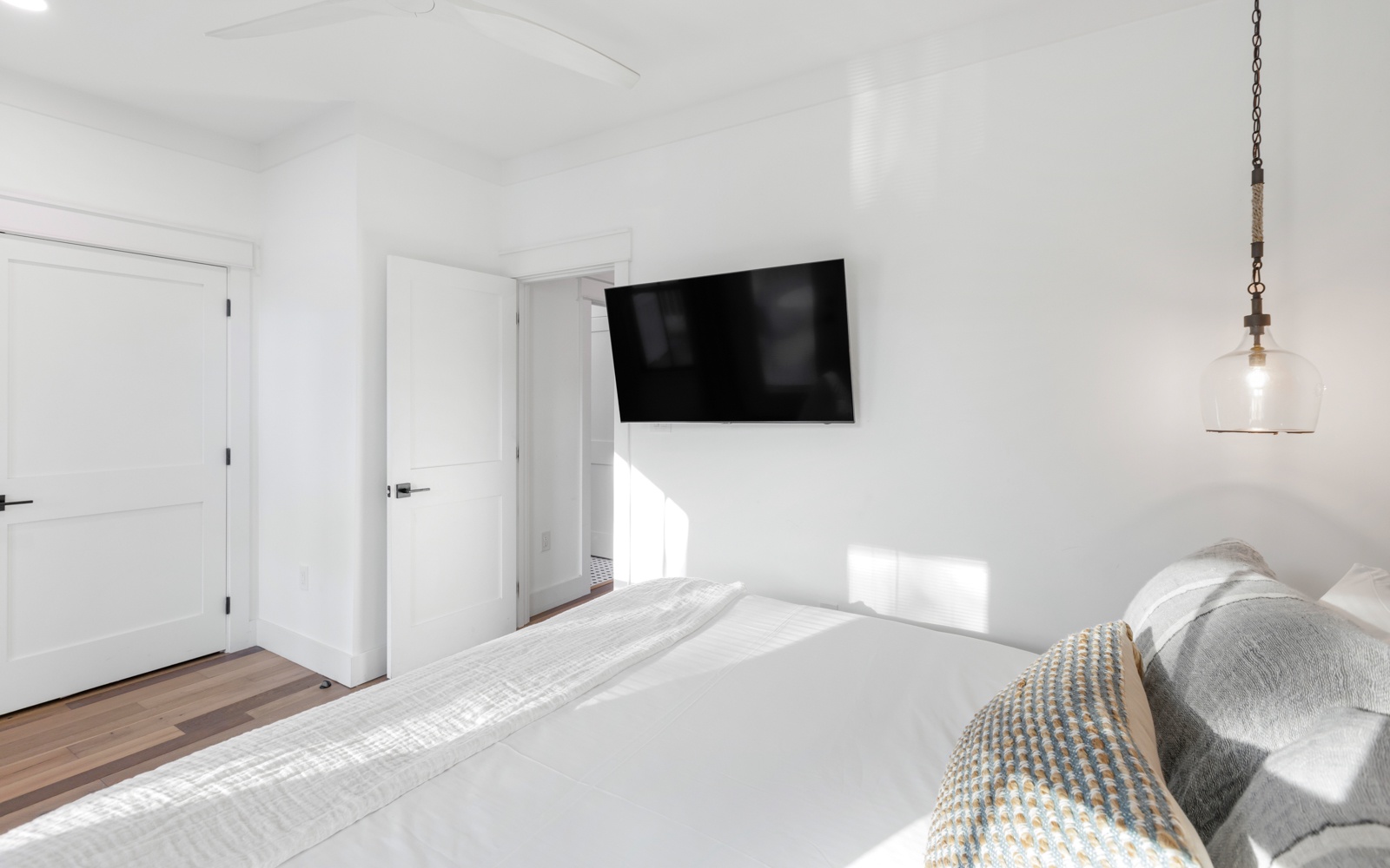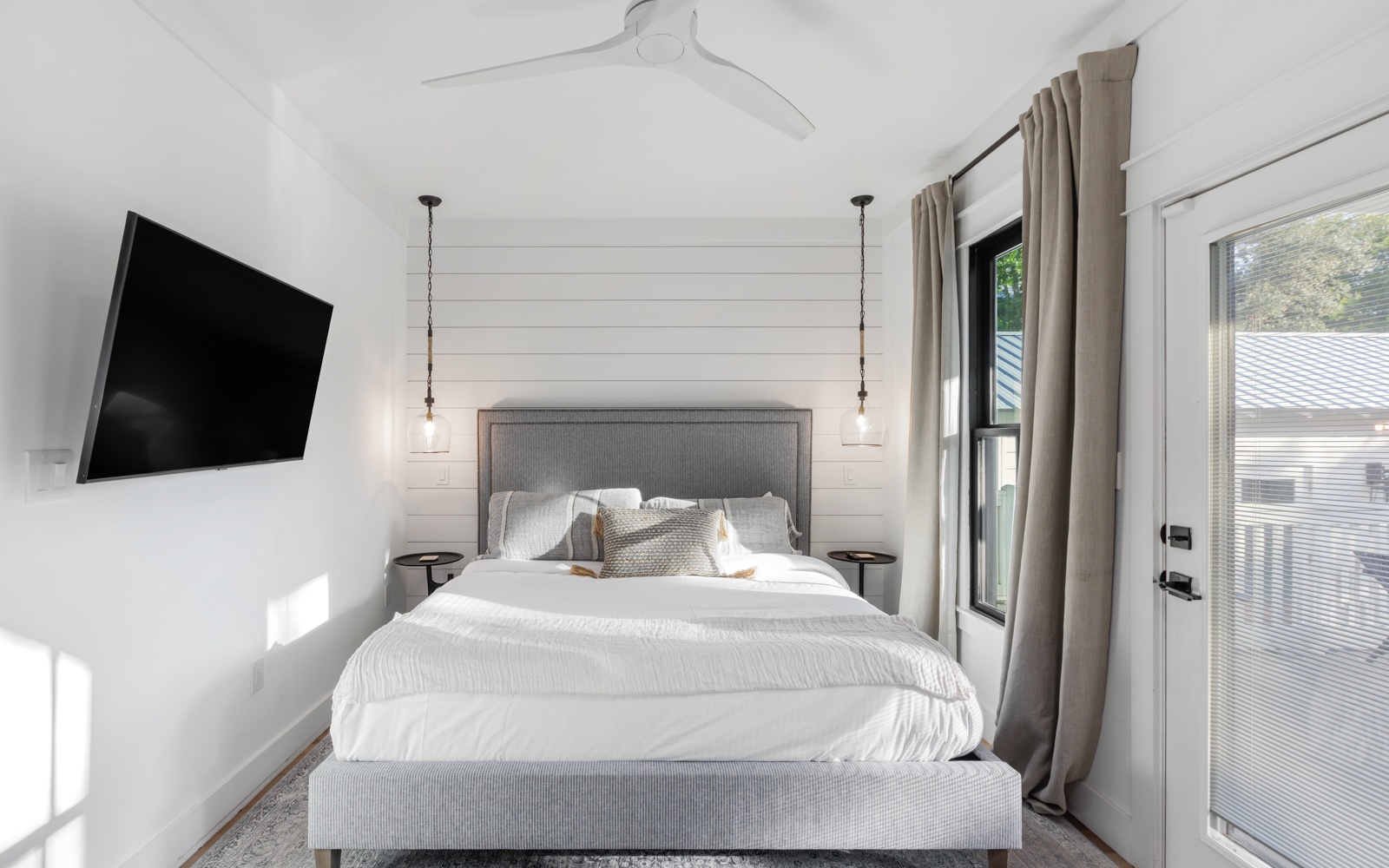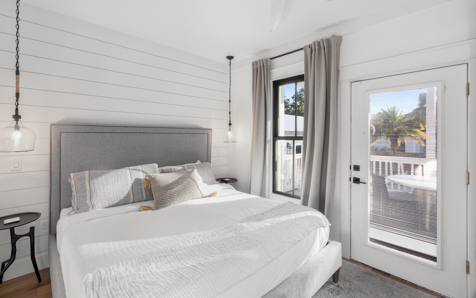 The main house has a downstairs bedroom with a king bed, a large closet, and a Smart TV. This bedroom has hall bath access in addition to outdoor balcony access.