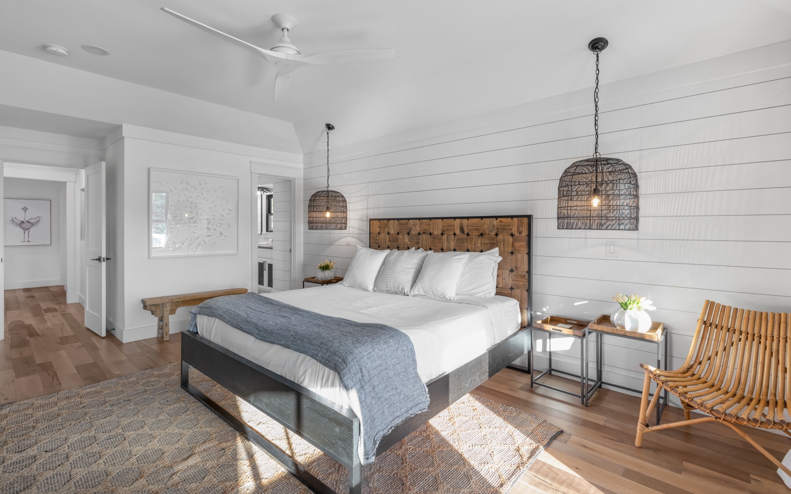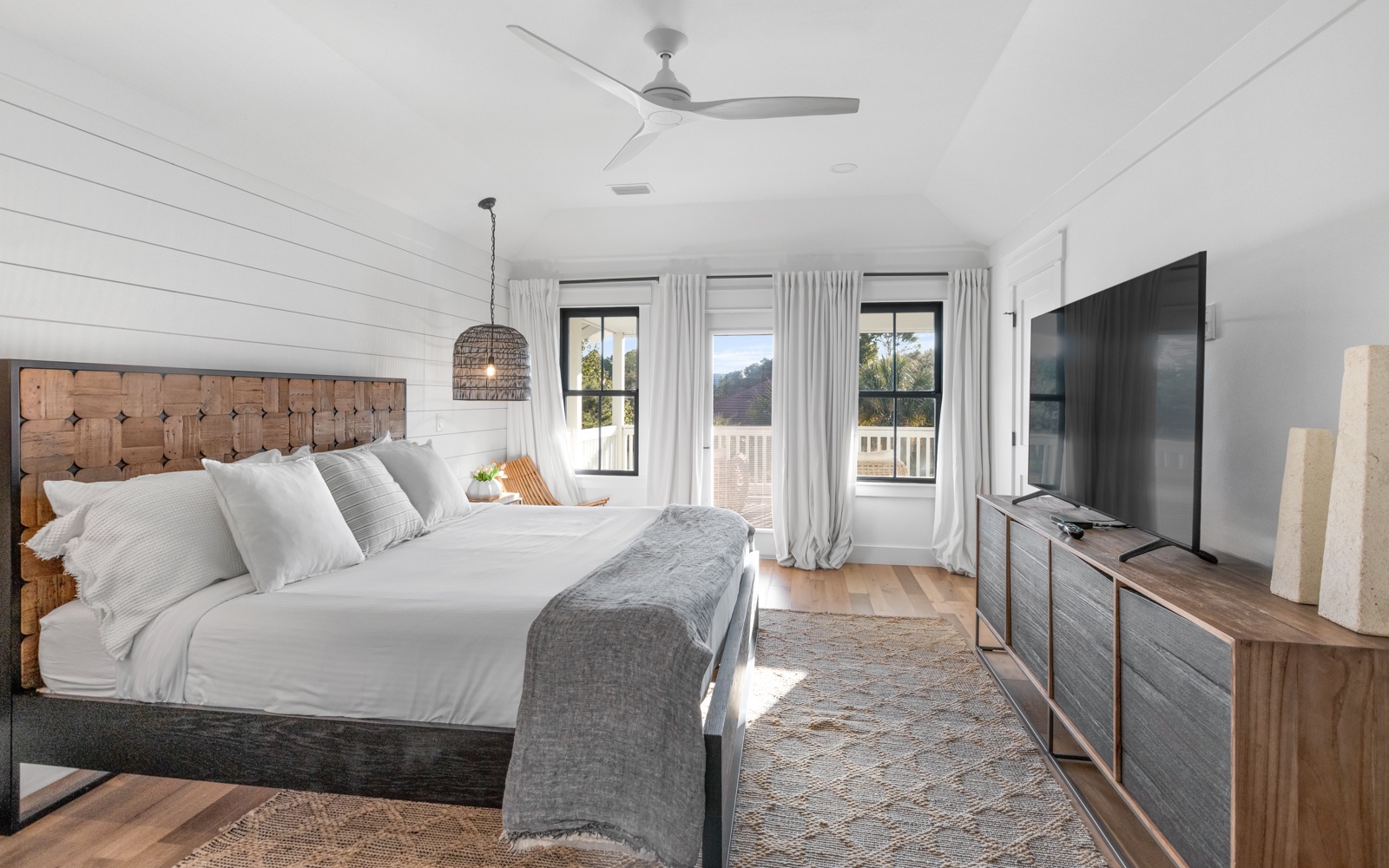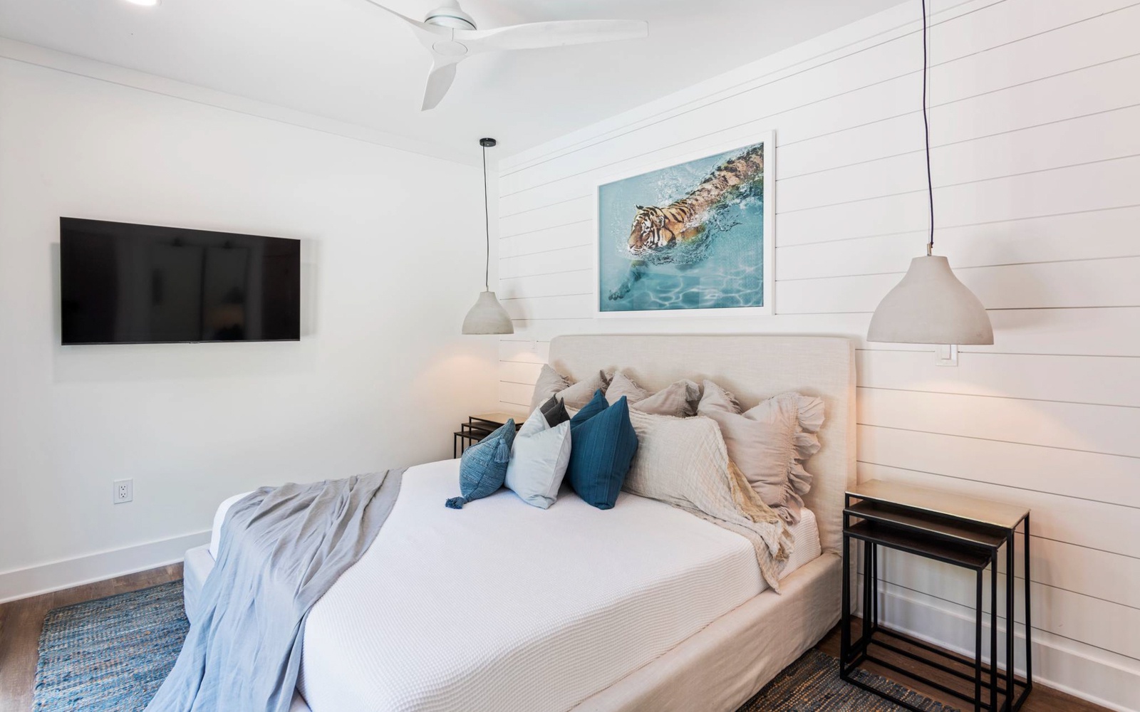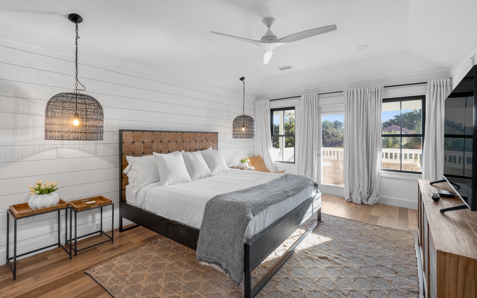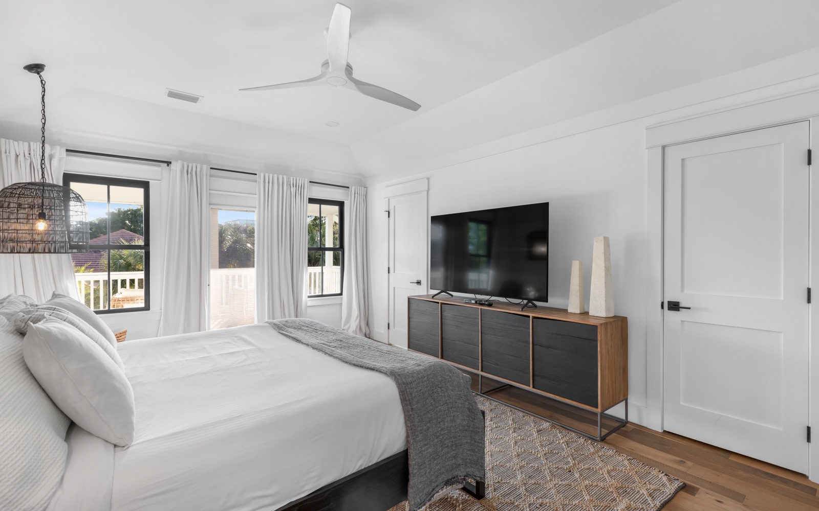The upstairs primary bedroom, king, with an ensuite bathroom, features an extra-large, double-headed walk-in shower and a double vanity. Also featured are large his-and-her closets, a 65" Smart TV, and a balcony overlooking the pool.