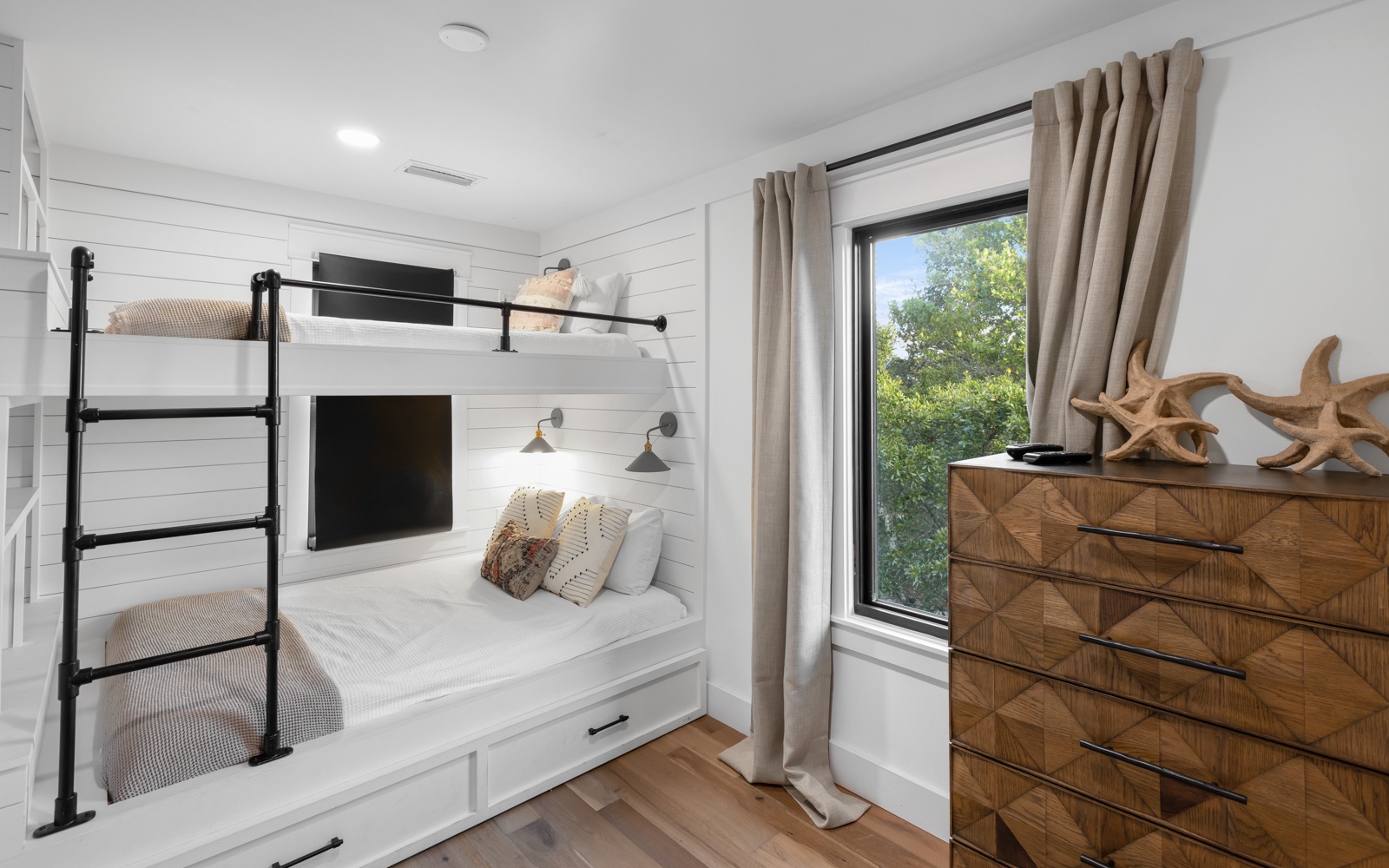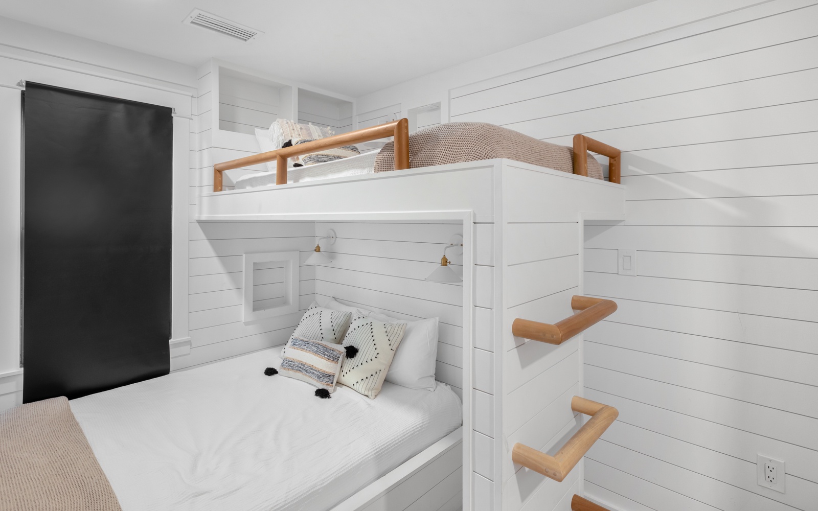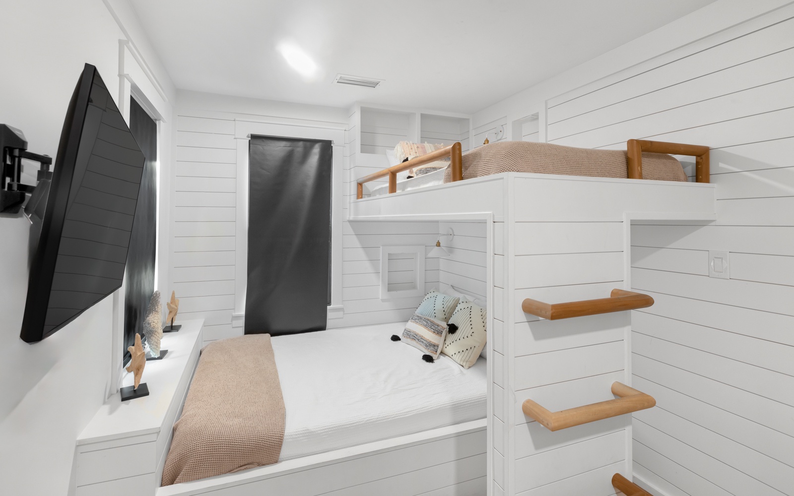 The 1st built-in bunk room has a twin over a queen bed and the 2nd built-in bunk room has a twin over a full bed with a full trundle. The bunk rooms have a shared bathroom with a tub/shower combo. Both bunk rooms have Smart TVs.