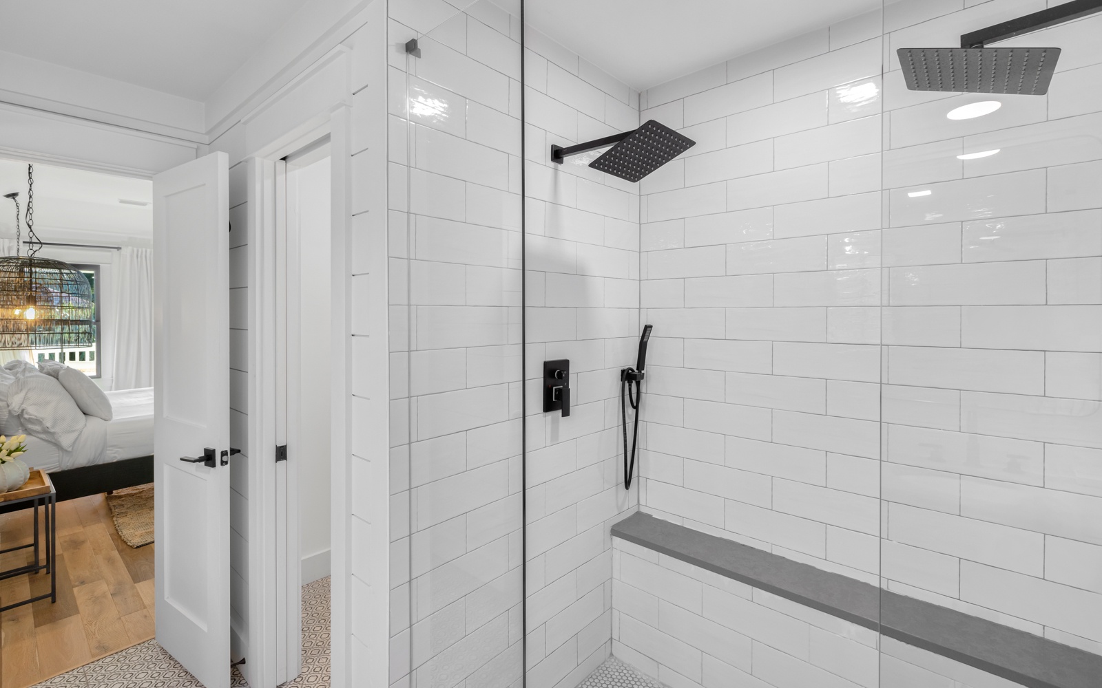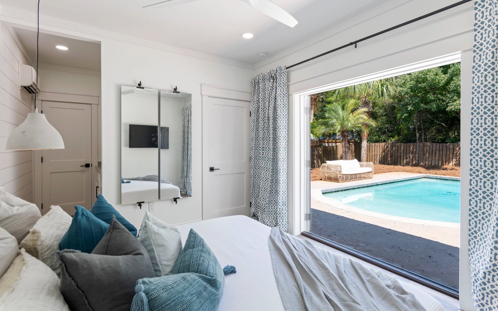 The guest house has another primary suite with a king bed, an ensuite bathroom with a walk-in shower, and a Smart TV. The gorgeous bedroom leads directly to the pool. Very Nice!