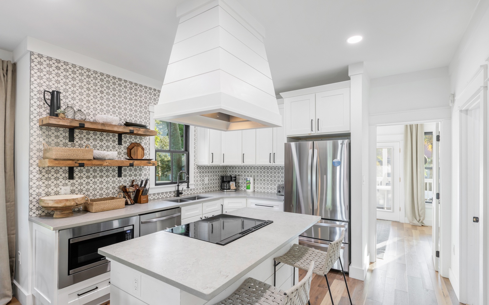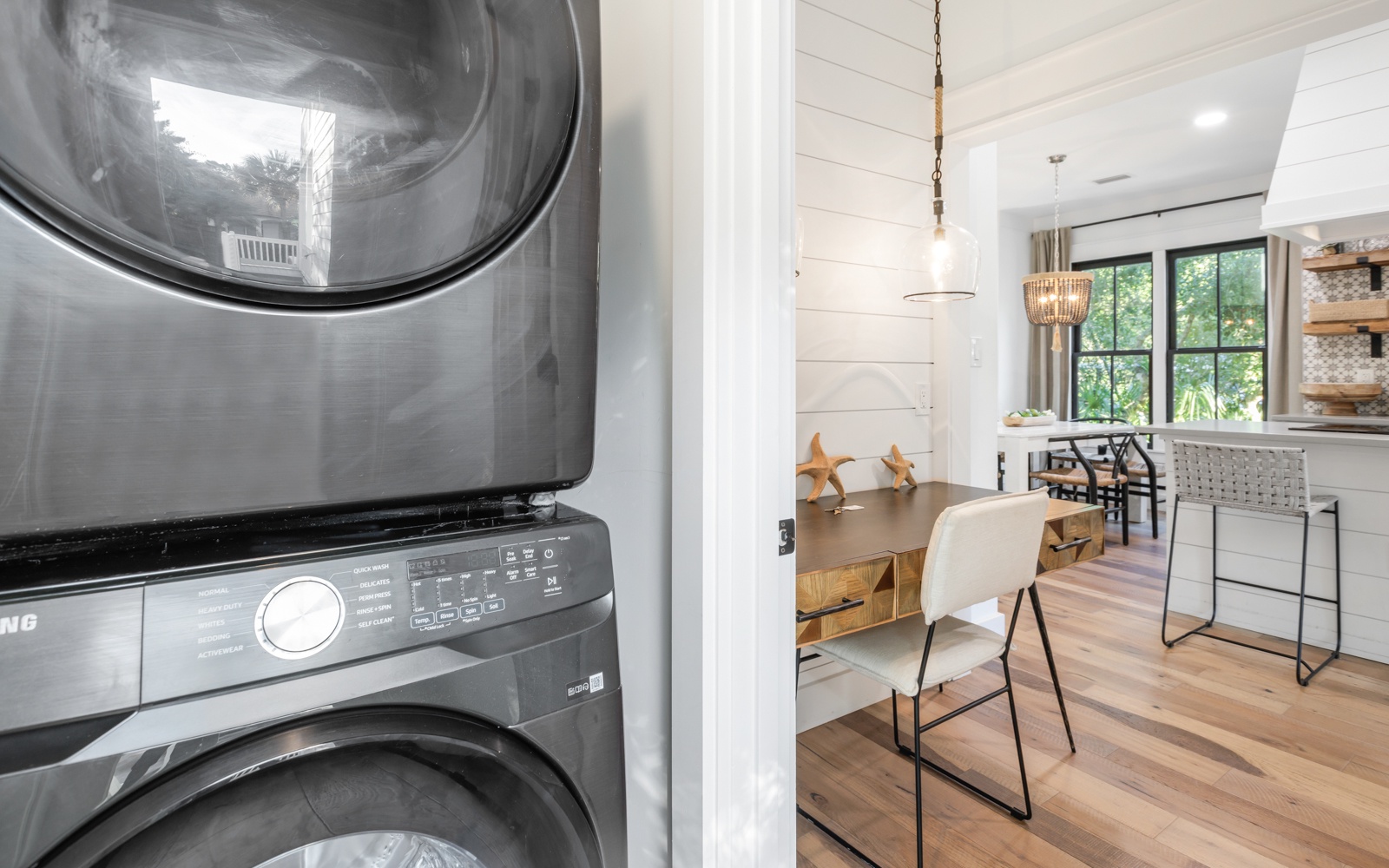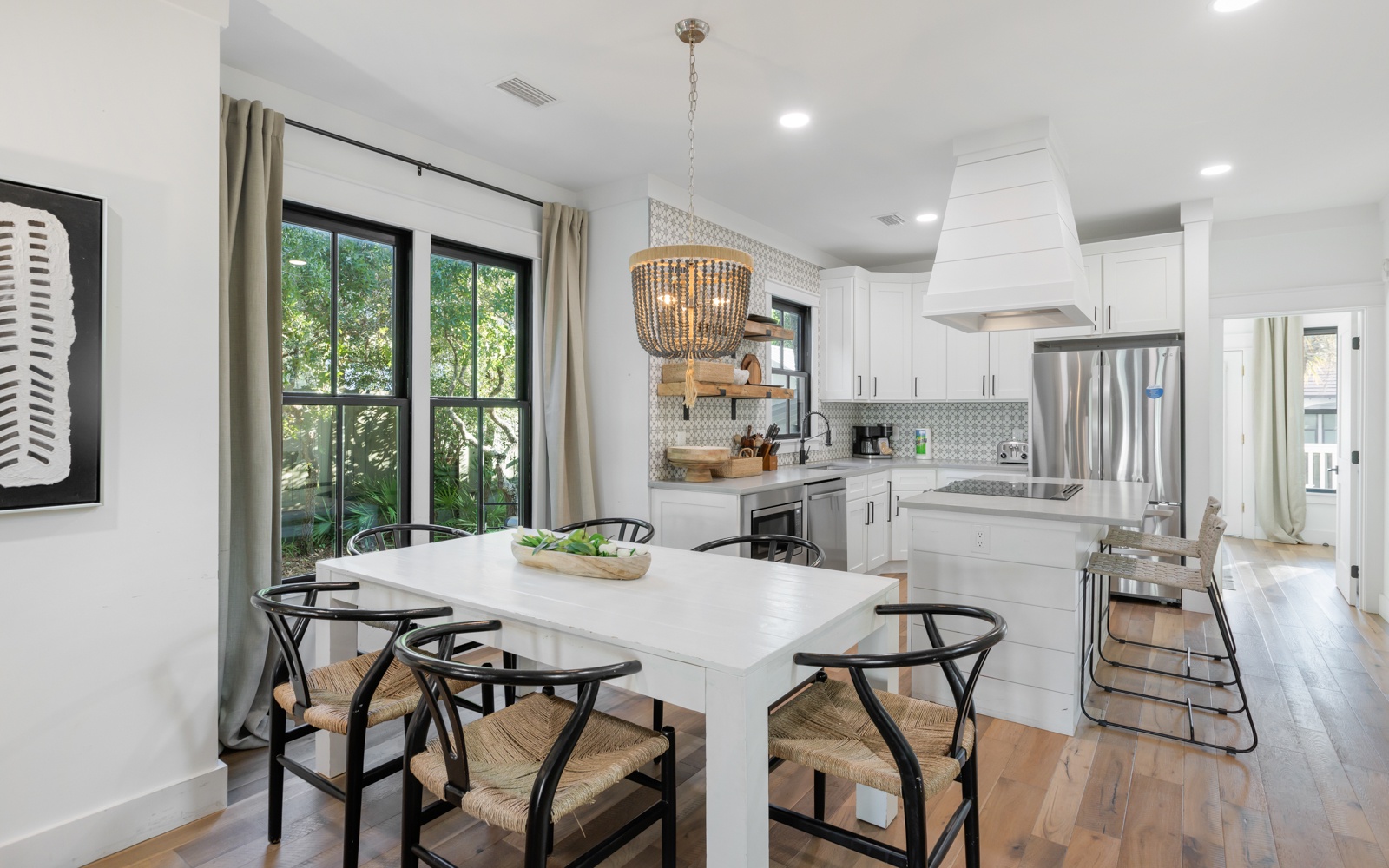 The kitchen is well stocked, featuring generous counter space, ample lighting, and plenty of cooking and eating utensils. The dining room table comfortably seats 6. Find additional seating at the bar and outdoor dining table.
