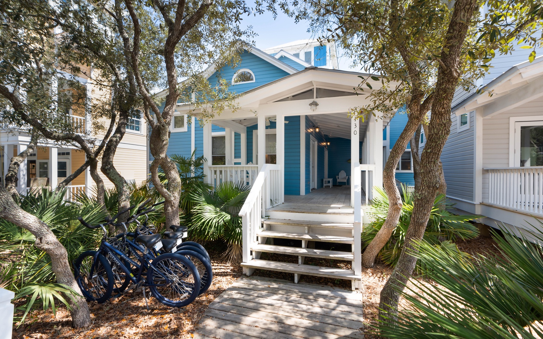 That blue cottage with white railings and palms out front? Welcome to Son Worshipers, a three-level retreat, offering the Emerald Coast at its best. Set in one of 30A’s most iconic neighborhoods, this prime location is just two streets over from the bustling town square. You’re also close to the beach and the pool, so a quick hop on a bike? You’re ready for some Class A exploring!
