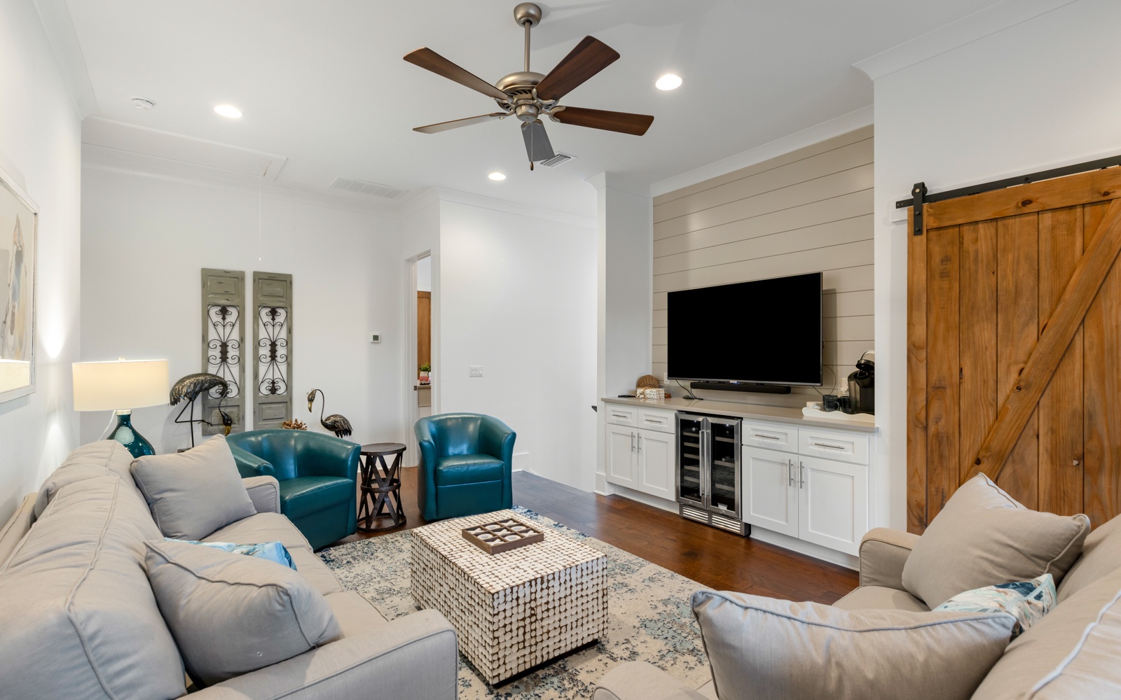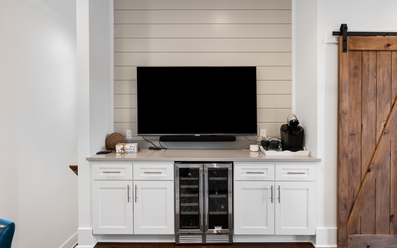 Upstairs is another large family room with a large TV, wine fridge, and coffee bar. It also opens onto a balcony with comfy seating.