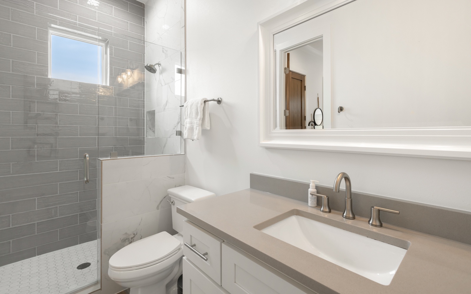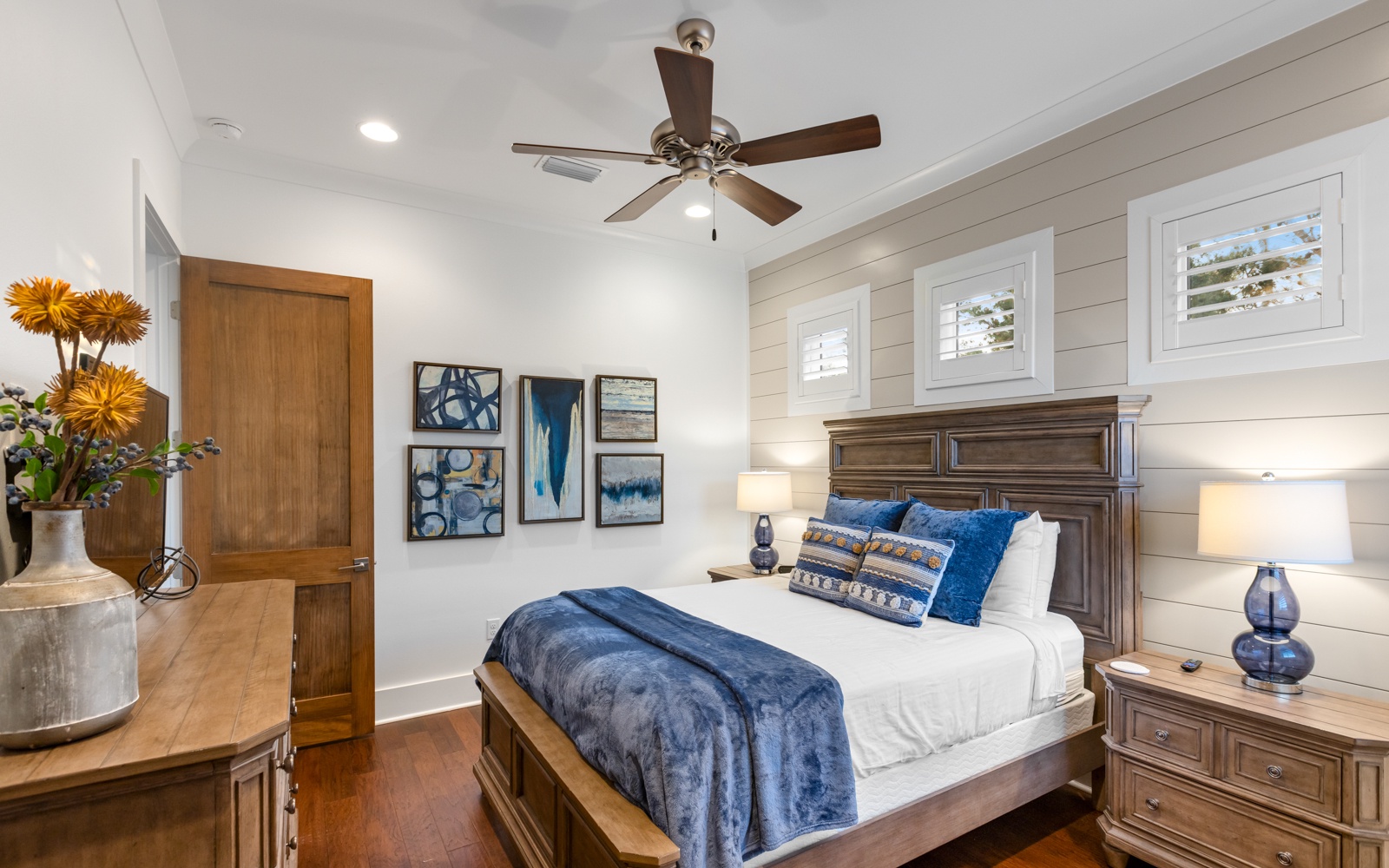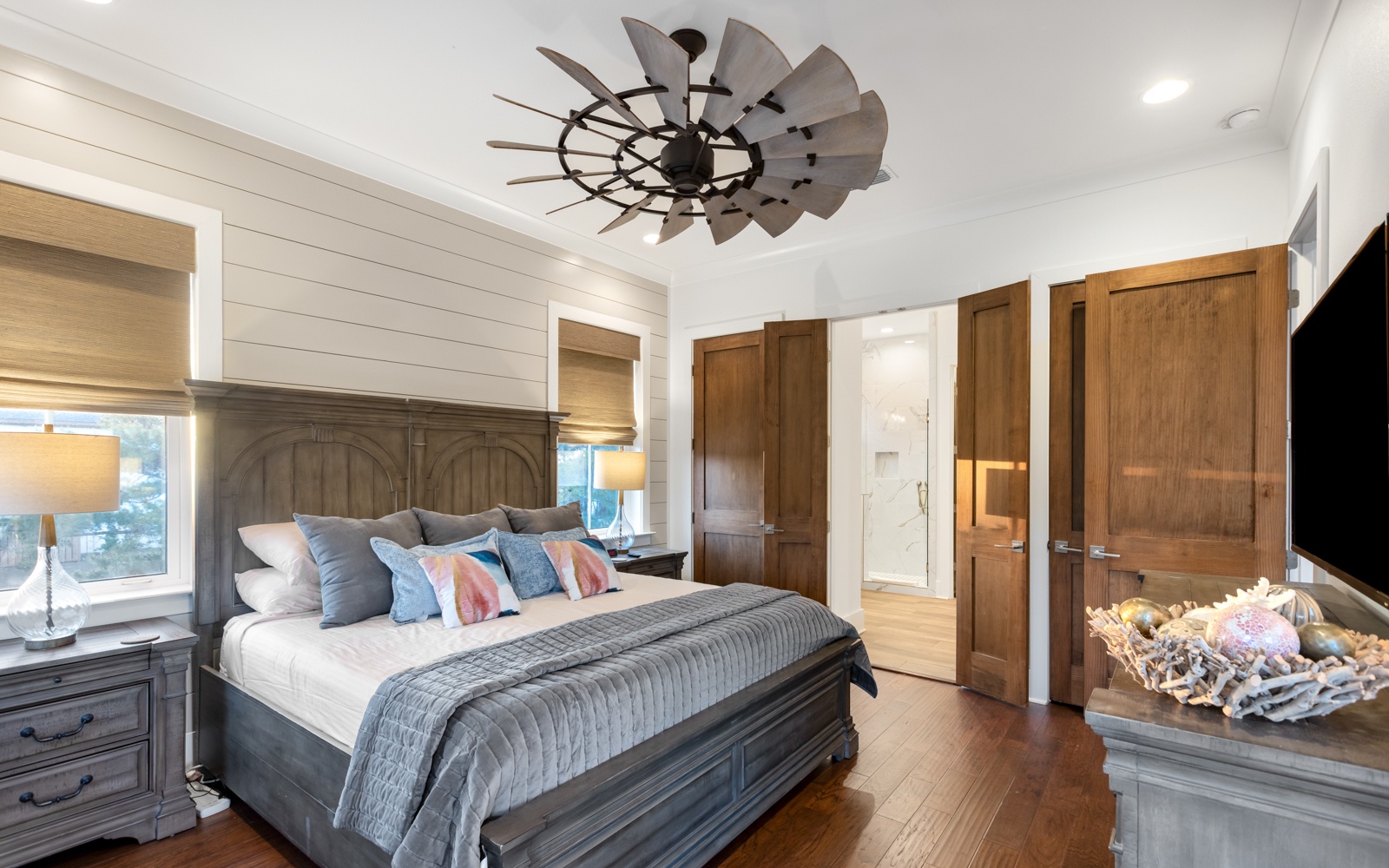 The two primary suites help make this a perfect home for multiple families. There’s one on each floor, both with kings, double vanities, and luxurious showers. The two additional guest bedrooms, queens, have private bathrooms, as does the bunk room.
