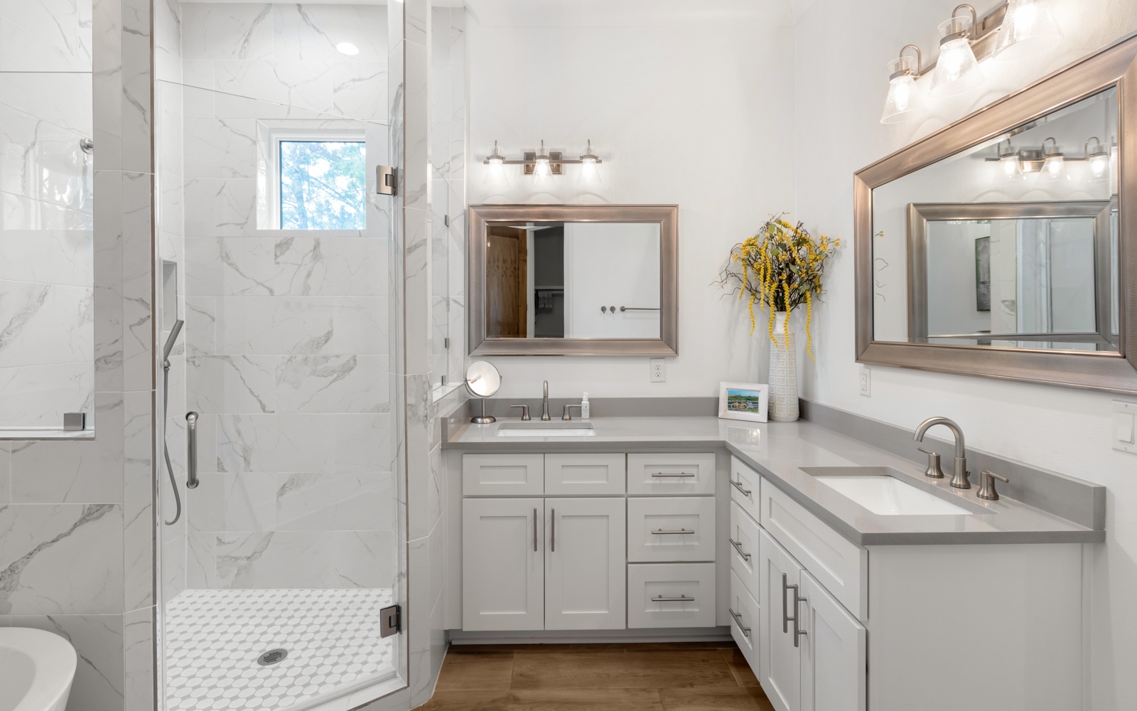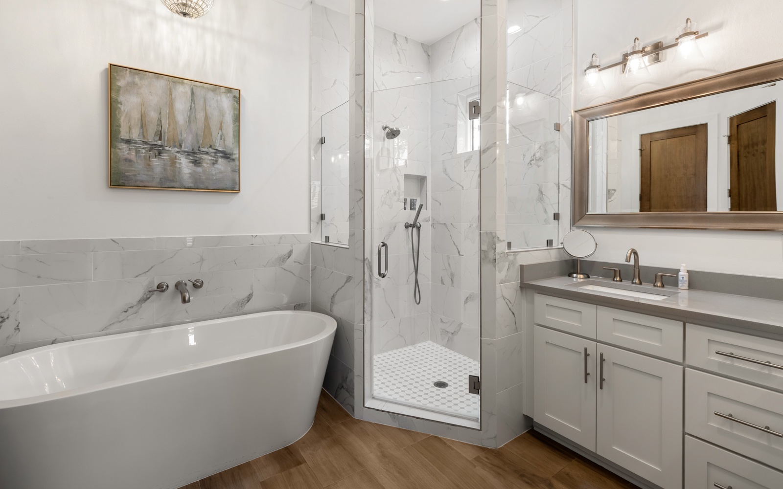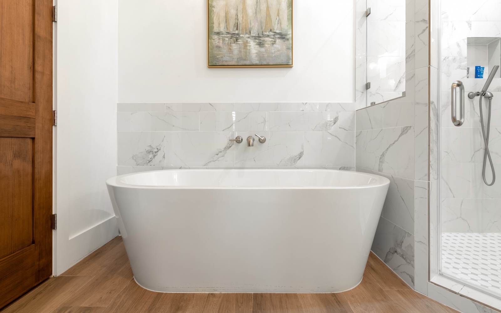 - King in 1st floor primary bedroom; tub; shower
