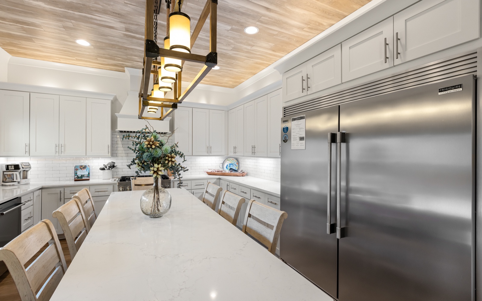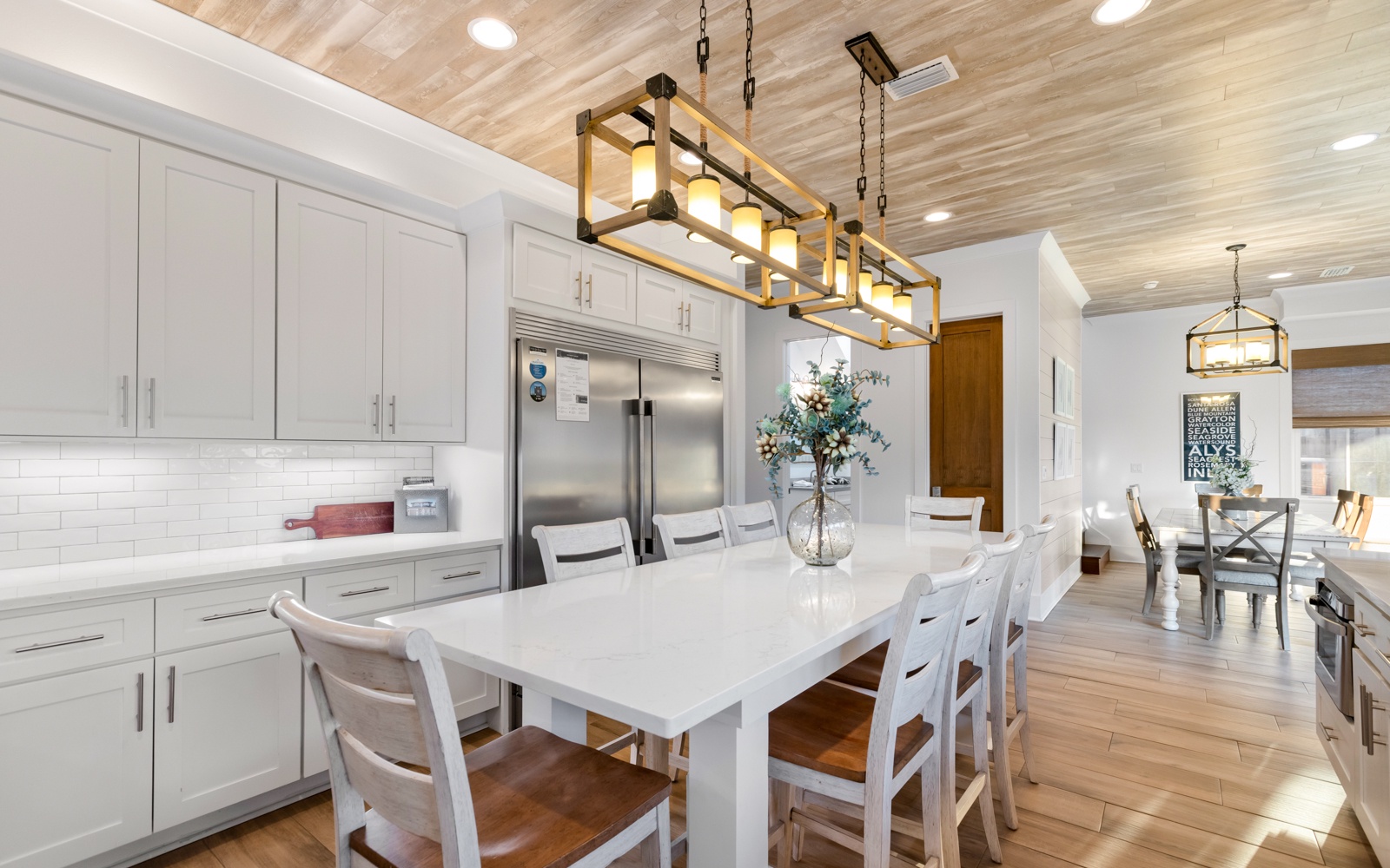 The 9-foot island, along with the dining room table, has enough room for 10. The spacious living area with a big TV, will entertain your entire crew.