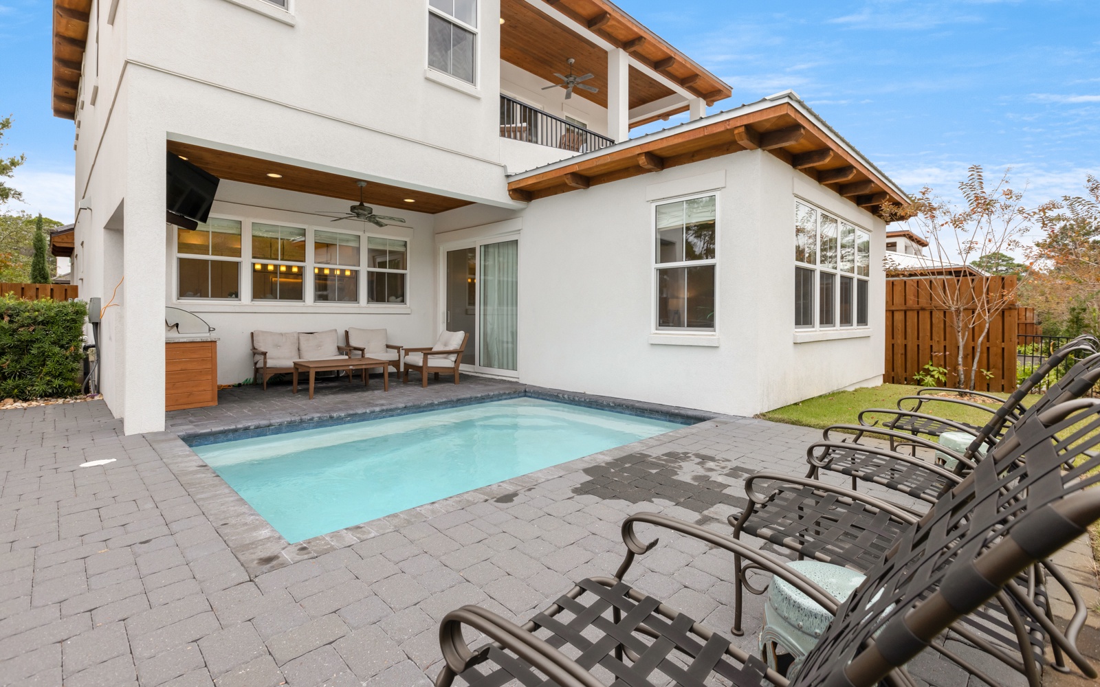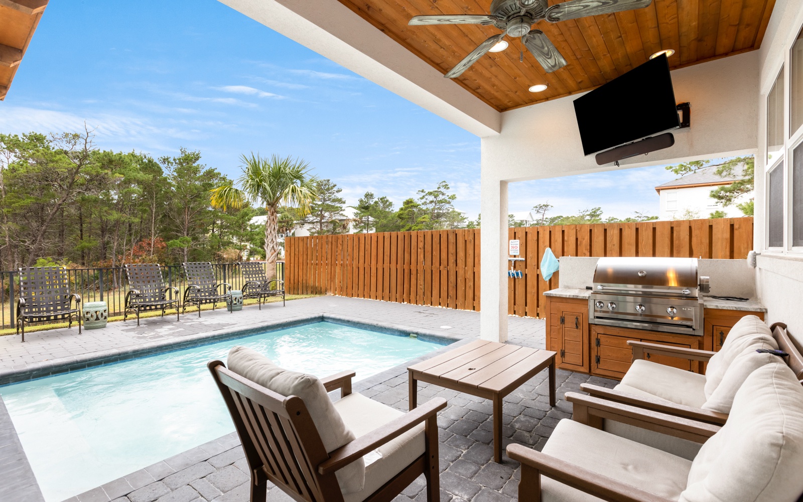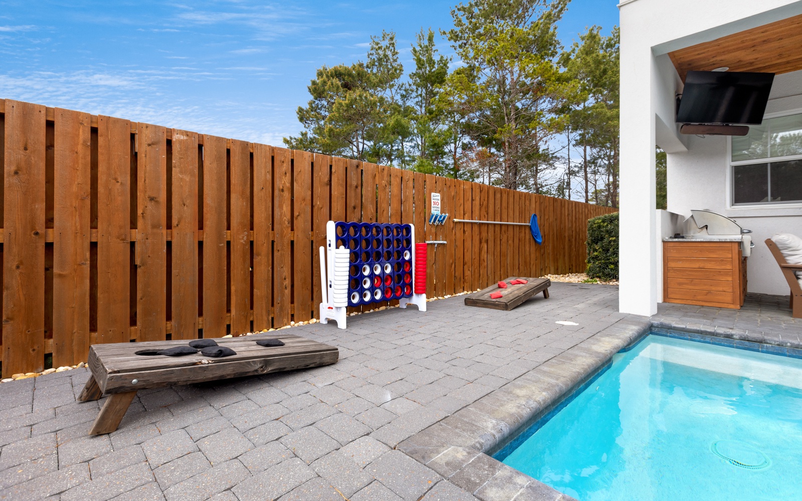 Out back, the private pool is beautiful and inviting, as is the patio, with a built-in gas grill, and large TV. Watch movies in the warm water or play a few fun rounds of corn hole. Never a dull moment.