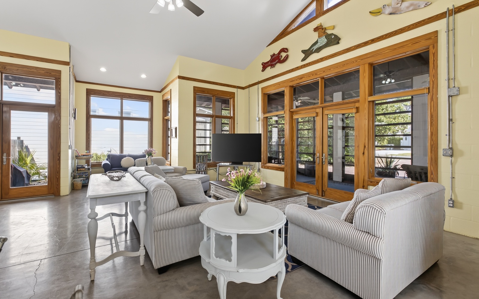 The living room includes a twin chair pull-out and a large TV, perfect for unwinding after a day at the beach.