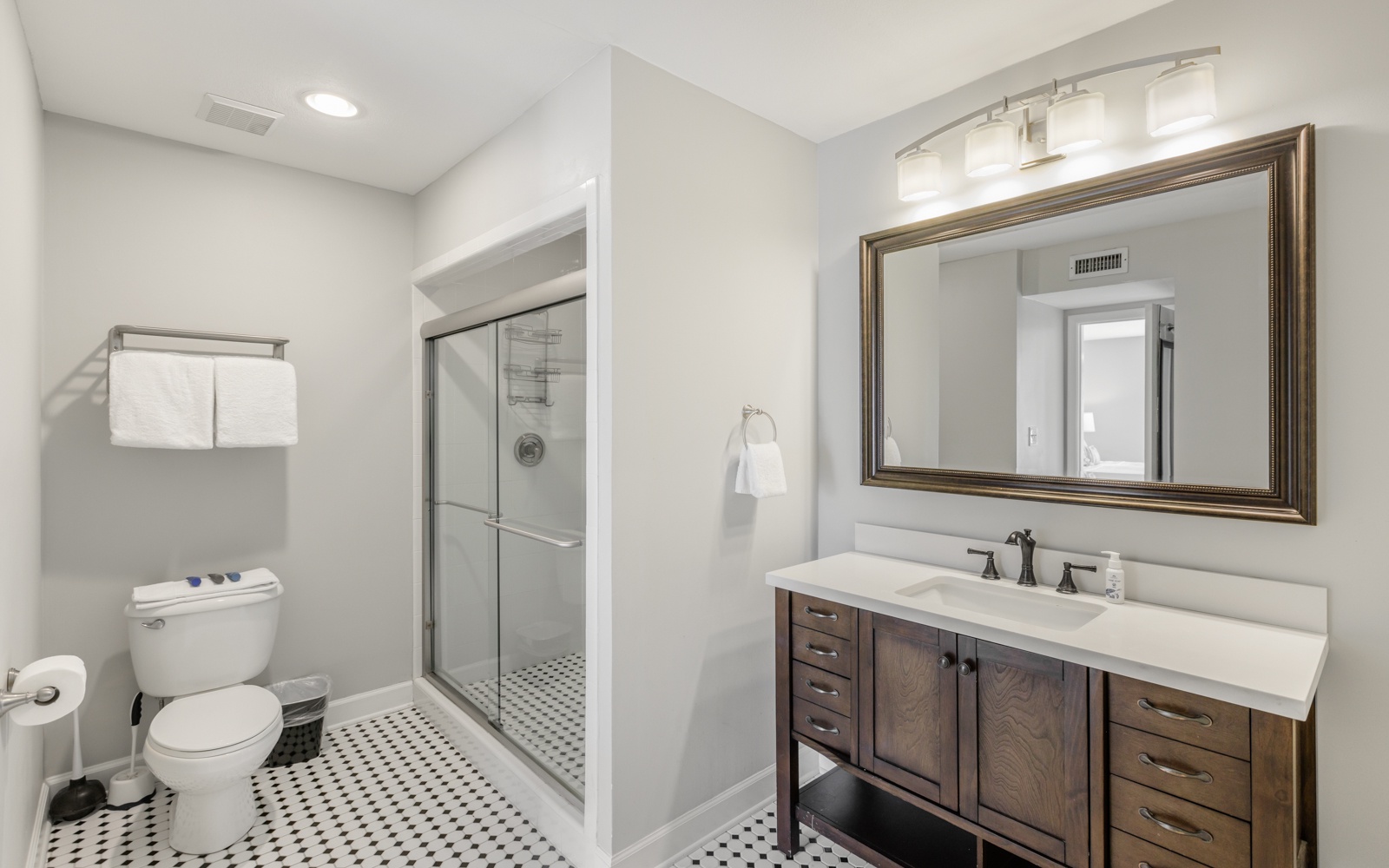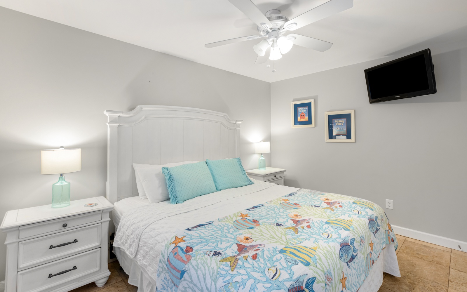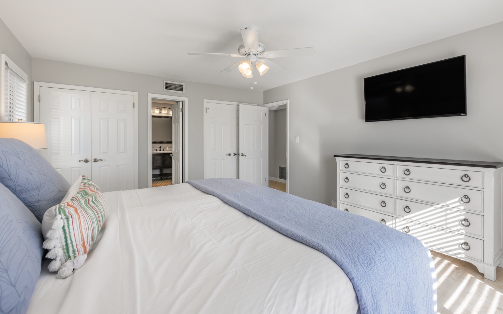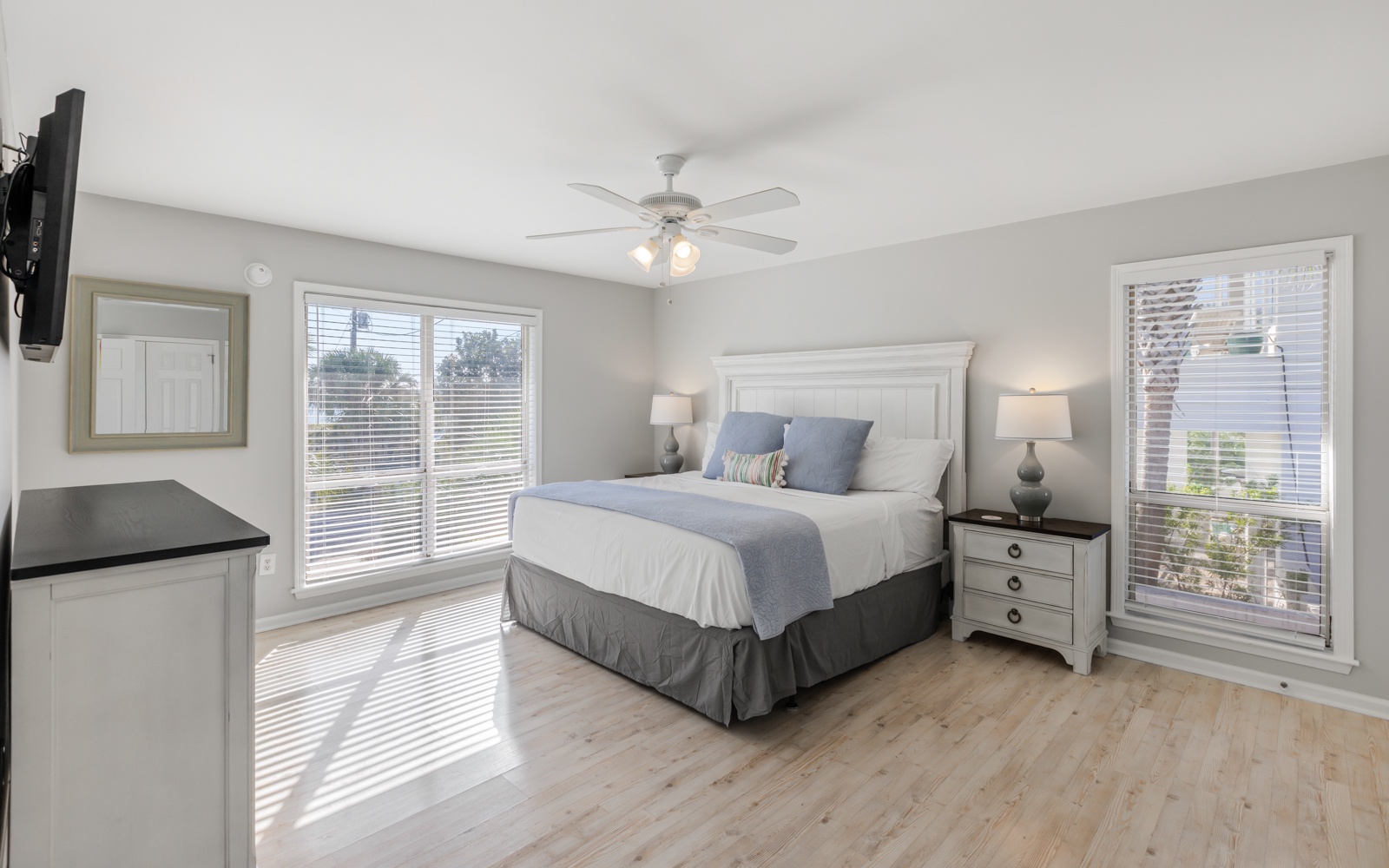 - King in 1st floor primary bedroom; full private bath; walk-in shower; TV