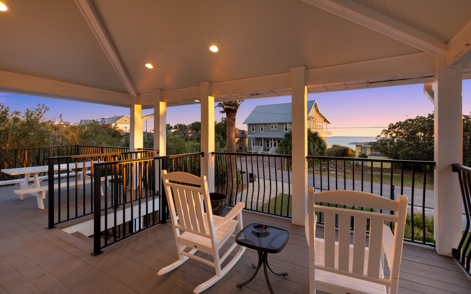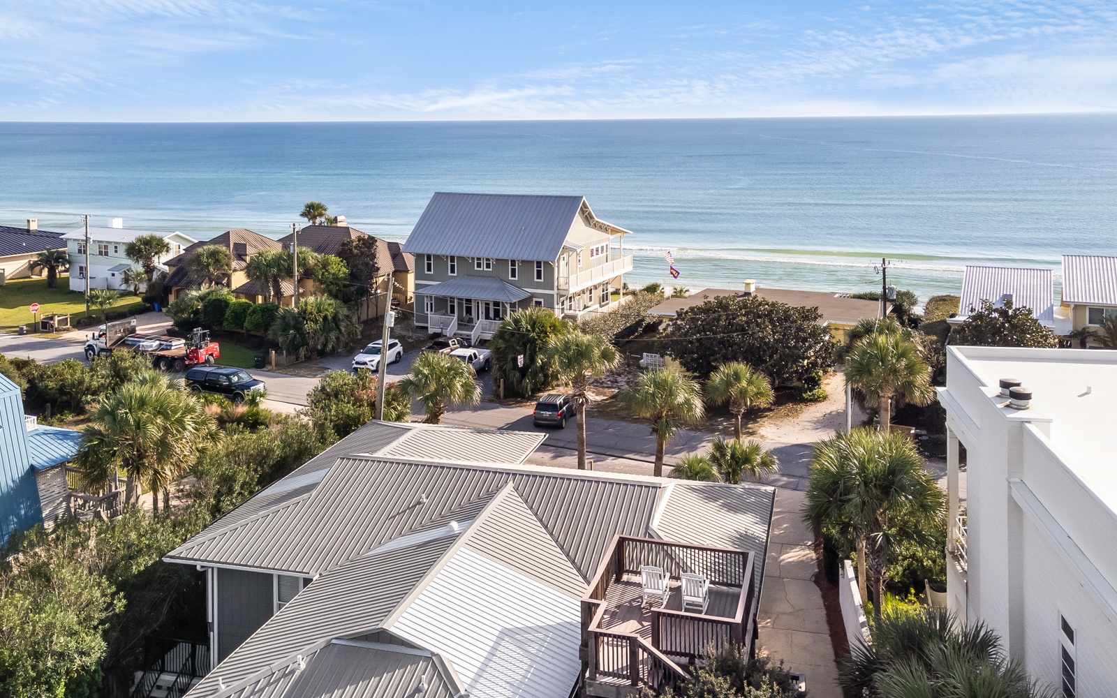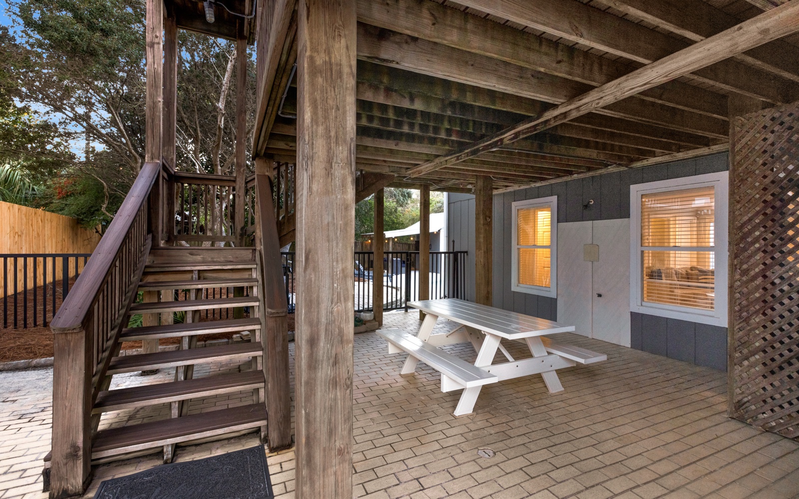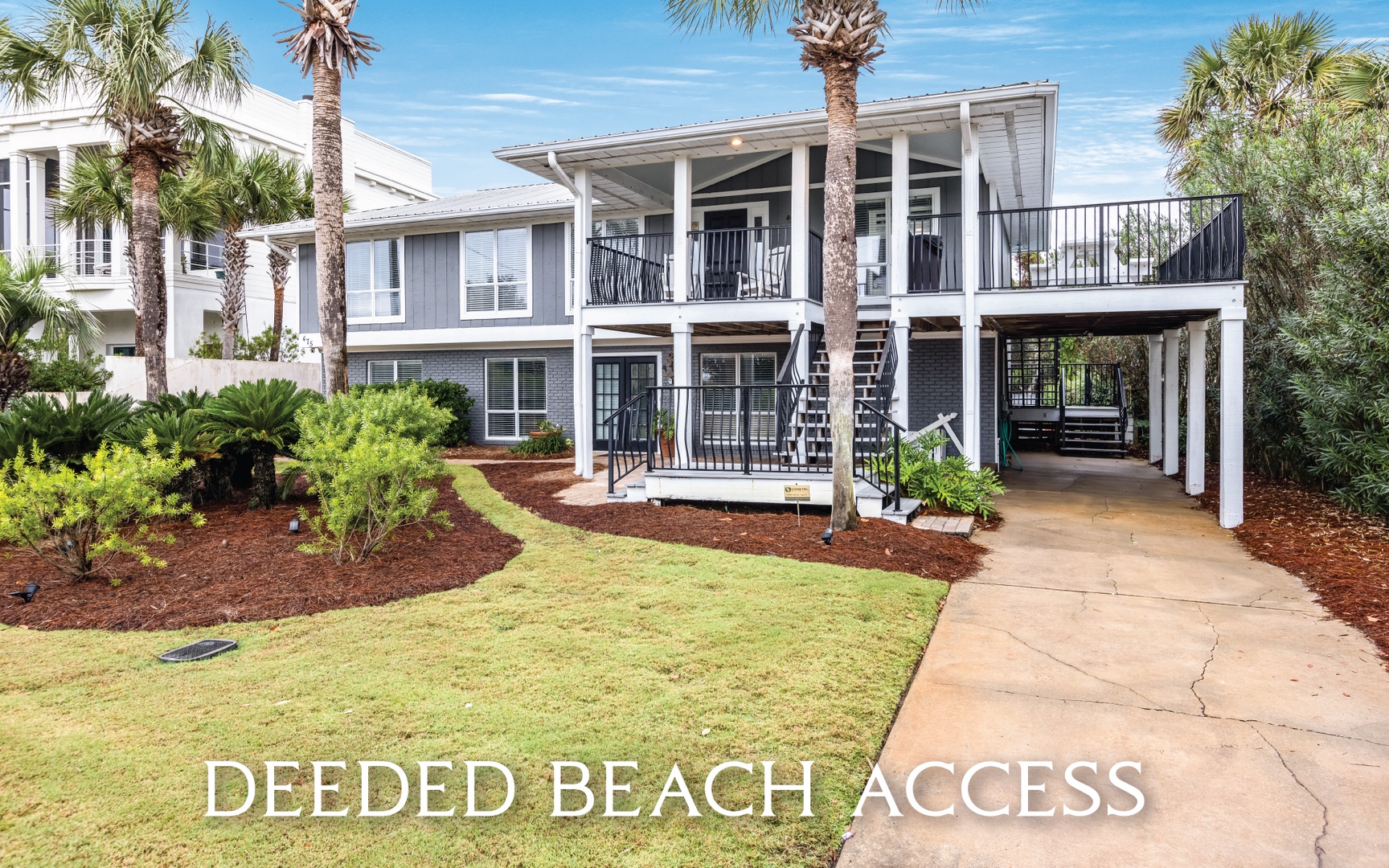 The beach is right across the street (30A), on the other side of the beachfront homes, with public beach access just a few steps away! The second-level patio, with park bench, picnic table, and rocking chairs, faces the gulf, providing a wonderful setting to enjoy the sound of the waves crashing in the distance. Two long driveways and multiple access points ensure utmost convenience.