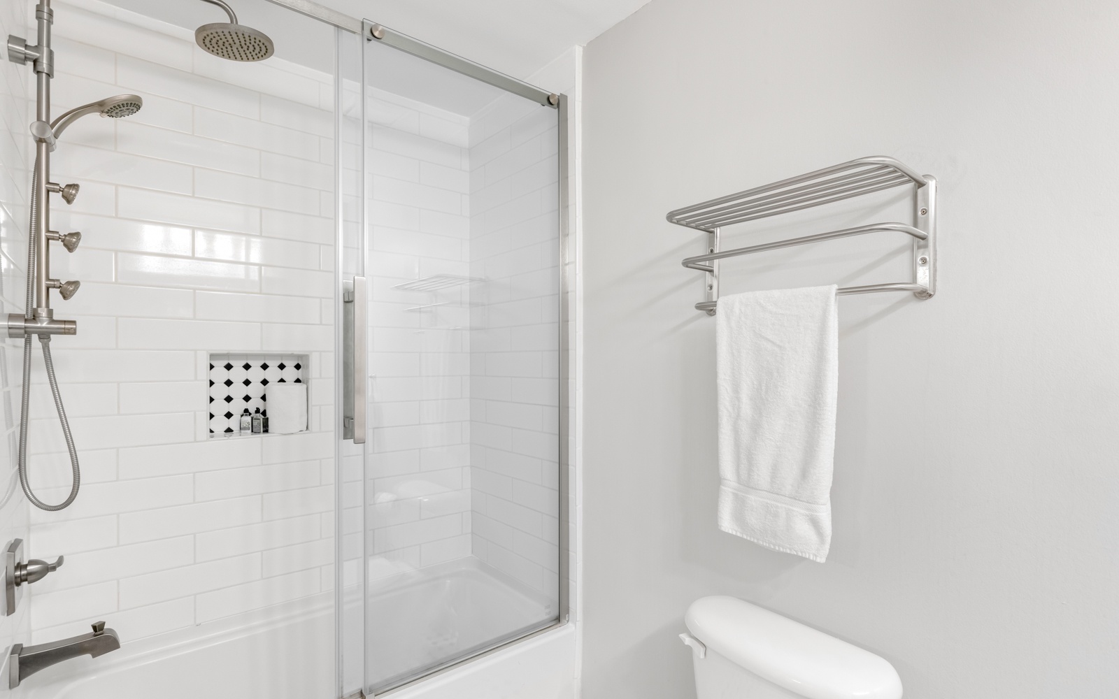 - King in 1st floor guest room; private bath; walk-in shower; TV