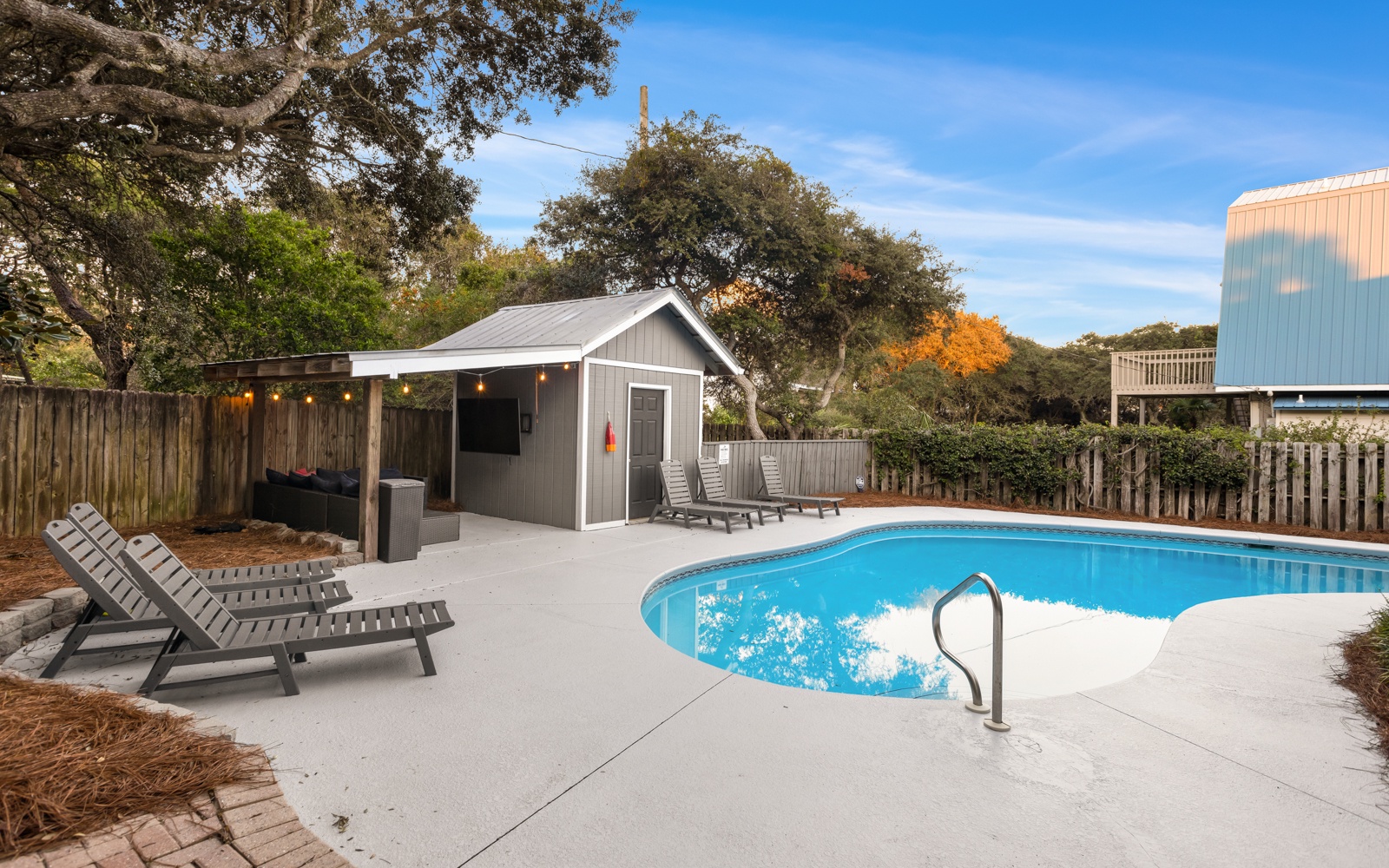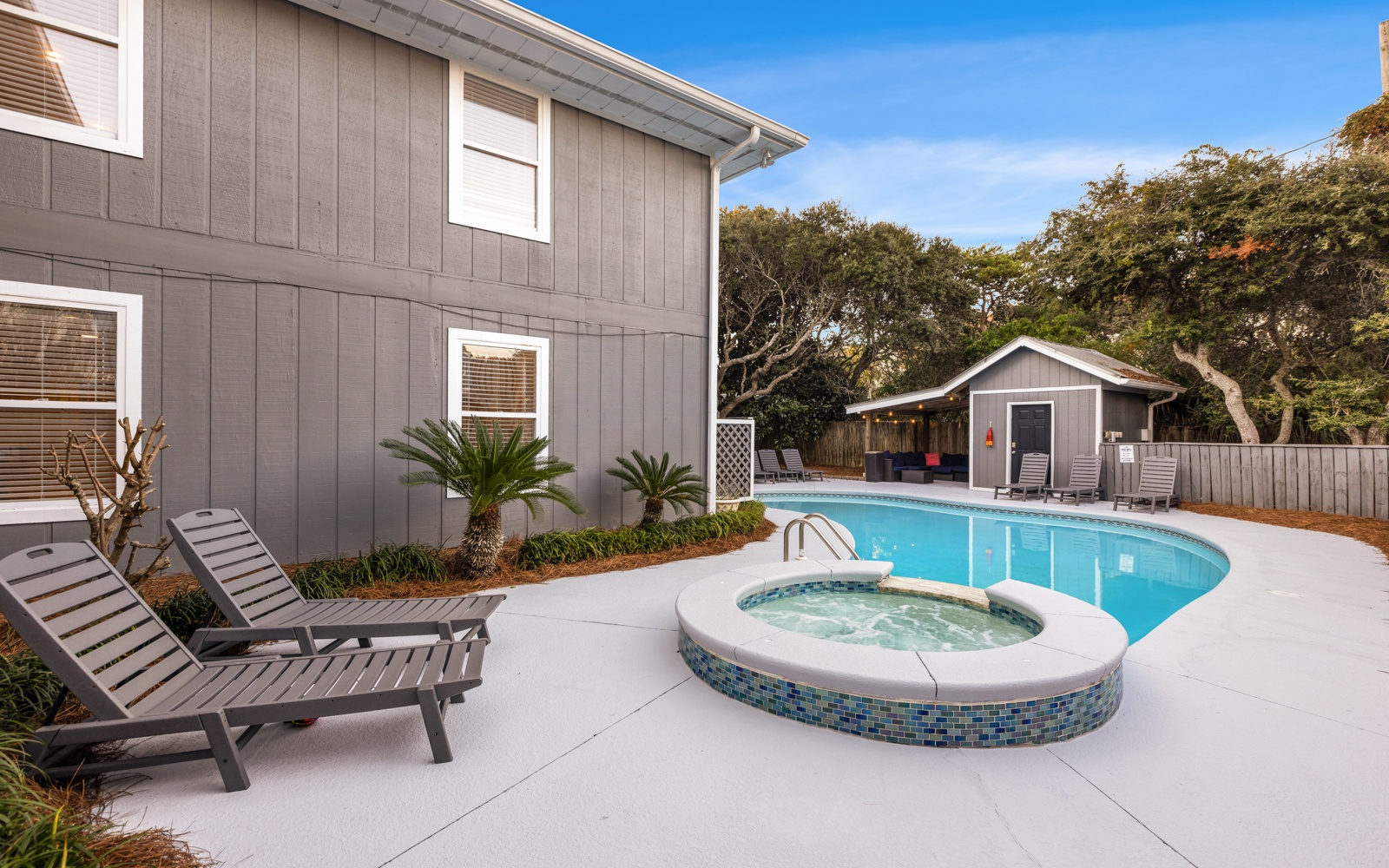 Seven sun-loungers invite you to bask in the summer sun next to the gorgeous private pool! The entertainment area also features a spa, large TV, and comfy seating, making it an ideal spot to unwind, just steps away from the serene Blue Mountain Beach.