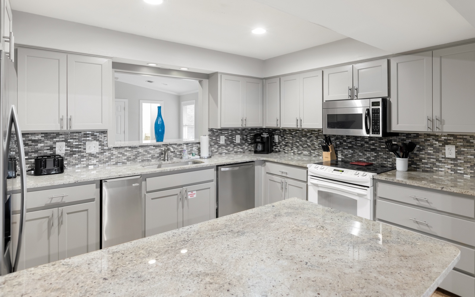 Inside is a gorgeous kitchen and dining room on the first level. On the other side of the kitchen is a comfortable living area with a sleeper sofa, large TV, and desk. The first level also includes a bunk room, with four twins, a guest room, king, and a primary bedroom, king.