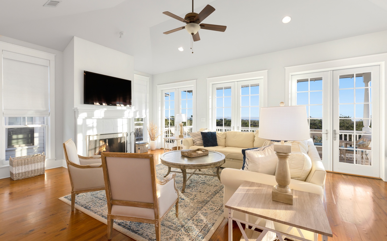 The third floor is where the magic happens—there’s a spacious kitchen and dining area, plus a living area with a fireplace and large windows that show off jaw-dropping views of the Gulf and the park’s white sandy dunes.