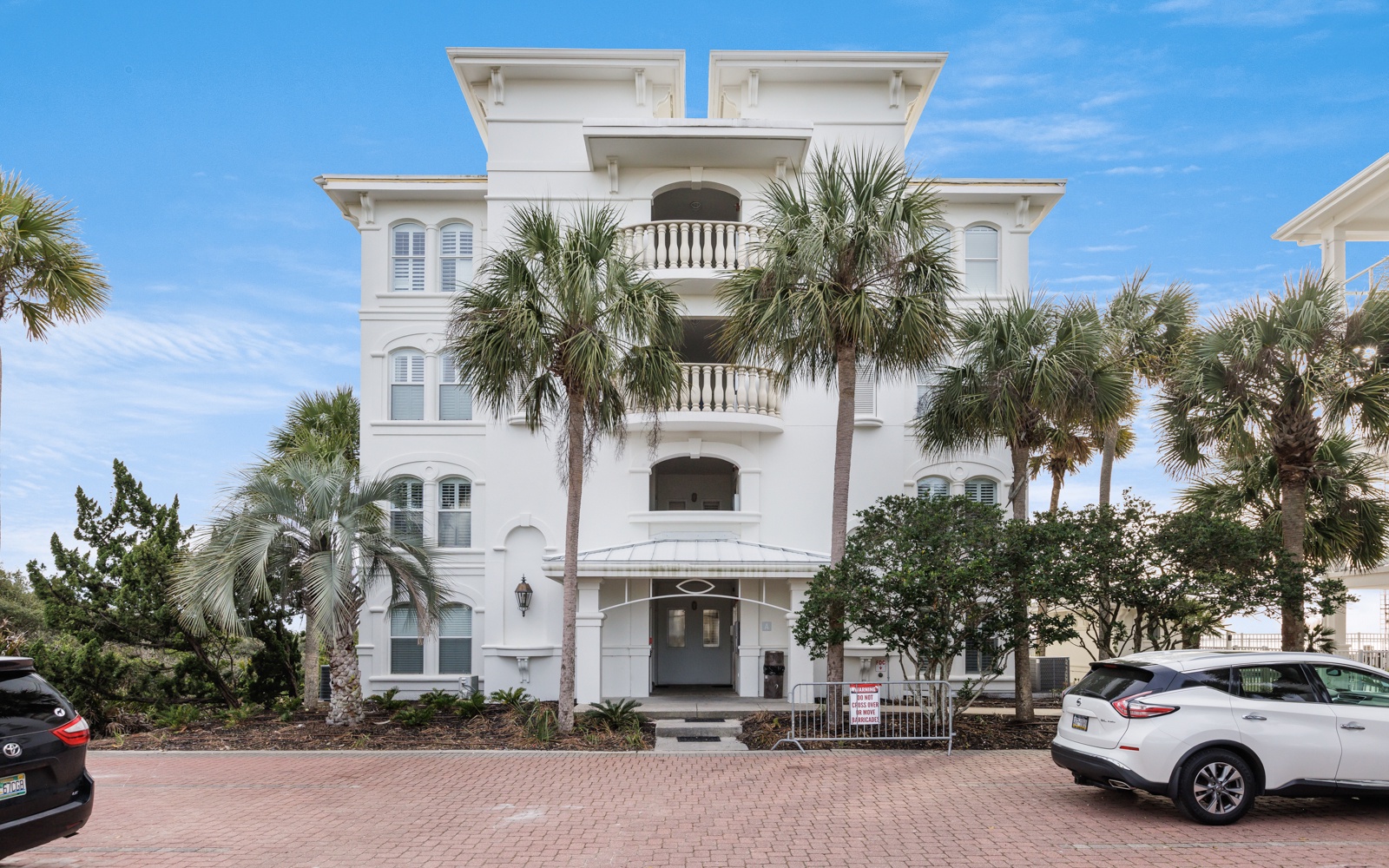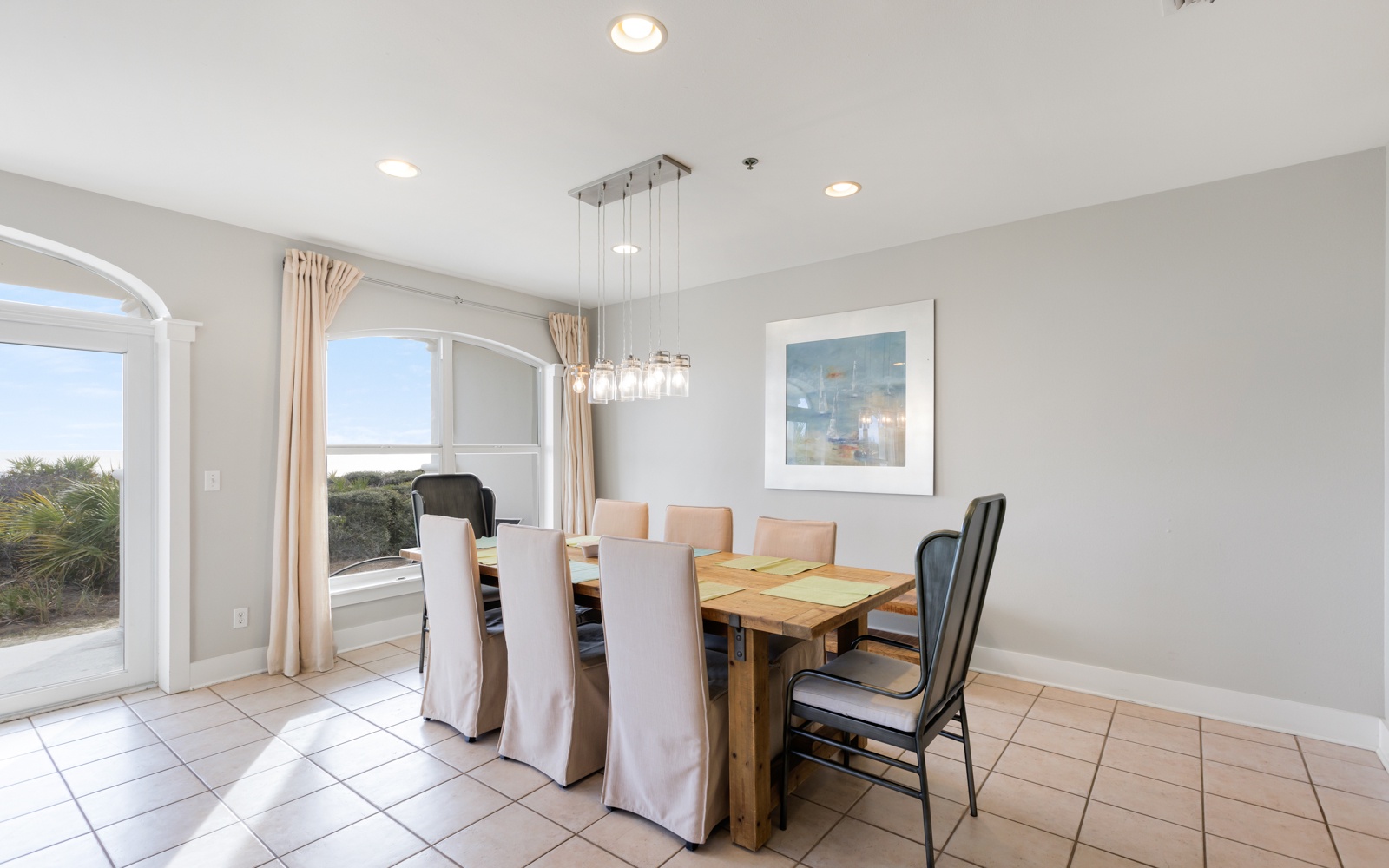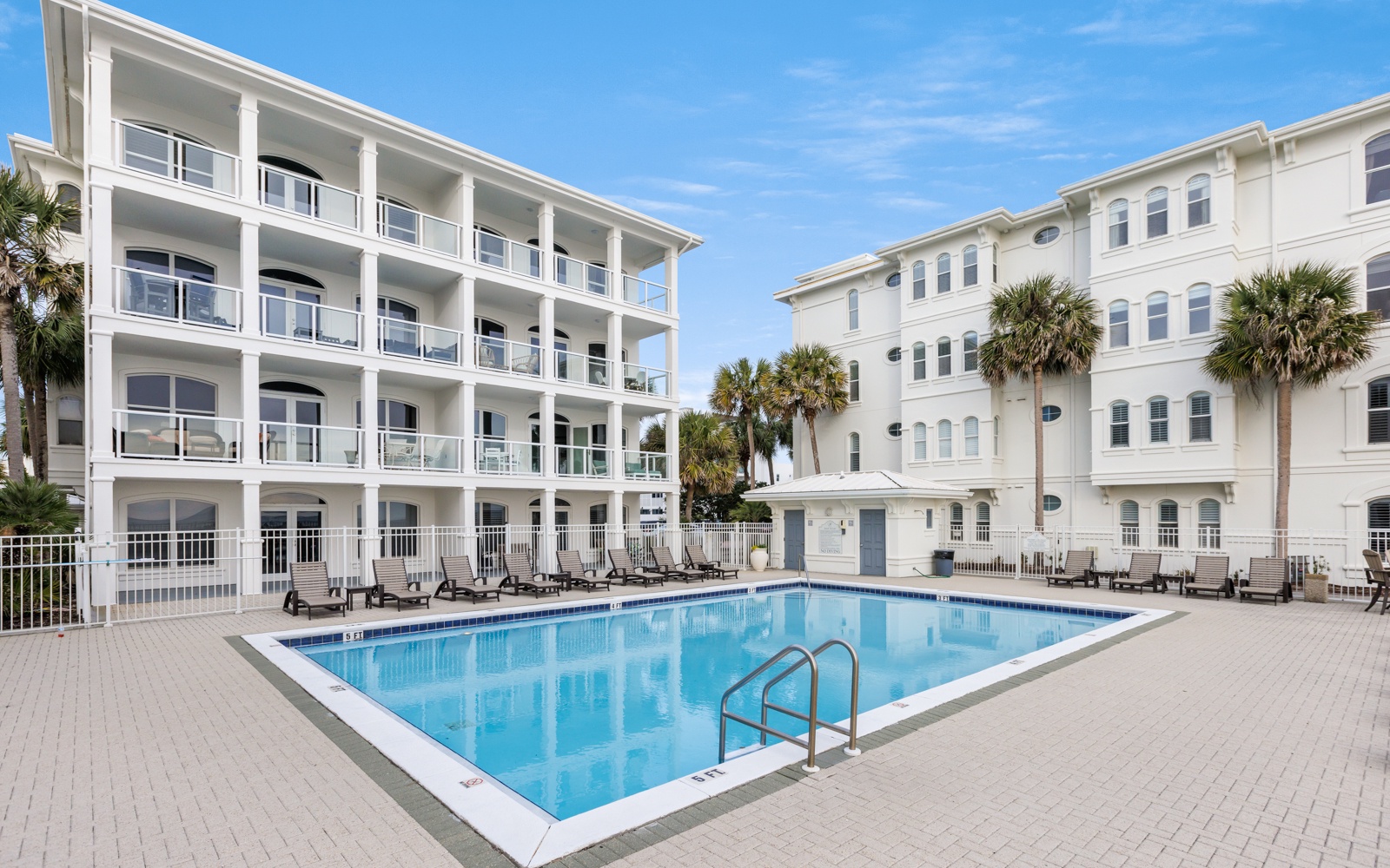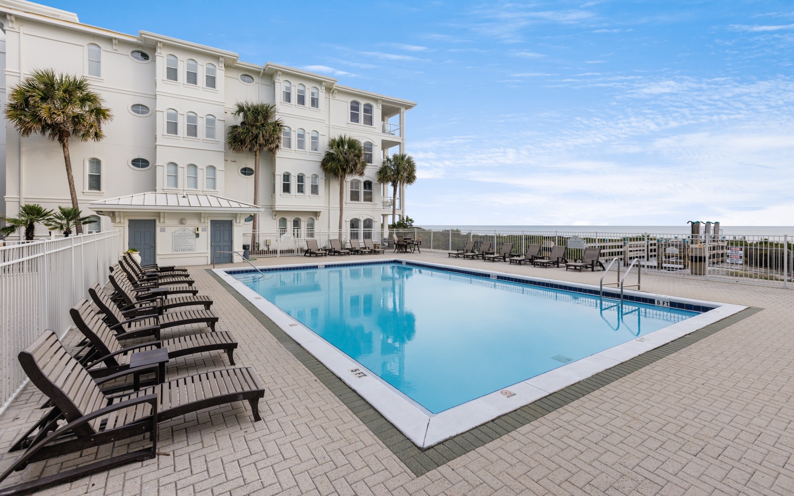 Directly off the patio is the beach boardwalk. In the other direction is the expansive brick-paved patio surrounding the community pool.
