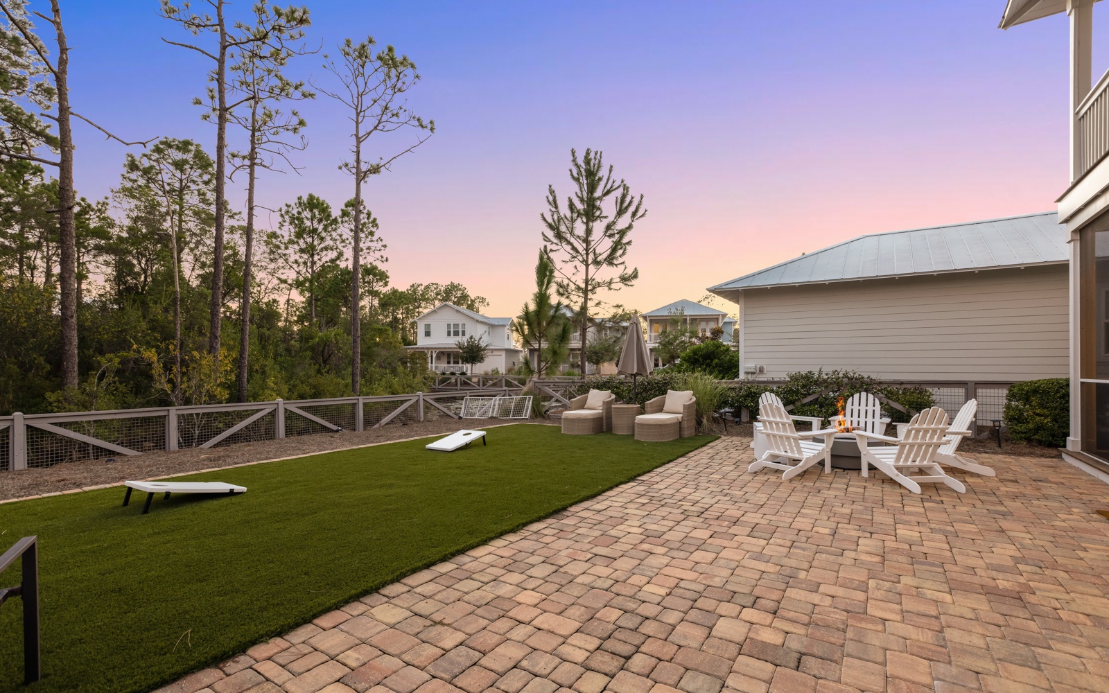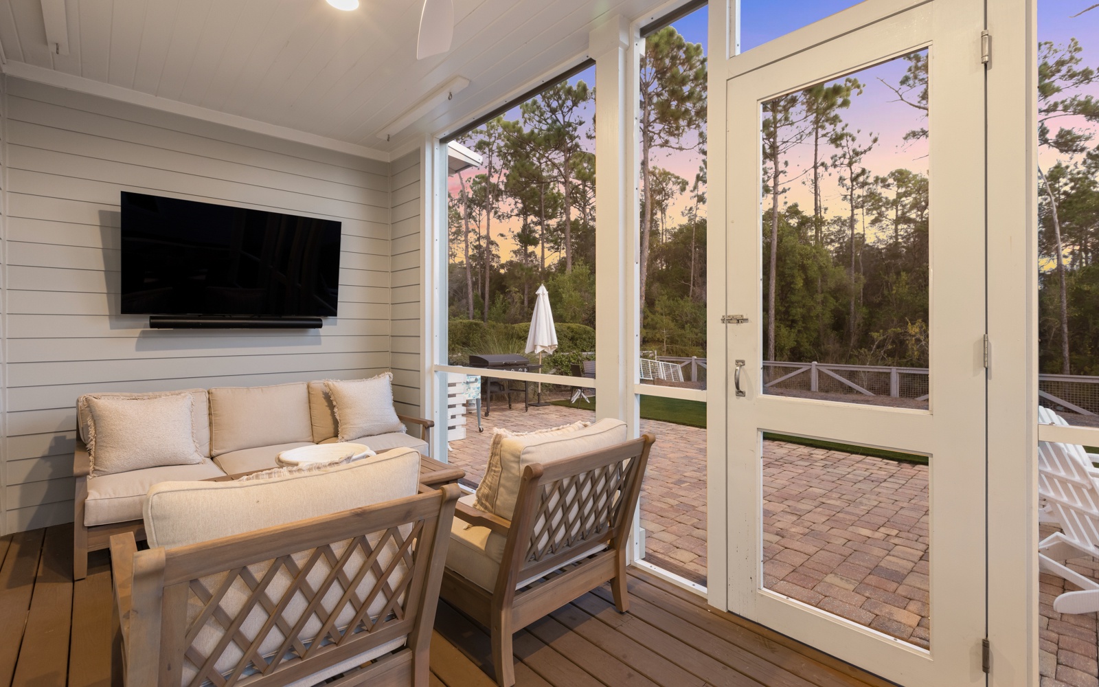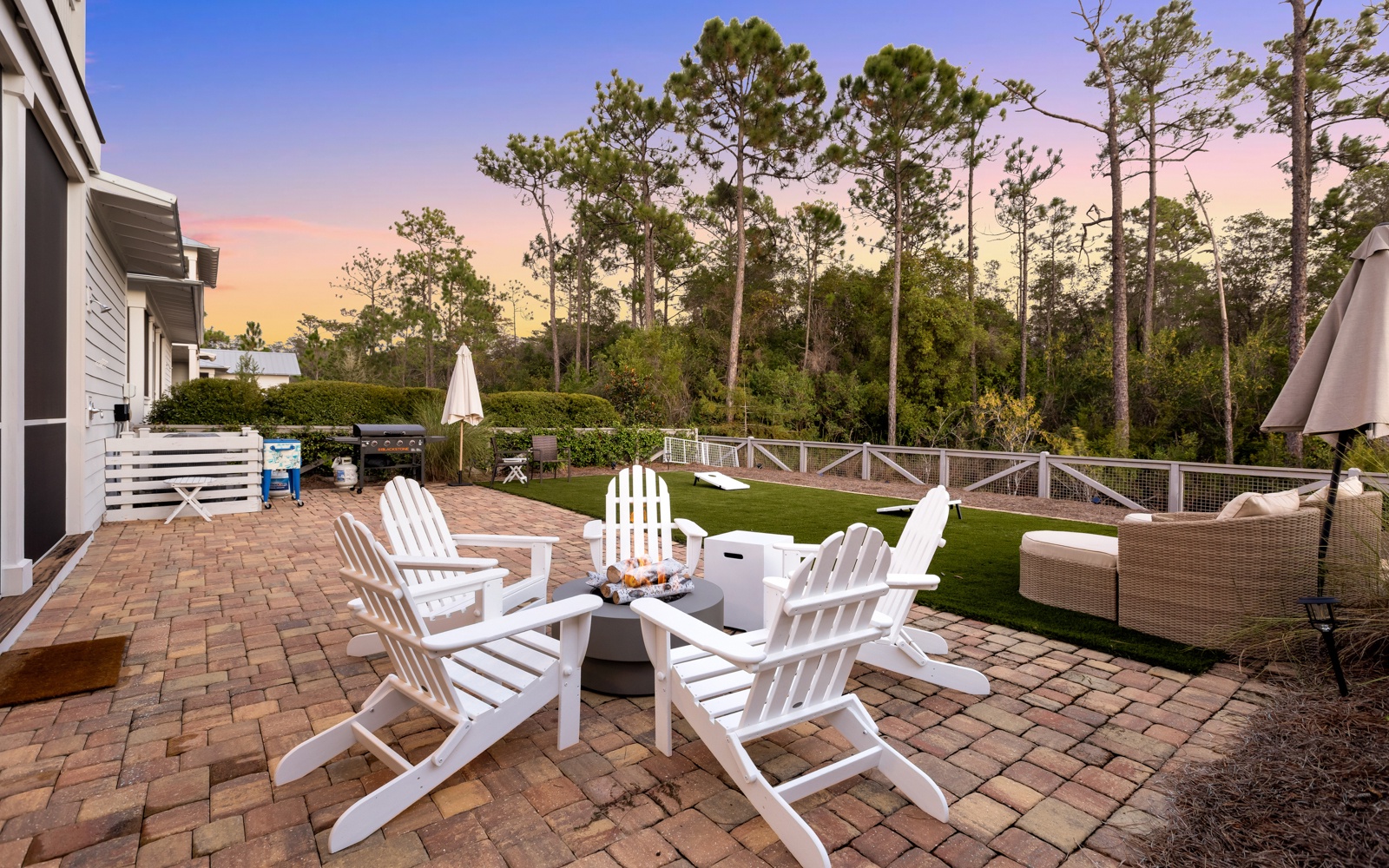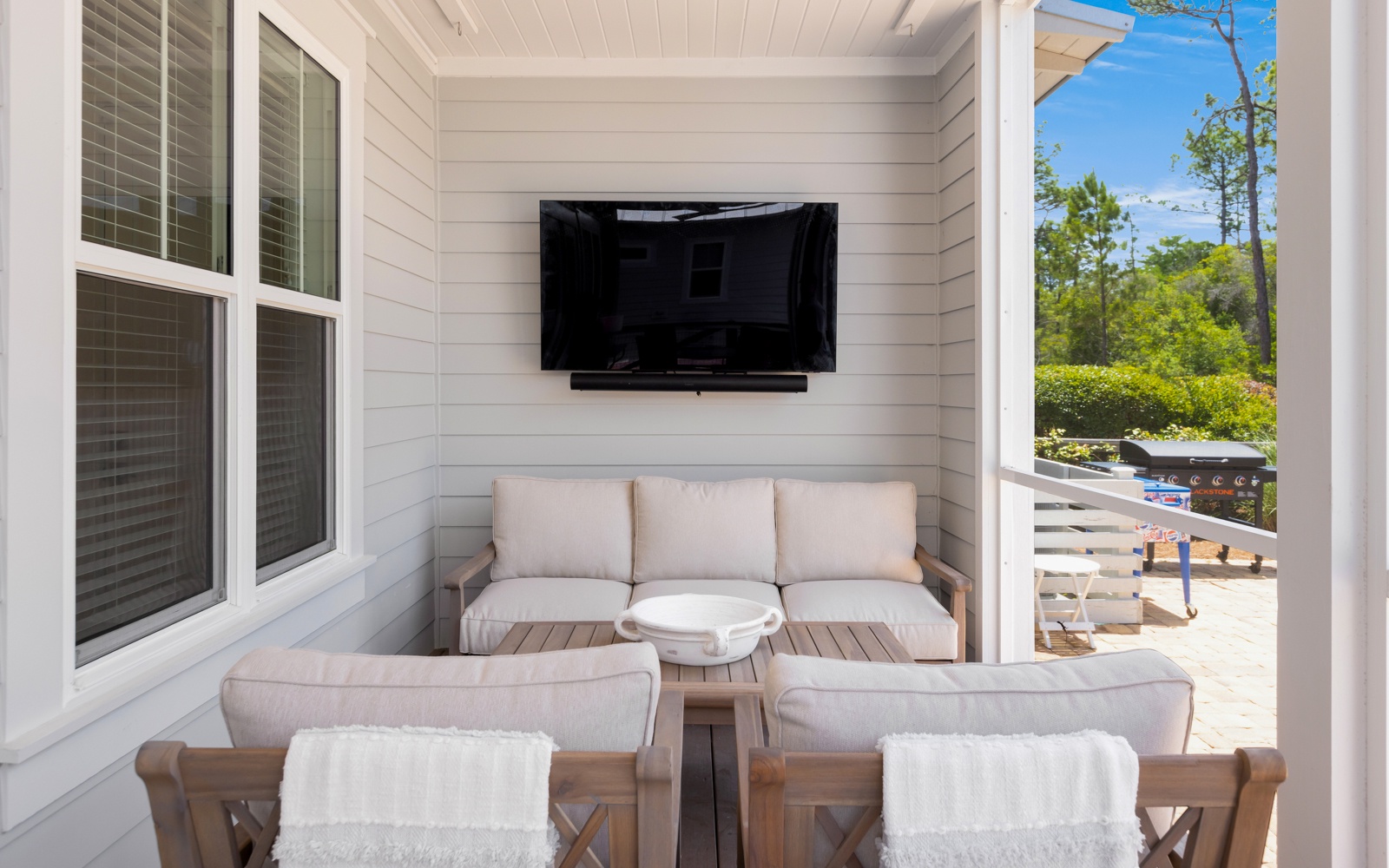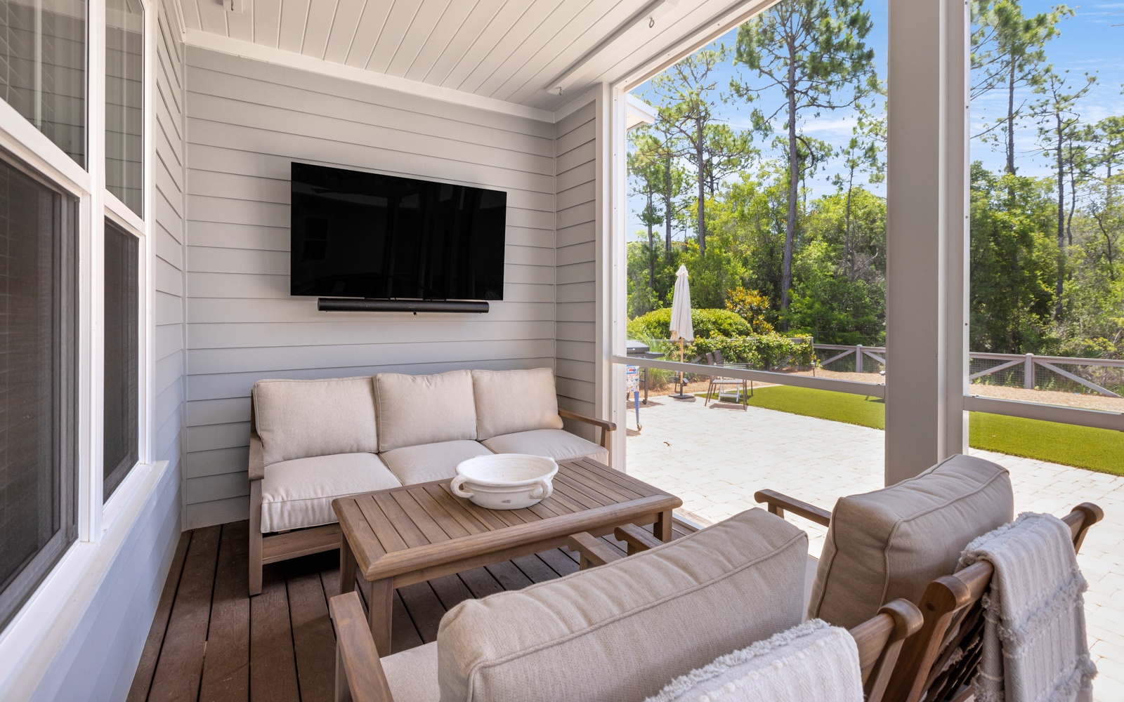 Outside, the oversized backyard is perfect for evening grill sessions and games under the stars. Catch the big game or sip your morning coffee from the screened porch – it’s your vacation, after all.