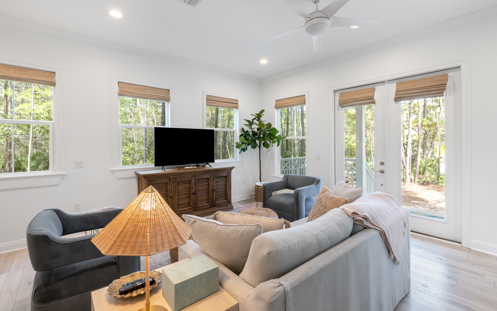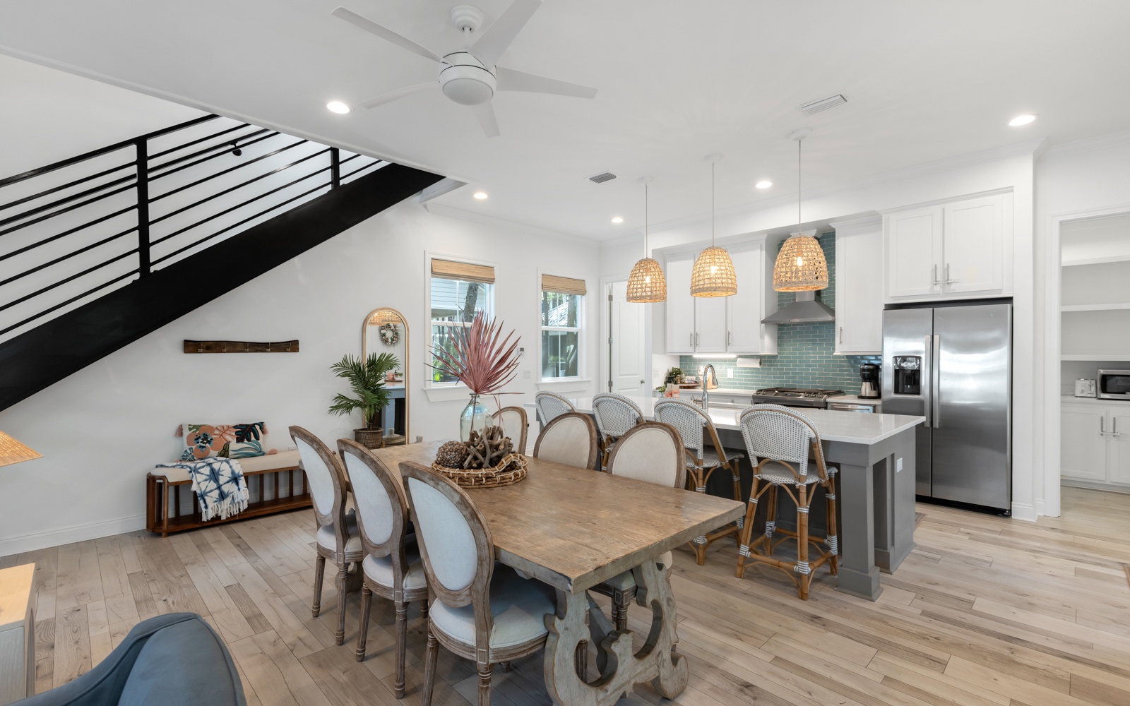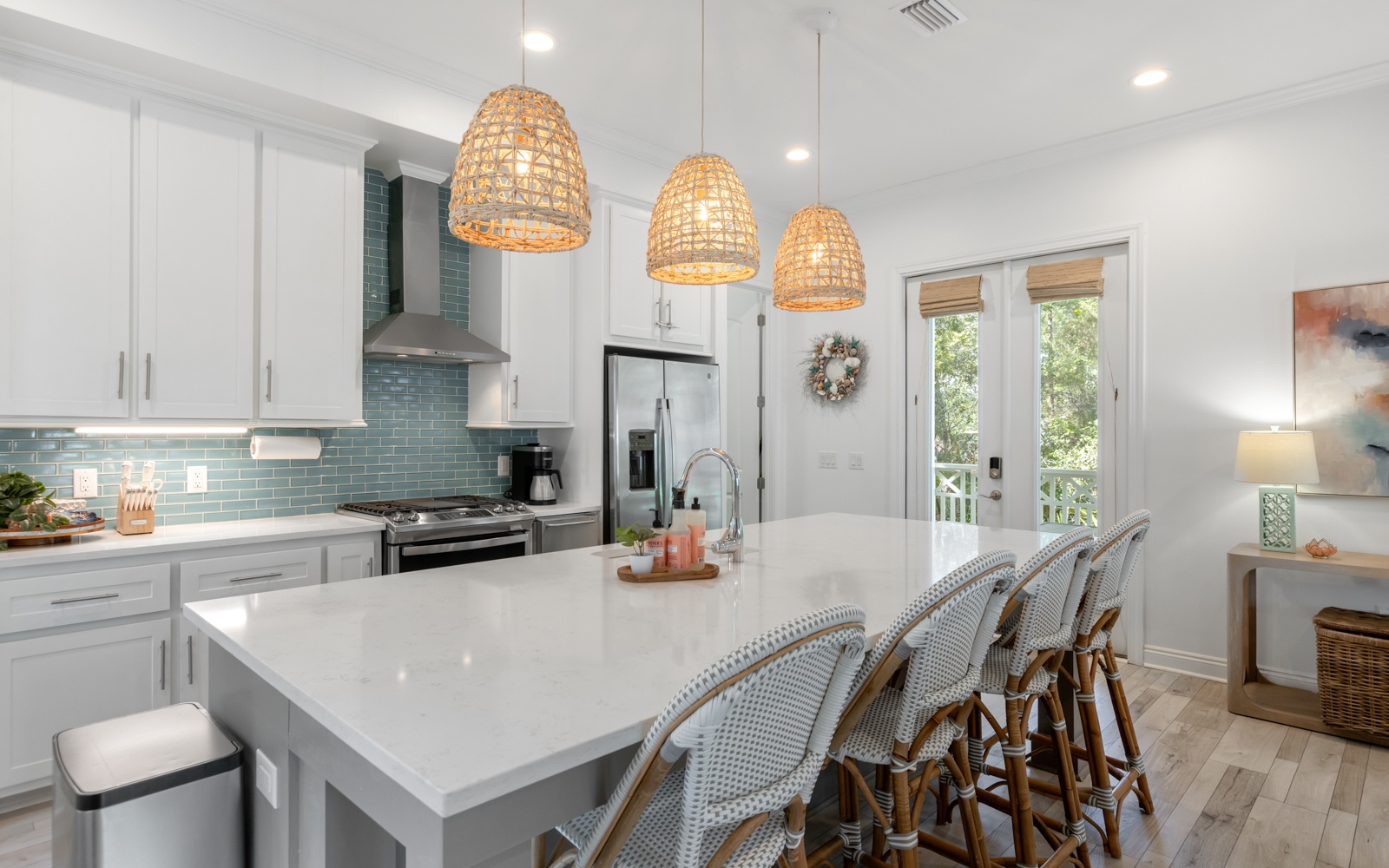 The living room on the first floor is bathed in natural light, with large windows framing the beauty of Seagrove Beach. Complete with modern appliances and a breakfast bar, the deluxe kitchen, along with the dining room, is ideal for family gatherings.