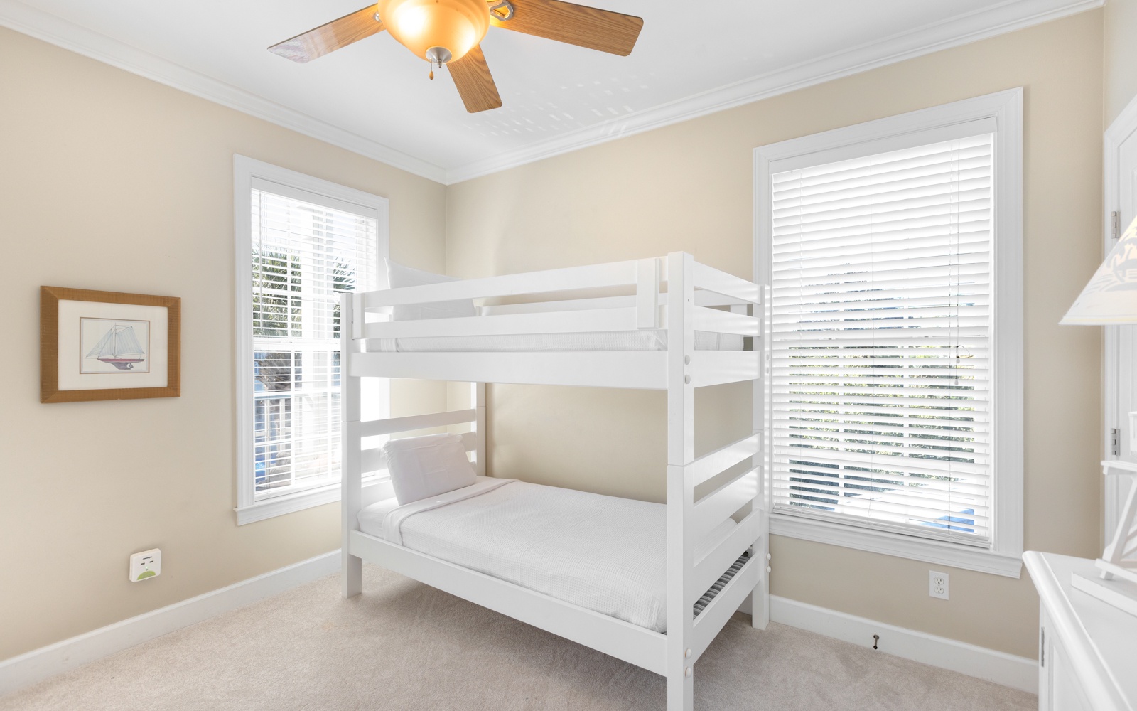 Inside, the living, dining, and kitchen area is spacious and inviting. Down the hall, a guest room, queen, includes a private bath and jetted tub. Upstairs, a primary bedroom, queen, has a shared bath with shower/tub combo. A second bedroom has 2 twins with a shared bath and shower/tub. The third floor hosts a primary bedroom, king, with a private bath and a shower/tub.