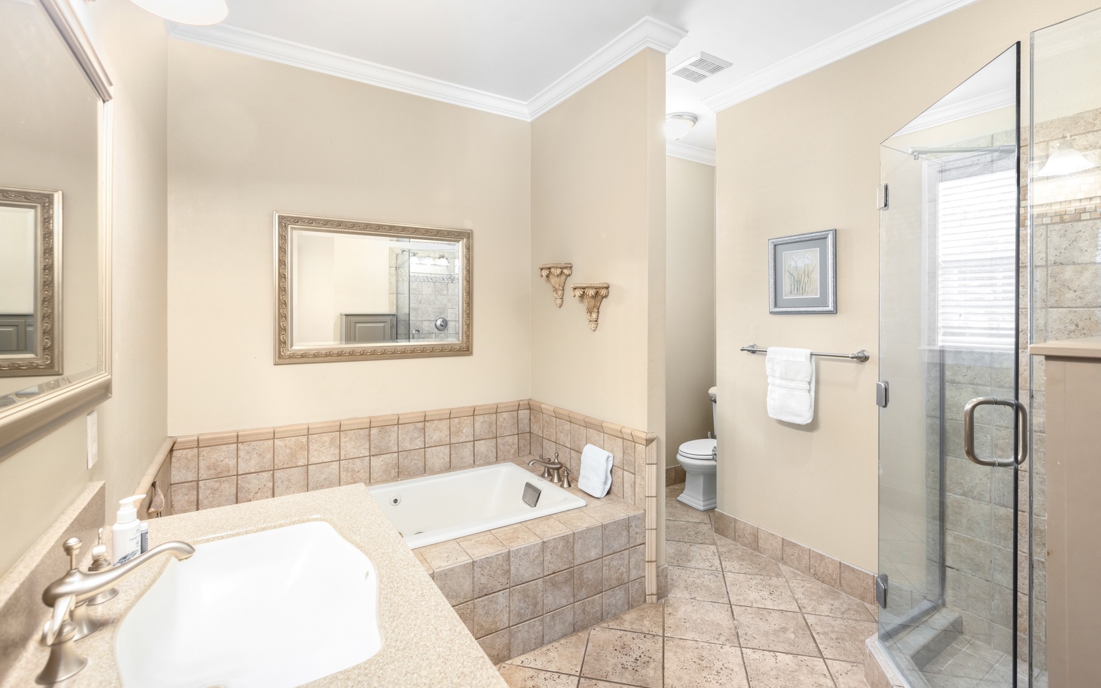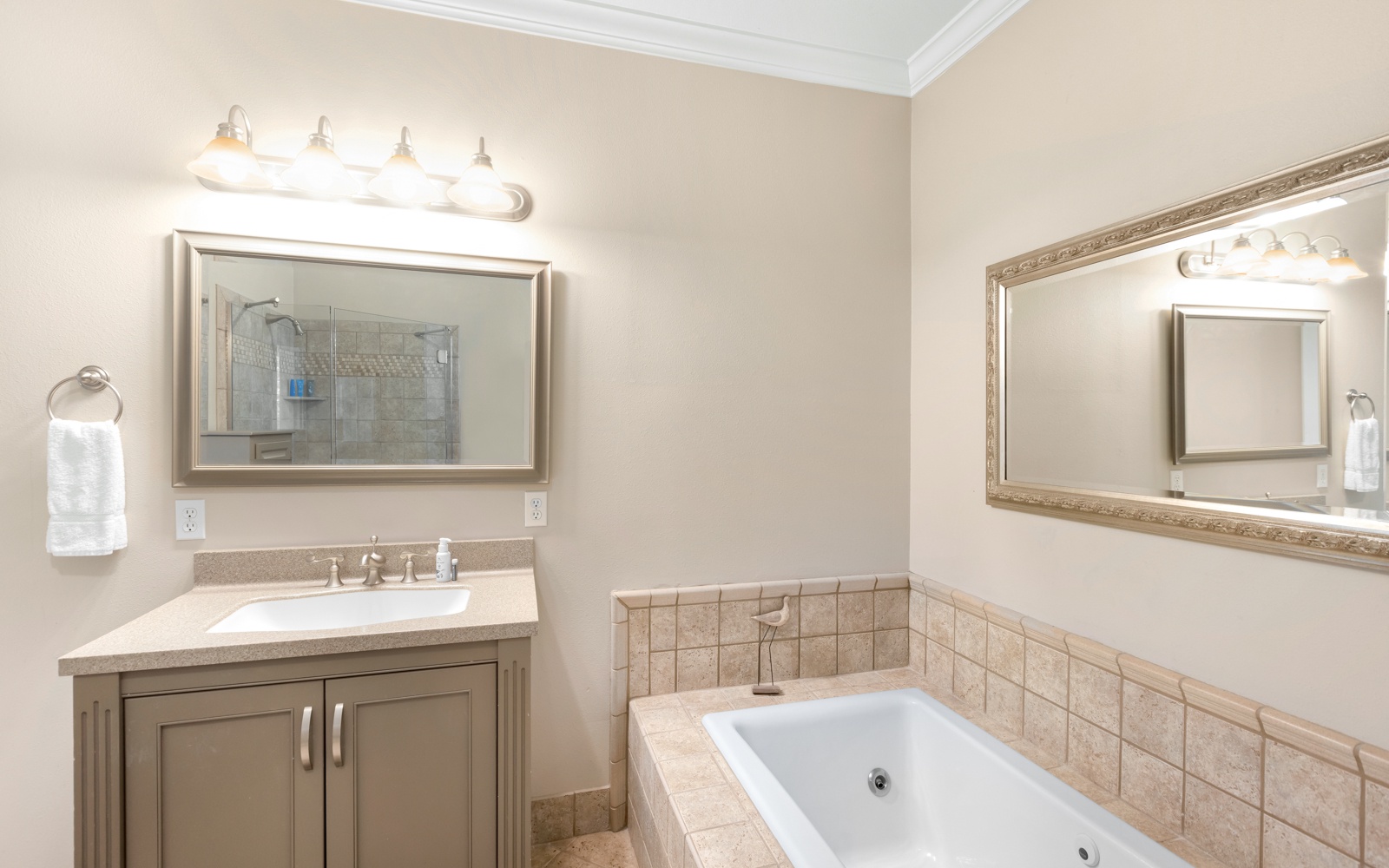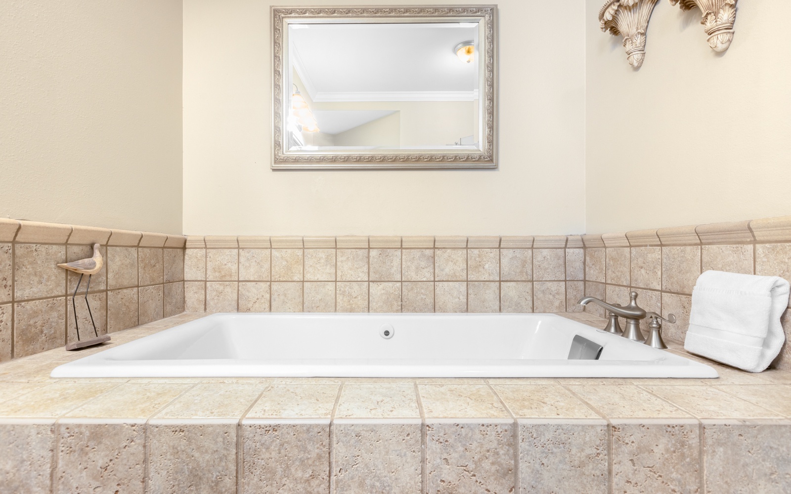 - Queen in 1st-floor primary bedroom; private bath with jetted tub; TV (32")