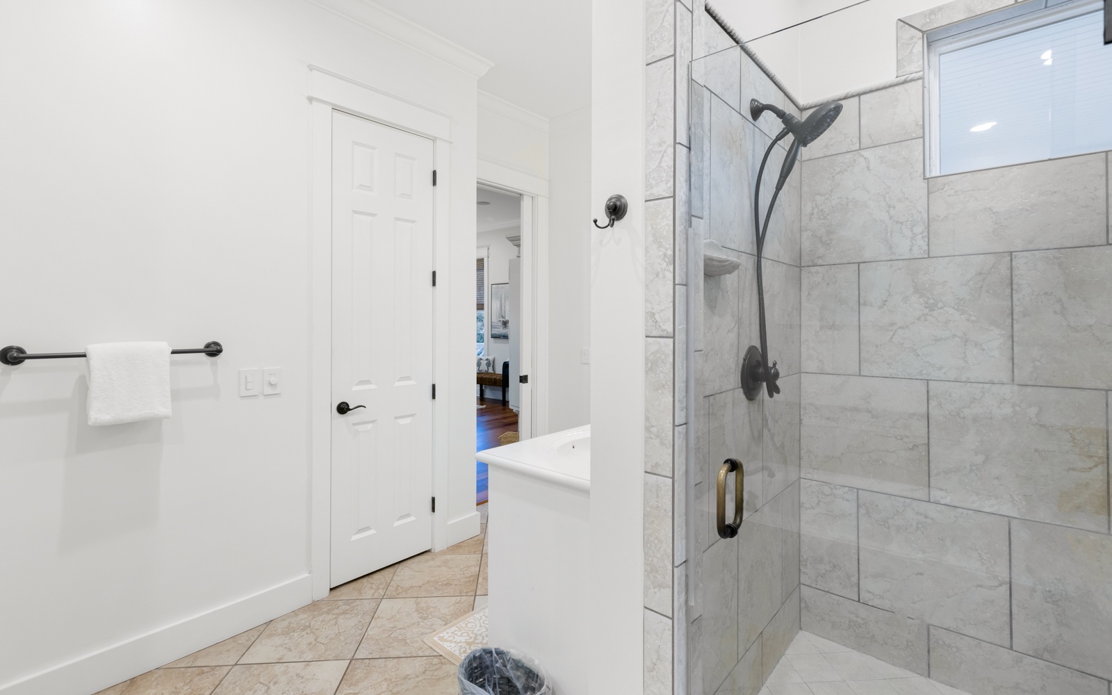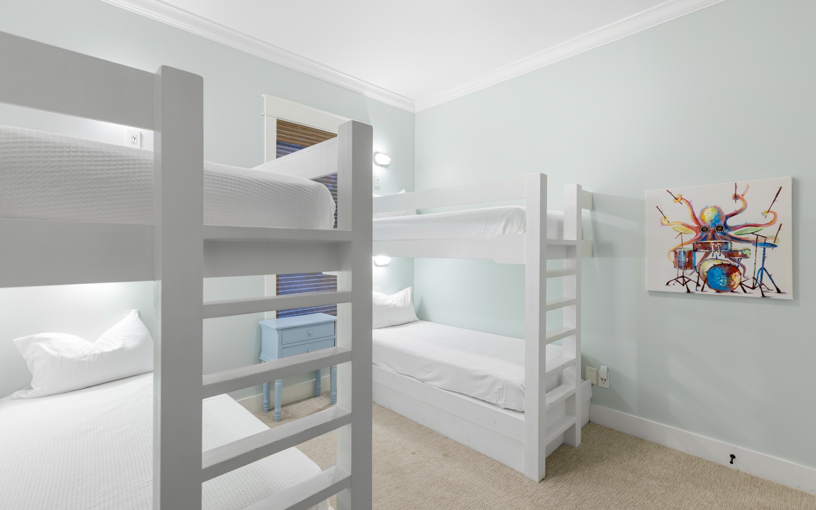 A guest room, queen, is on the first floor, and a stunning primary bedroom, king, with a private ensuite, is on the second floor. The guest rooms on the second floor include a bunk room and a double twin room, providing ample space for everyone to unwind.