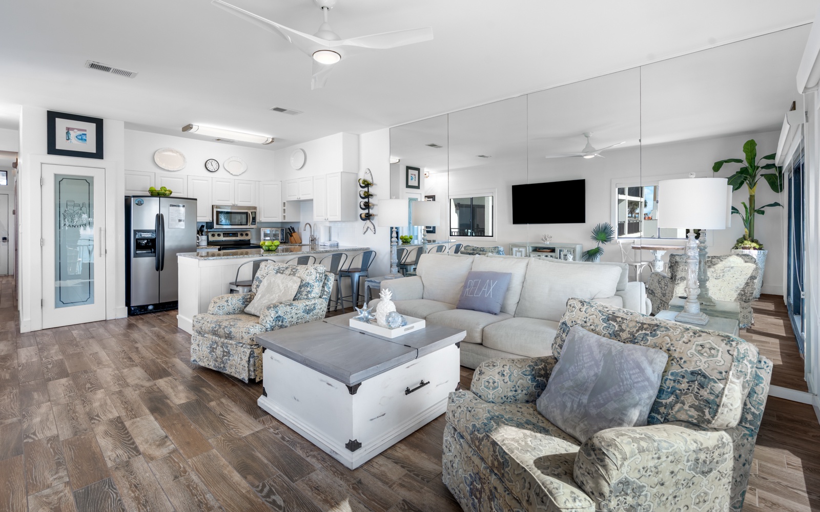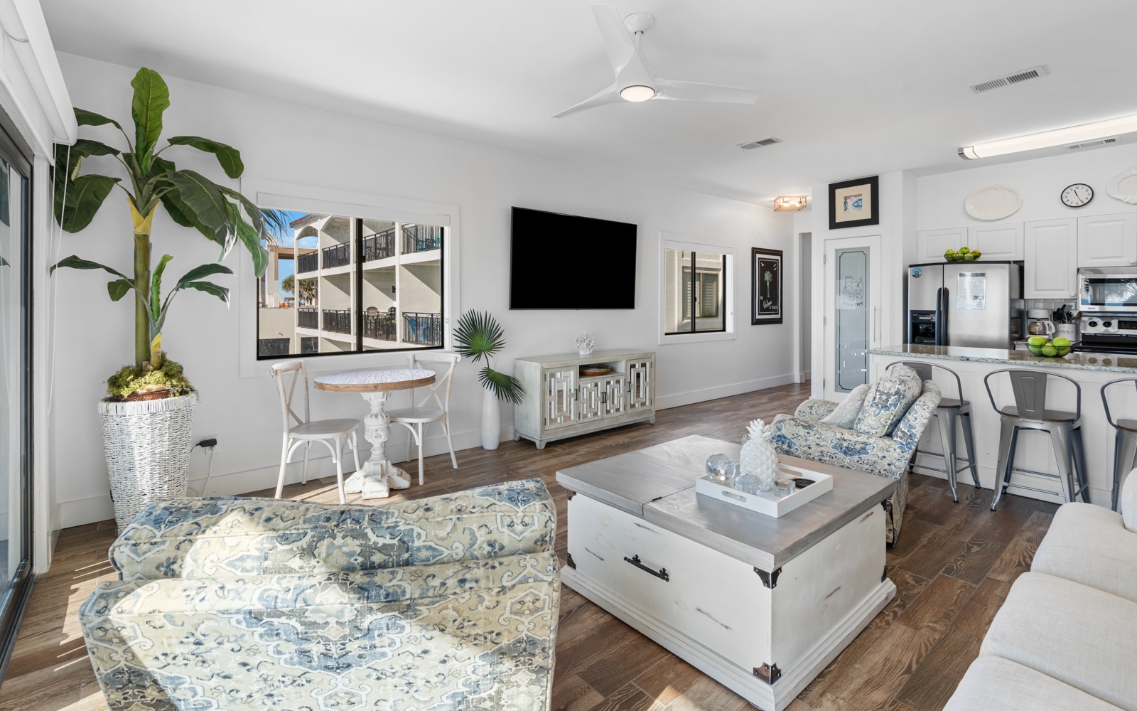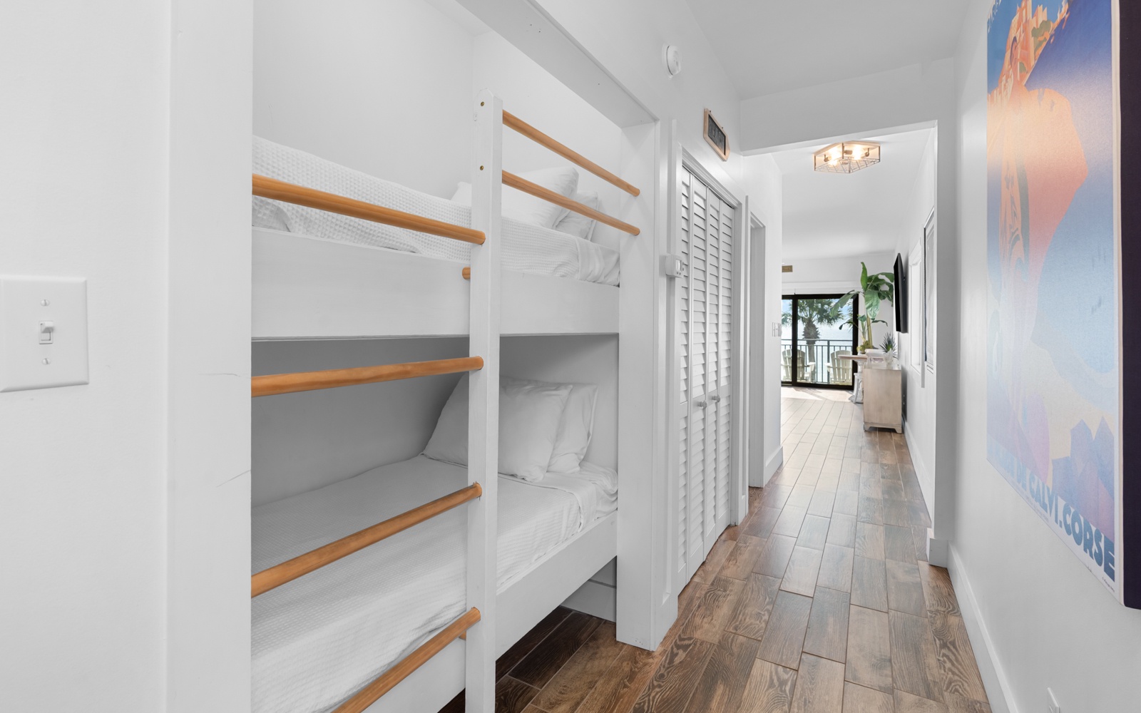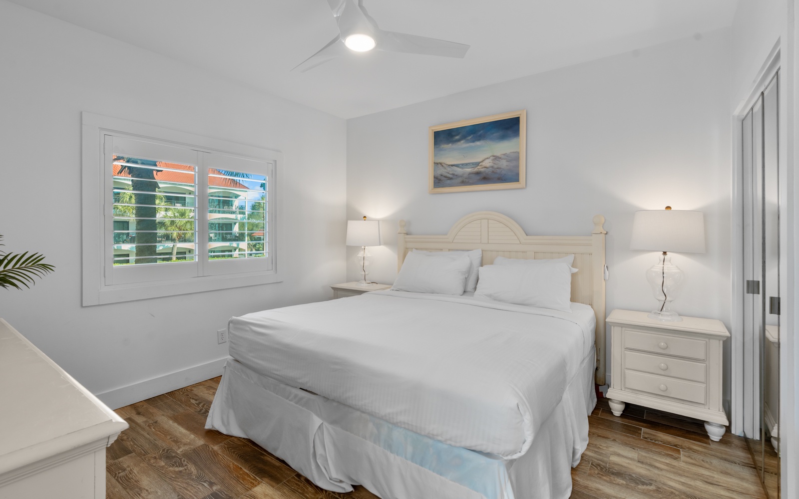 The Palms comfortably accommodates four guests, with a primary bedroom suite, king, and two cozy twin bunks, perfect for kids or young adults.