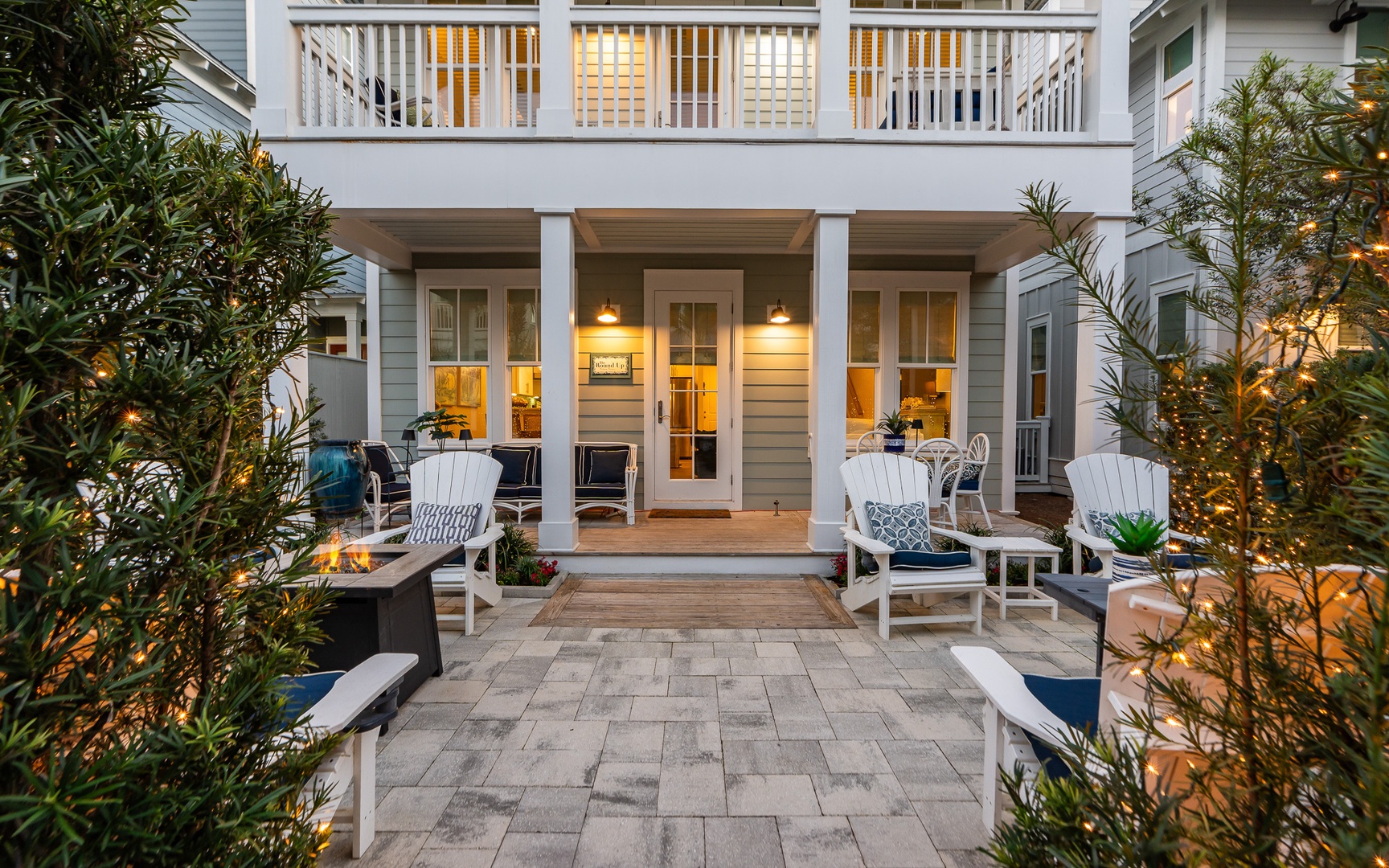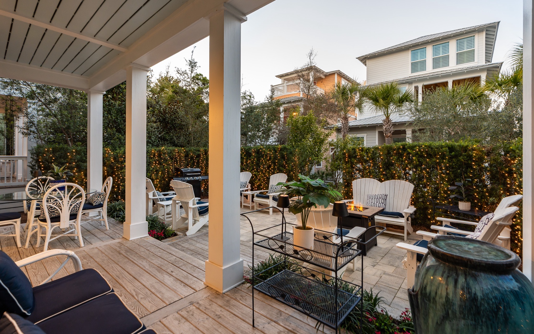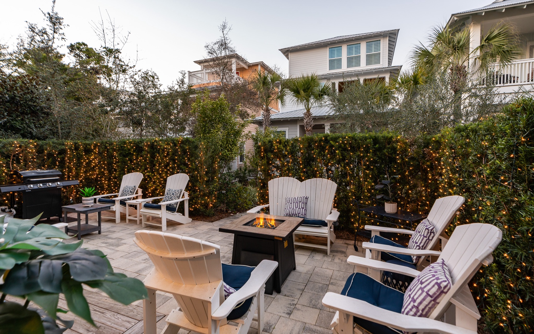 Relax and reconnect on the covered front porch, in the cozy living room, or in the loft, with a seating area and TV on the upstairs landing. Outside, unwind in the shade of the covered porch, which comfortably seats seven, or bask in the Florida sunshine on the expansive patio or gather around the fire pit.