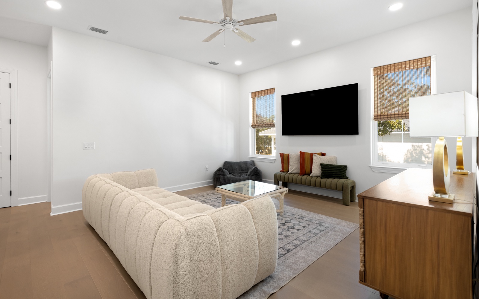 Inside, two living areas offer room to spread out, and the sleek kitchen is fully equipped and wide open, perfect for waffle mornings, cocktail hours, and everything in between.