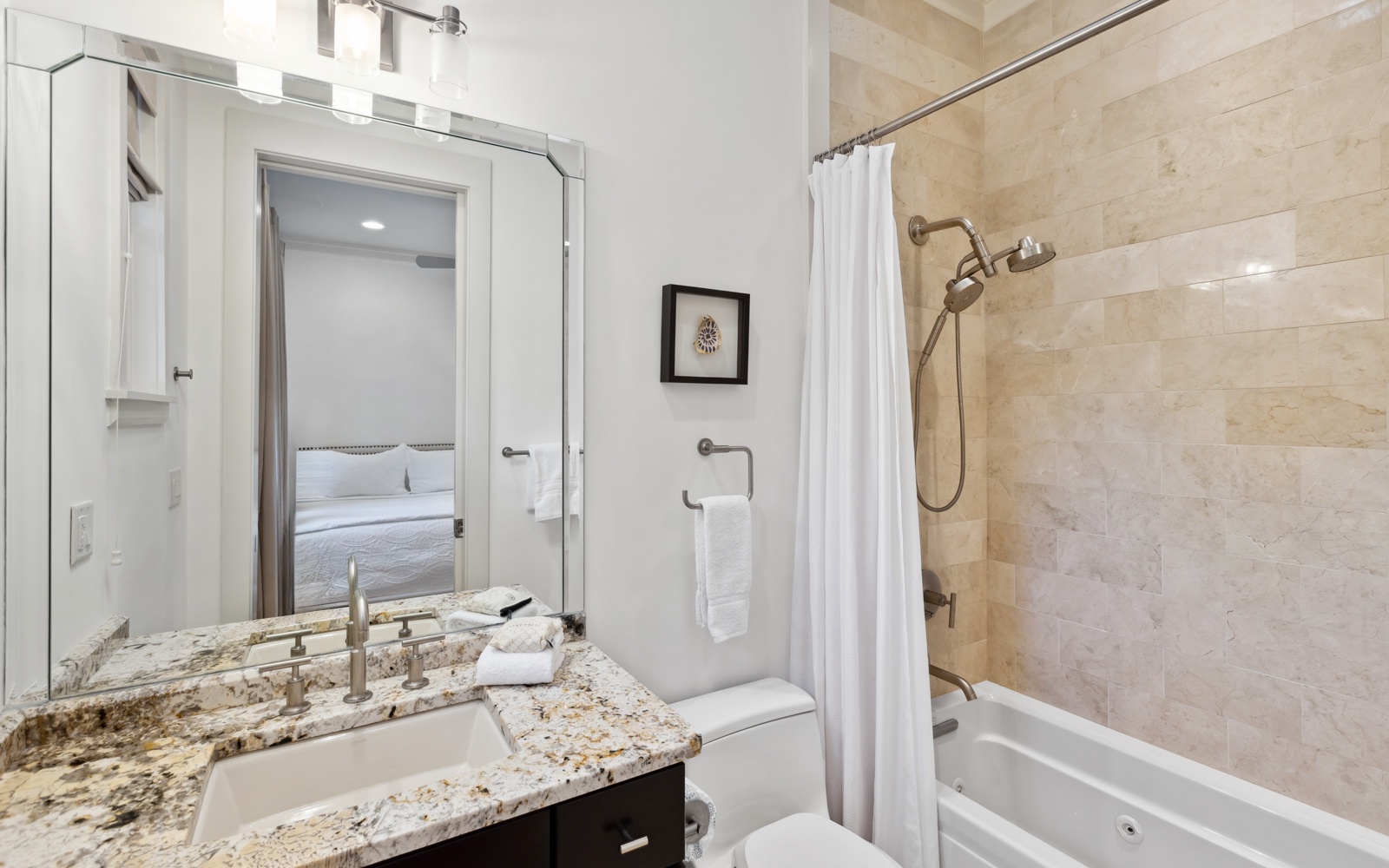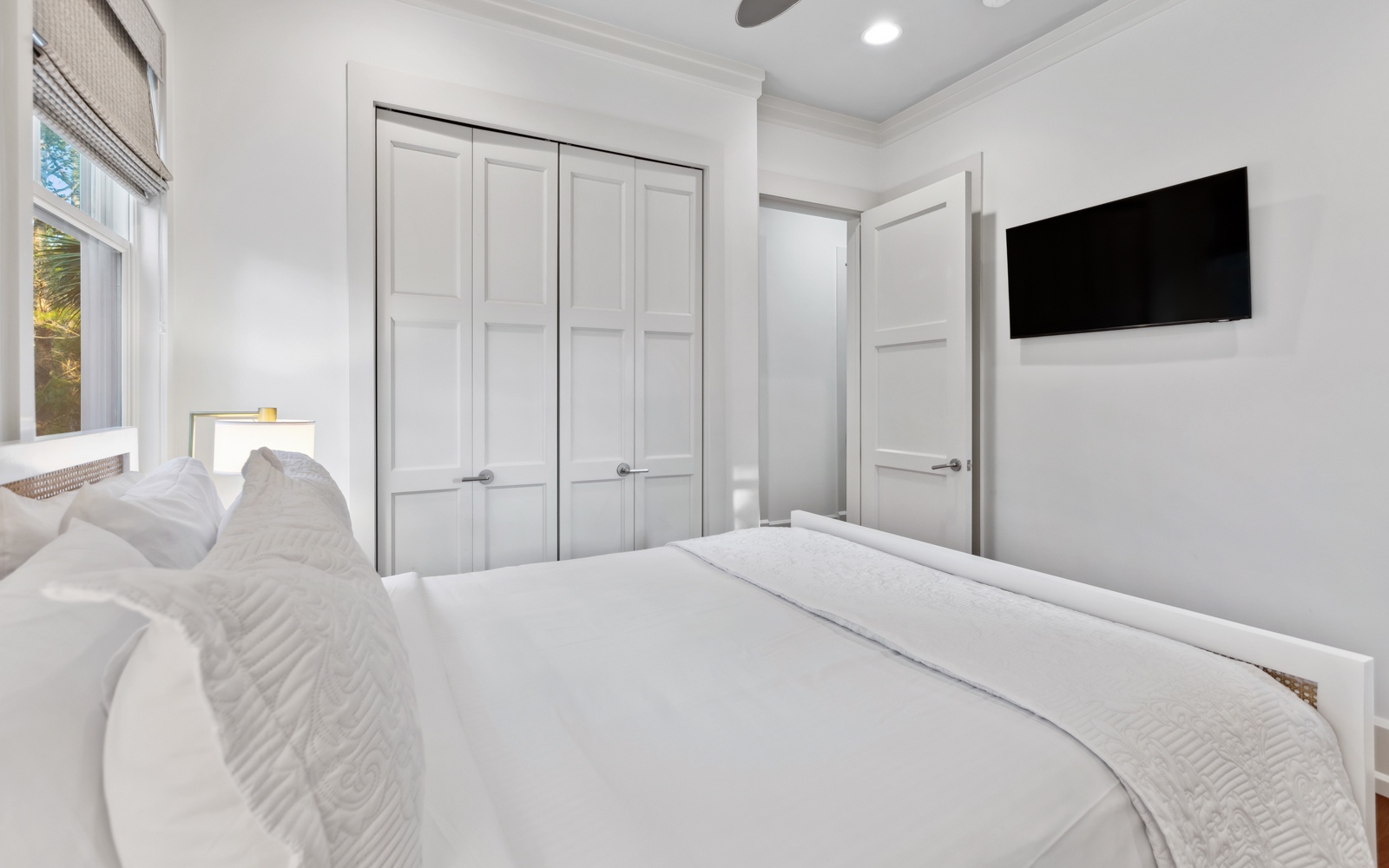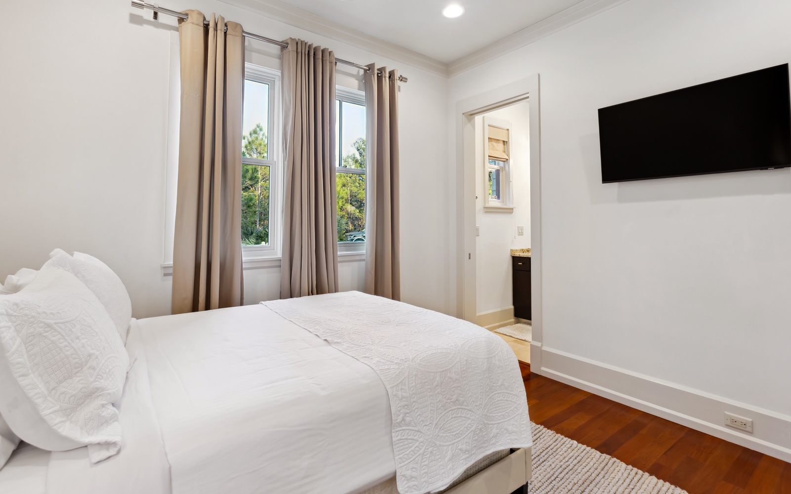 - Primary Bedroom: King bed, private bathroom, shower, soaker tub, TV