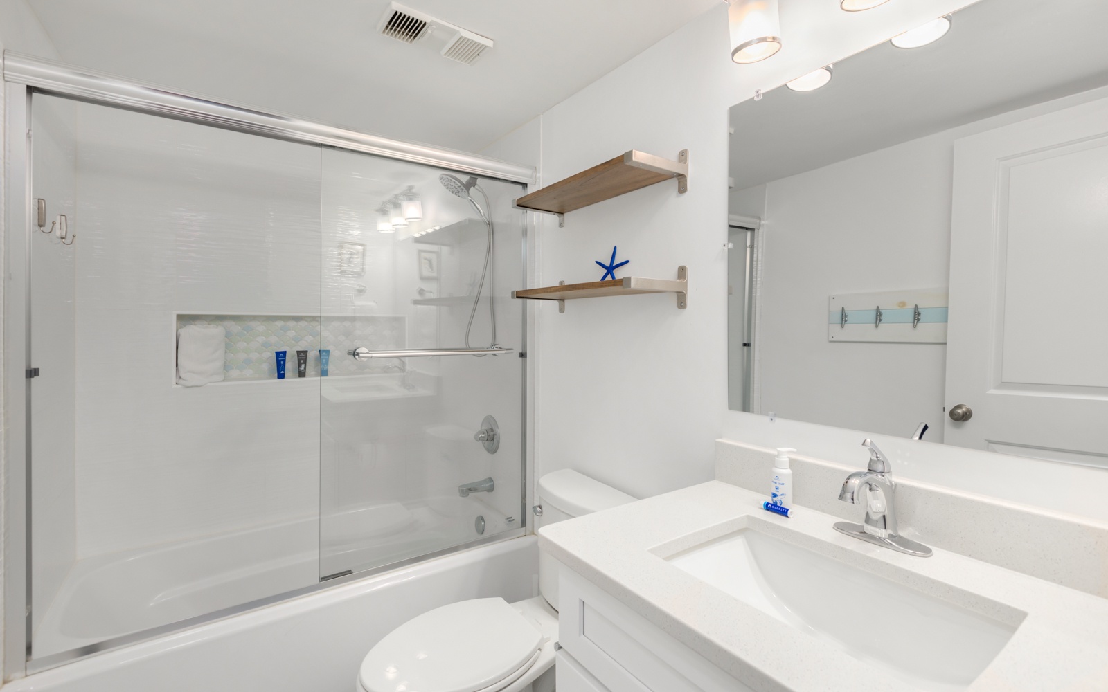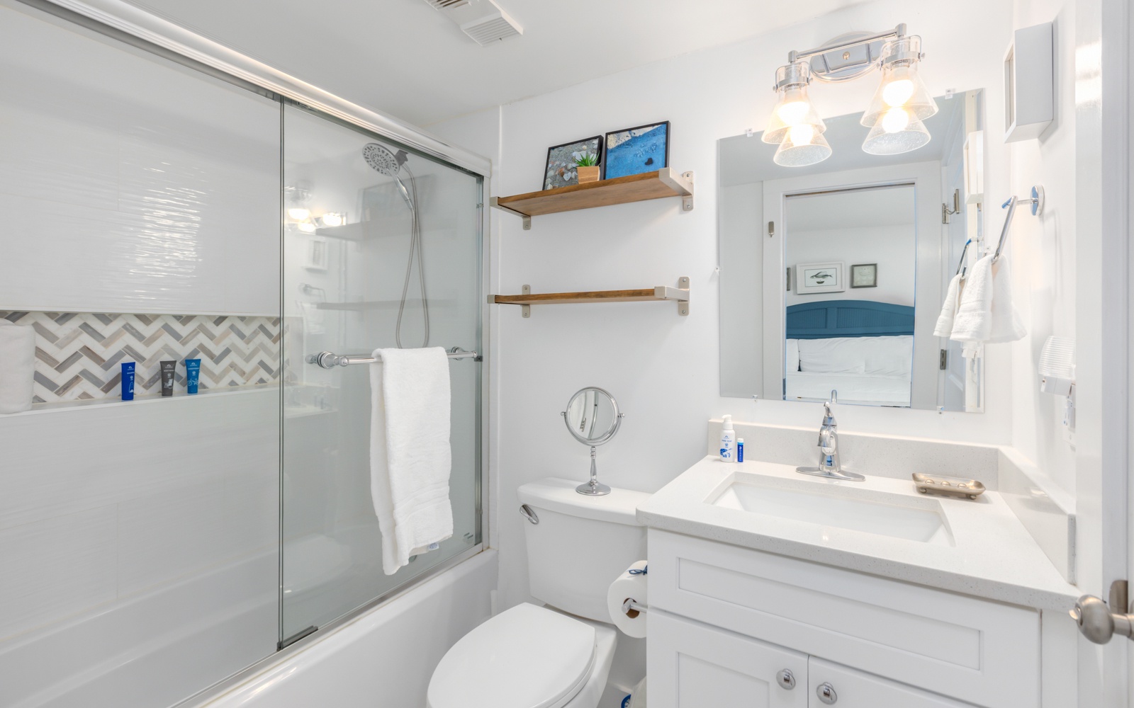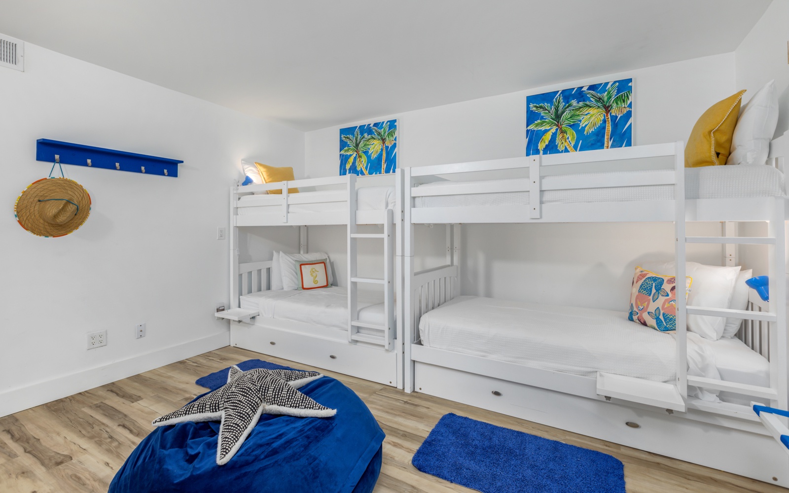 Down the hall, there’s a charming bunk room with 4 twin beds and 2 trundles that kids will adore. The third bedroom is a guest room, king, with its own private bath and, of course, more wonderful views.