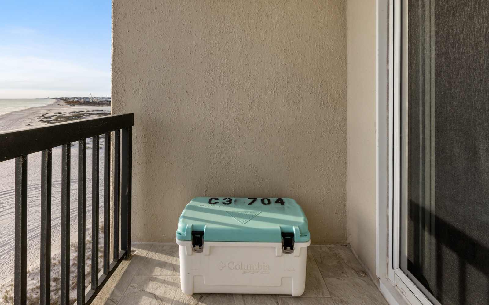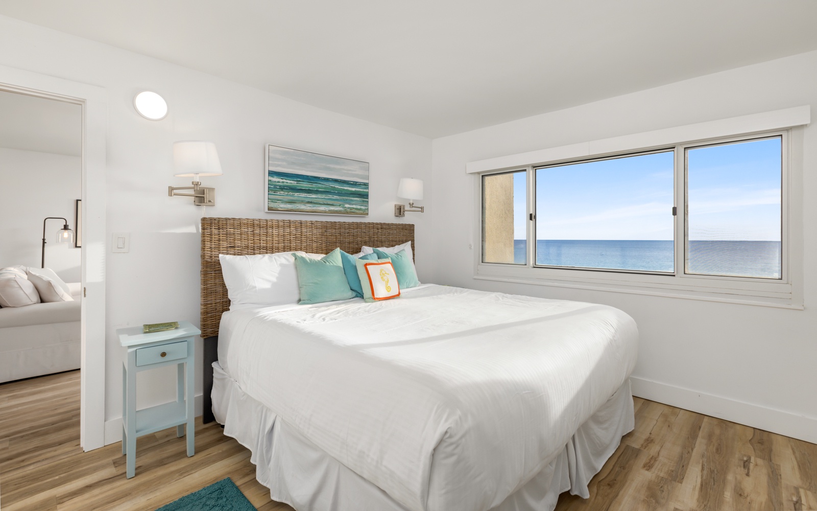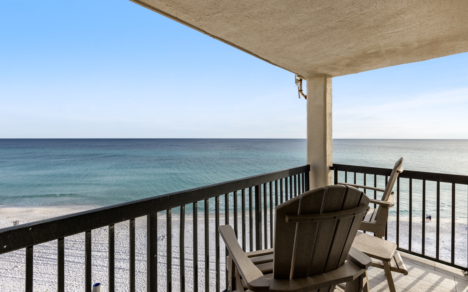 The sliding doors lead to a spacious balcony with sweeping views from Panama City Beach to Destin. As an end unit, it offers a rare glimpse of Camp Helen State Park and its quiet, expansive beaches—a prime spot to soak in both sunrises and sunsets.