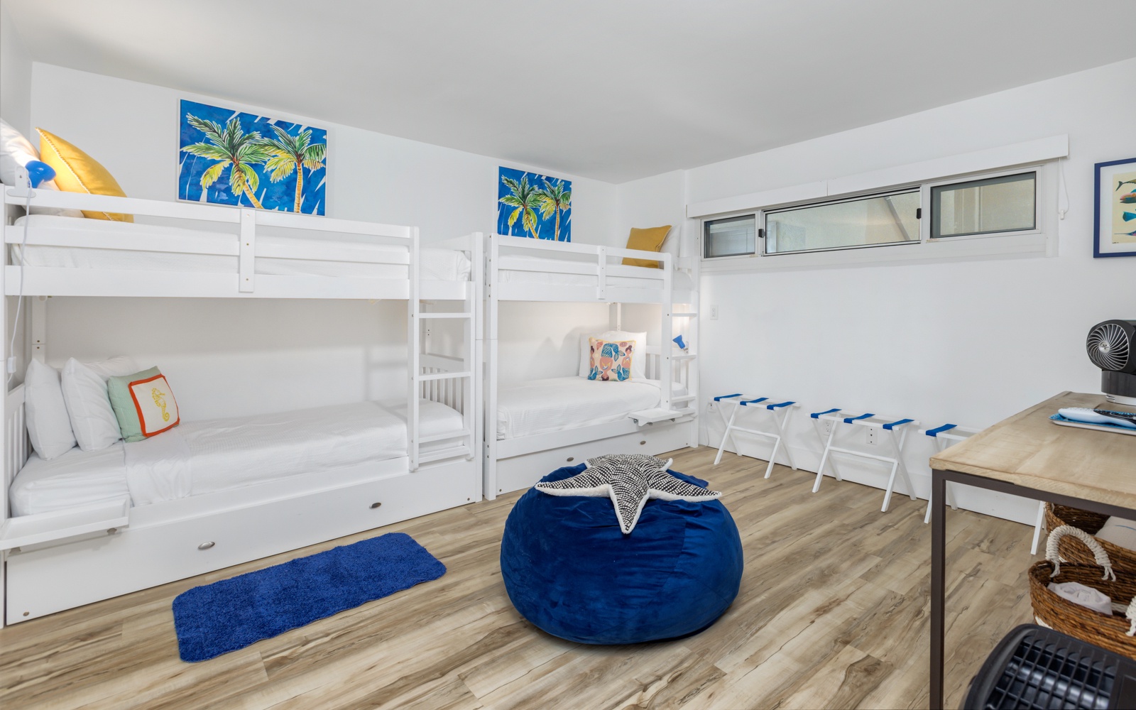 - Bunk room with 4 twin beds and 2 twin trundles; private bath;