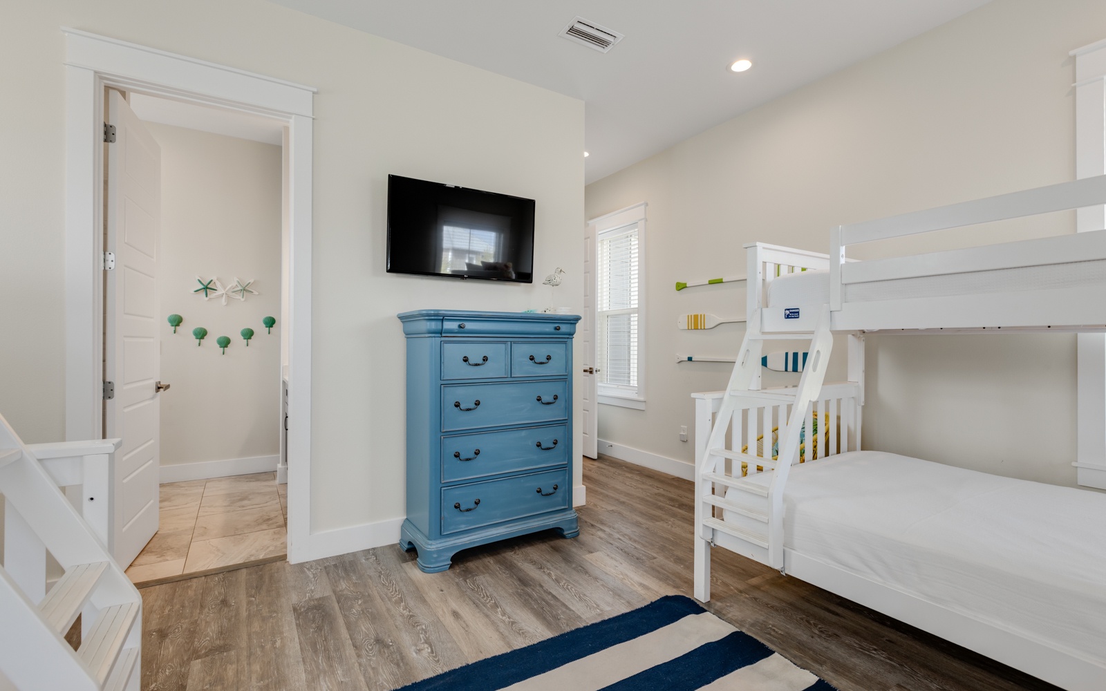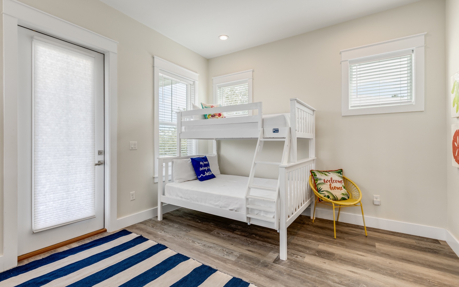 e. Kids fun bunkroom with two sets of bunkbeds (single over double, sleeps 3) & private, ensuite bath with dual vanity. This bedroom also offers a private veranda.