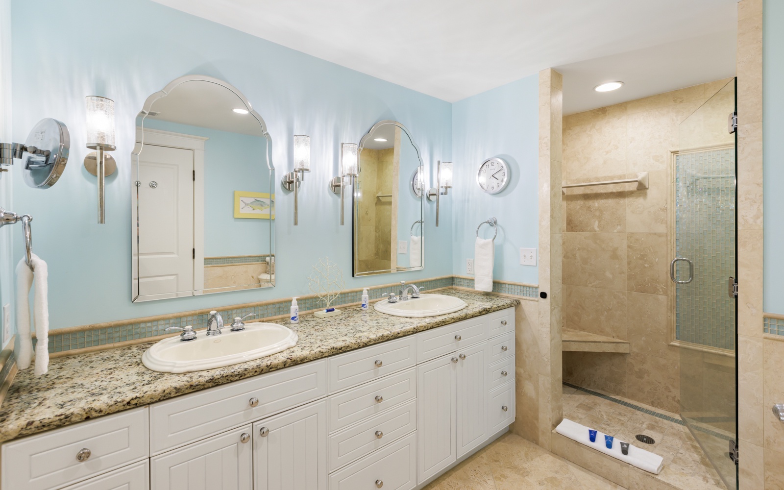 These views can also be seen from the second-floor primary bedroom, with private bathroom and TV.